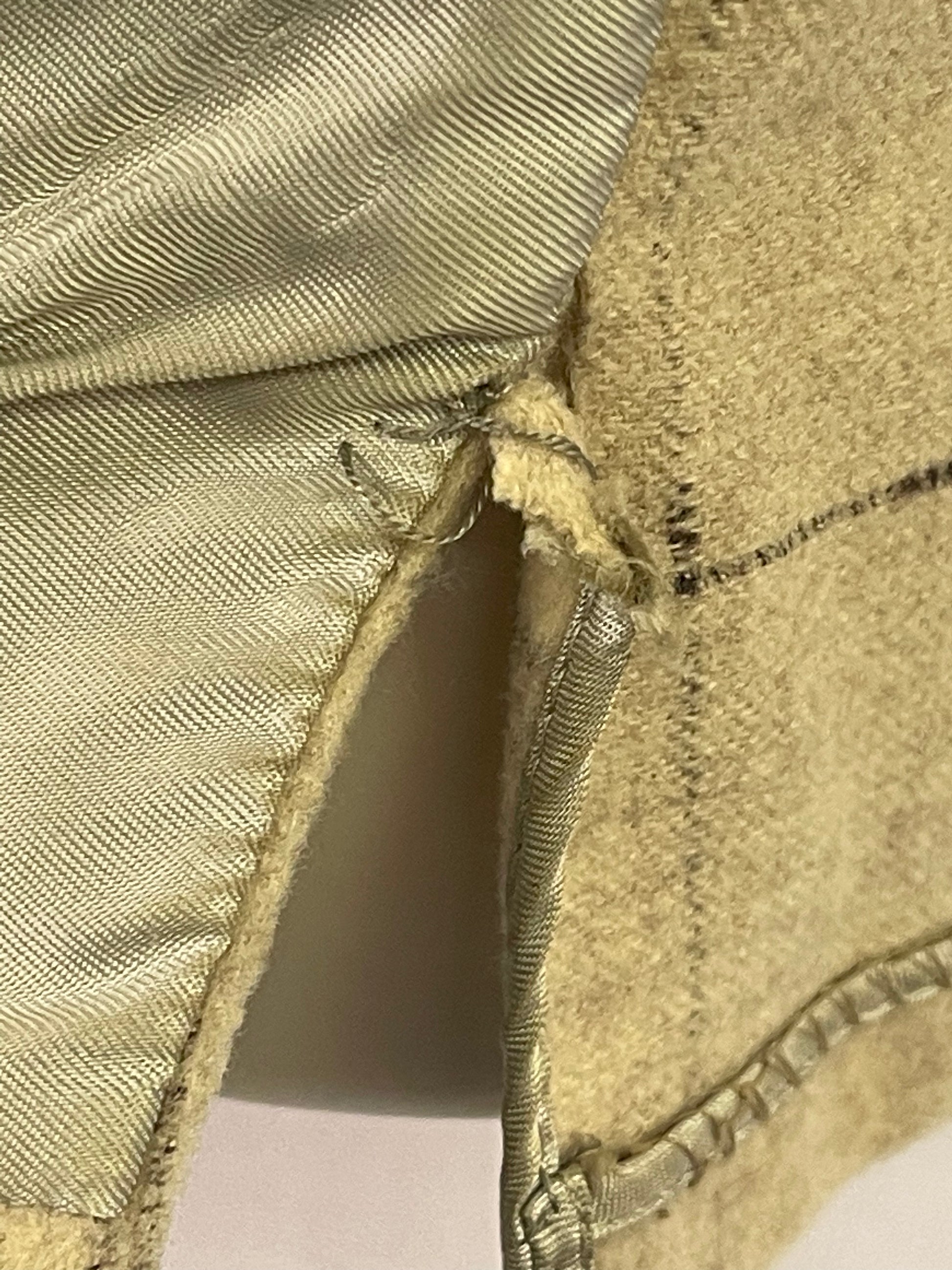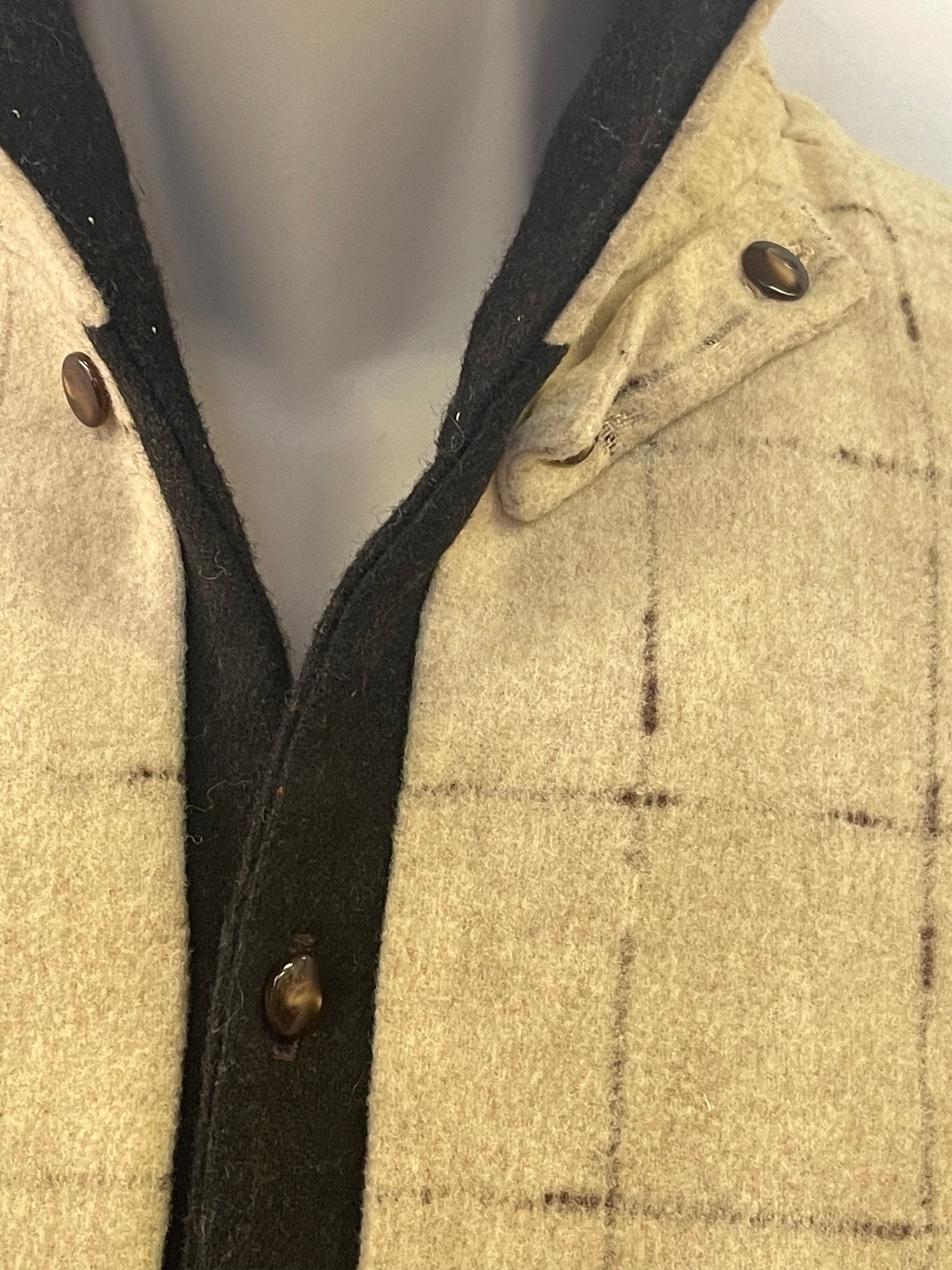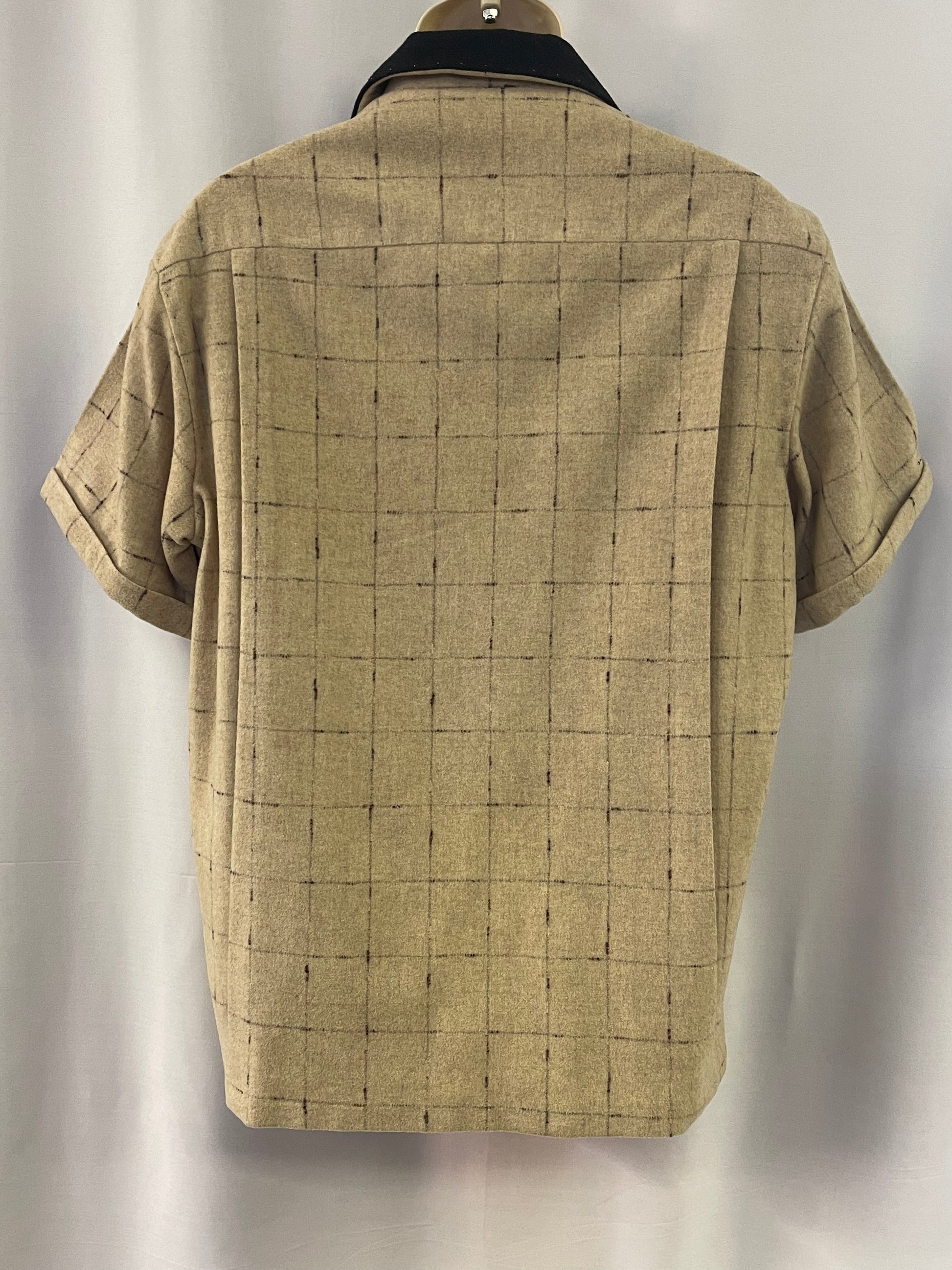 50s Wool Pullover Shirt Men's L. Very unique men’s 50s shirt. Features short sleeves, tan with brown pattern, brown collar and pocket flaps with contrasting thread, and full front lining. It’s in very good condition with just a small seam separation/hole at the bottom of one side seam and some inside collar discoloration. There is also small areas where the fabric has rubbed. You cannot notice these while wearing. Chest 48” Shoulder 20” Length 29” |