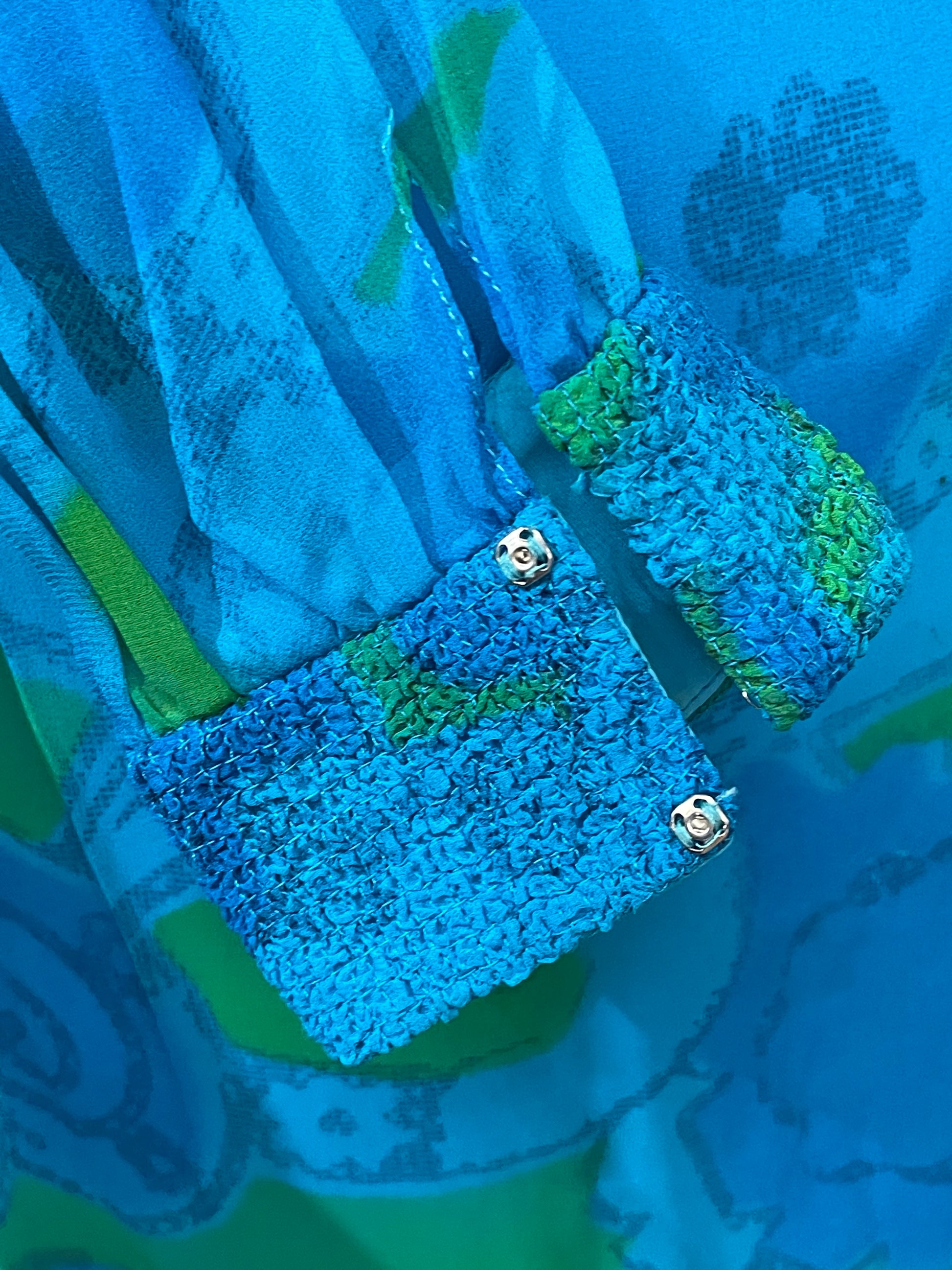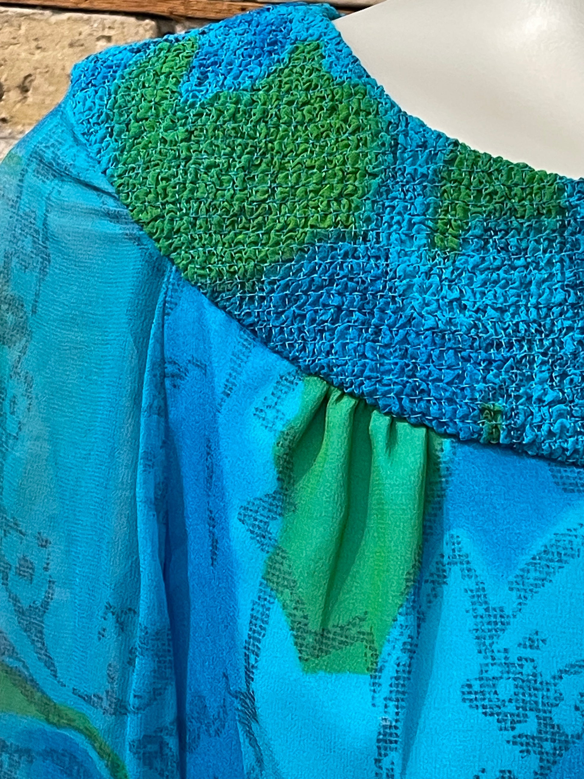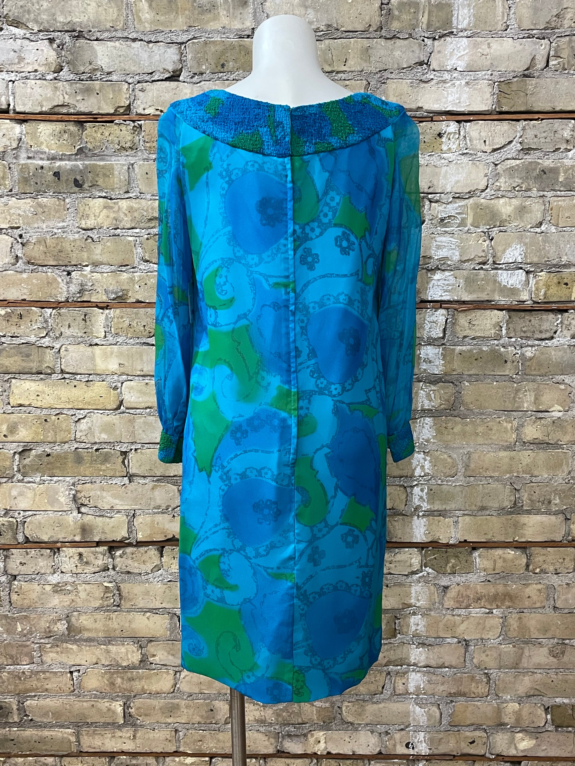 Elevate your wardrobe with our 60s Blue Shift Dress. The vibrant blue color, paired with mod style and sheer sleeves, makes for an eye-catching and elegant piece. Its decorative collar and cuffs add a sophisticated touch. In excellent condition, with only a few small specks, this dress is a must-have for any fashionista.