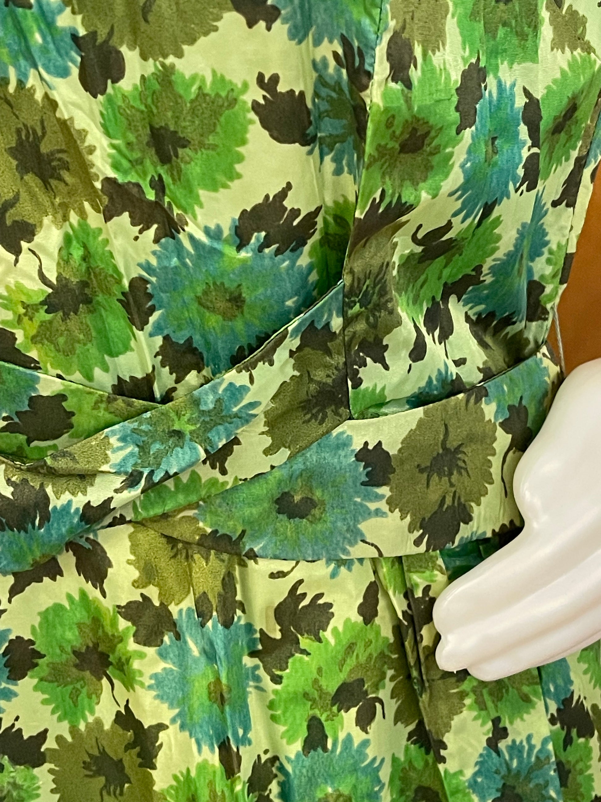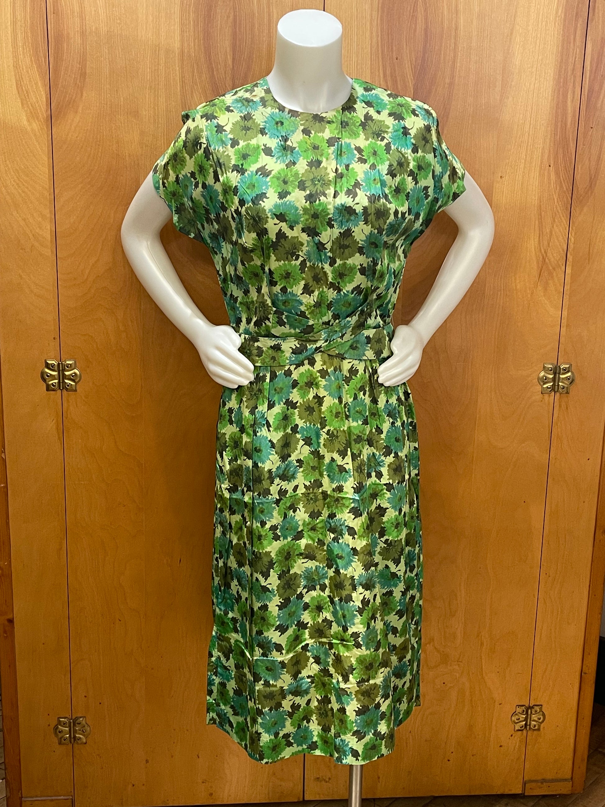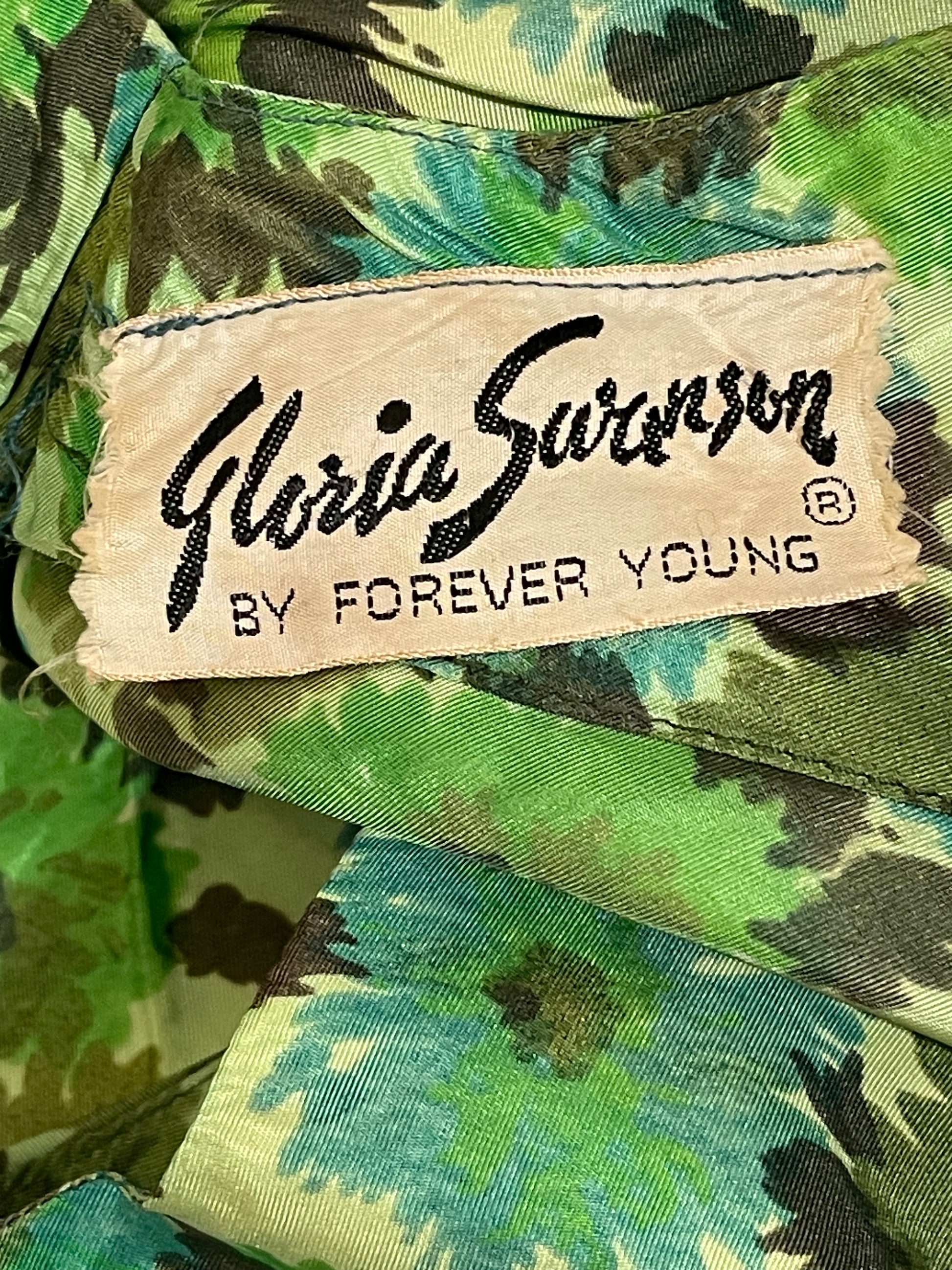 Indulge in timeless elegance with our 50s Gloria Swanson for Forever Young Silk Floral Dress. This classic piece features a cross cross front affixed belt, flattering every curve. The vibrant colors add a touch of luxury, making it the perfect addition to your wardrobe. Elevate your style game with this sophisticated and exclusive dress.