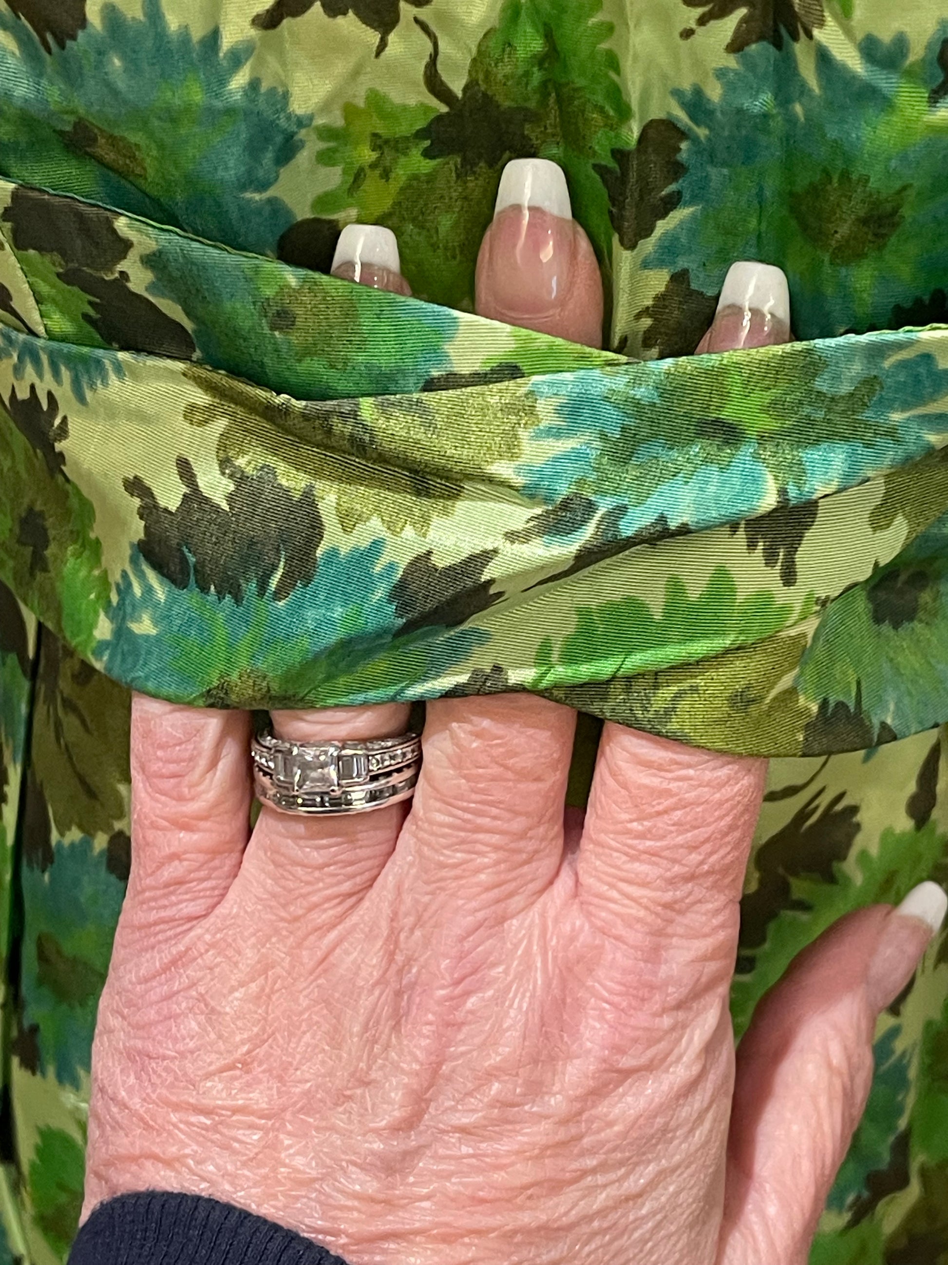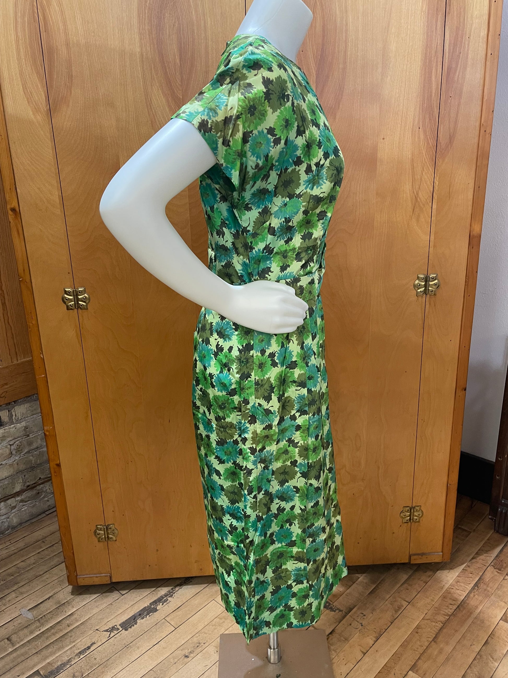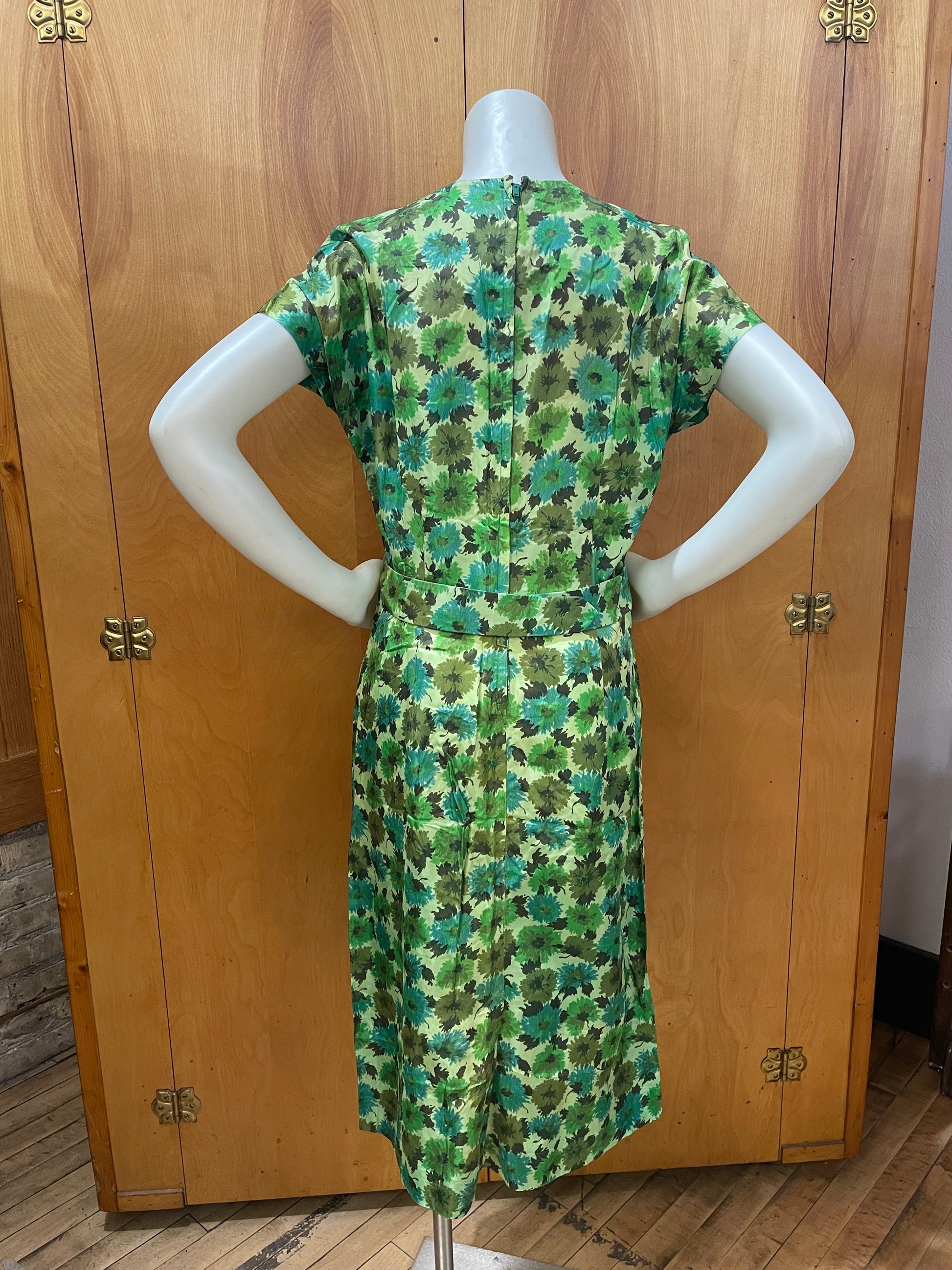Indulge in timeless elegance with our 50s Gloria Swanson for Forever Young Silk Floral Dress. This classic piece features a cross cross front affixed belt, flattering every curve. The vibrant colors add a touch of luxury, making it the perfect addition to your wardrobe. Elevate your style game with this sophisticated and exclusive dress.