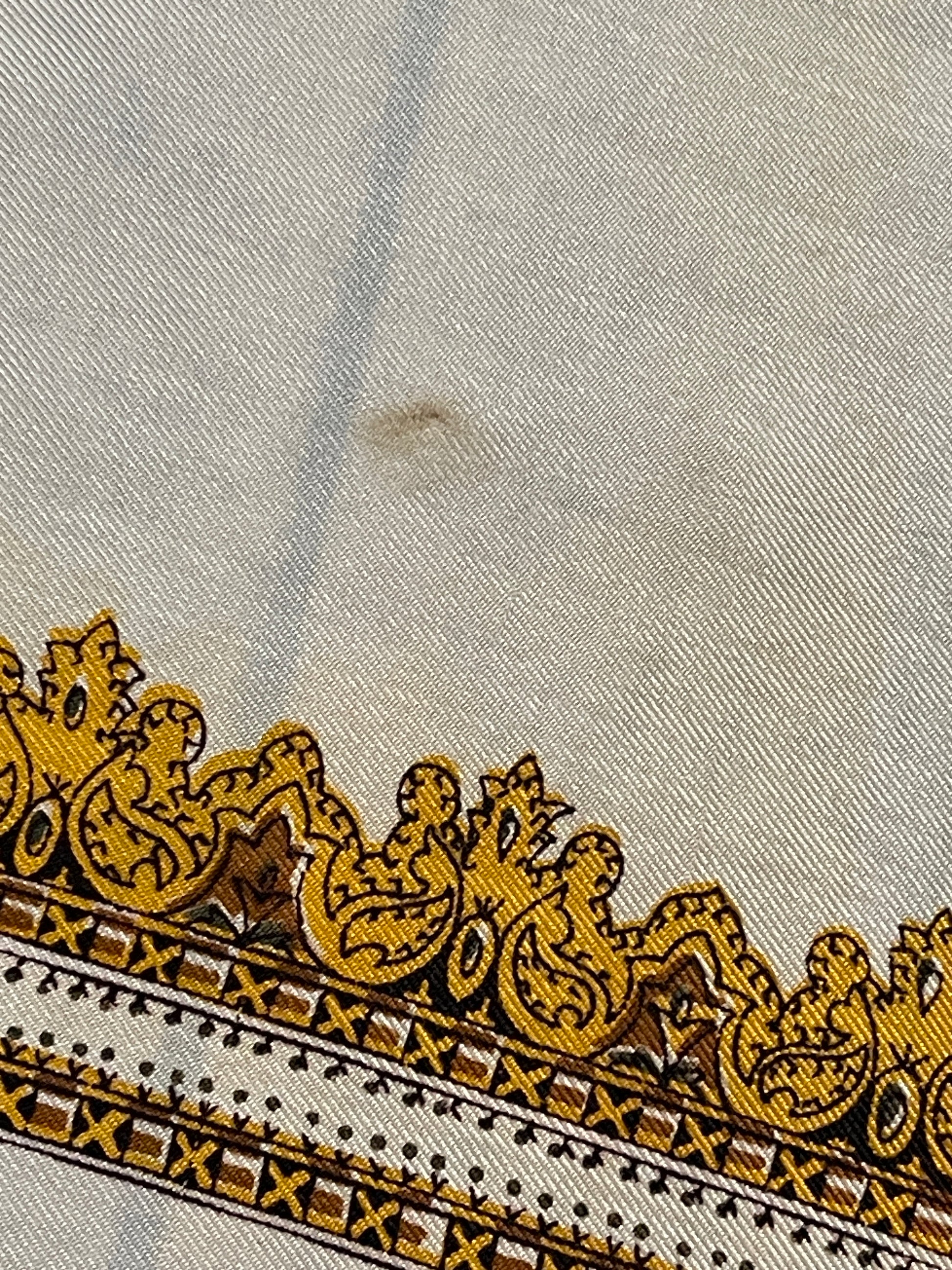 Wrap yourself in the vibrant history of the 70s with our Twill Scarf featuring a stunning Mandela motif in gold and green on a crisp white background. Despite minor stains, this scarf adds an eye-catching and meaningful touch to any outfit. Embrace the energy and inspiration of the 70s with every wear!