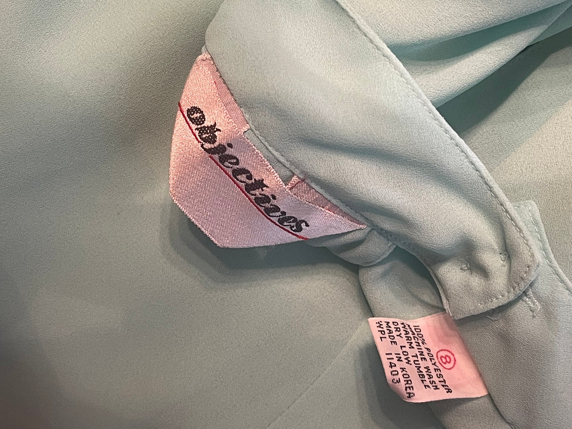 This is an 1/2 sleeve 80s career style blouse in the ever popular aqua color. The front features pleats and a high neckline that has 2 buttons at the nape of the neck.