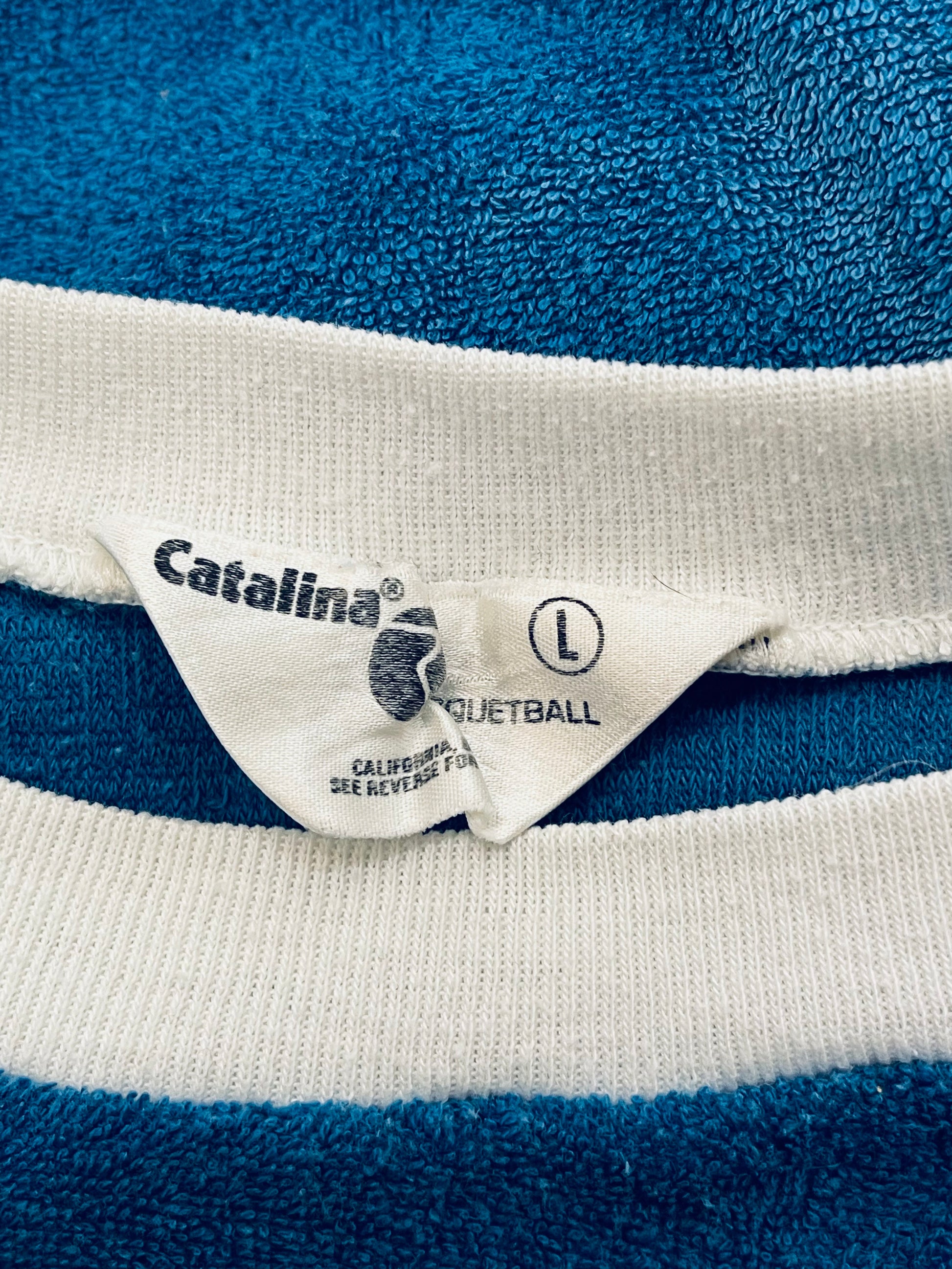 "The 80s Racketball Shirt is crafted with soft terry cloth fabric, providing comfort and breathability during any game. Featuring a bold blue and white design and a prominent Racketball logo, this shirt is perfect for any avid player looking for both style and function."