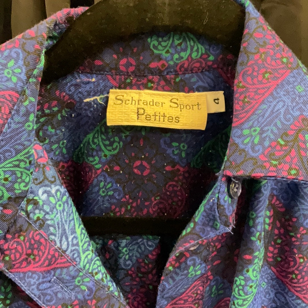 Green, blue, black & purple make up this fun dress featuring a matching tie belt. Buttons up halfway in the front and at cuffs. Very good vintage condition. Labeled Schroeder Sport Petites vintage size 4