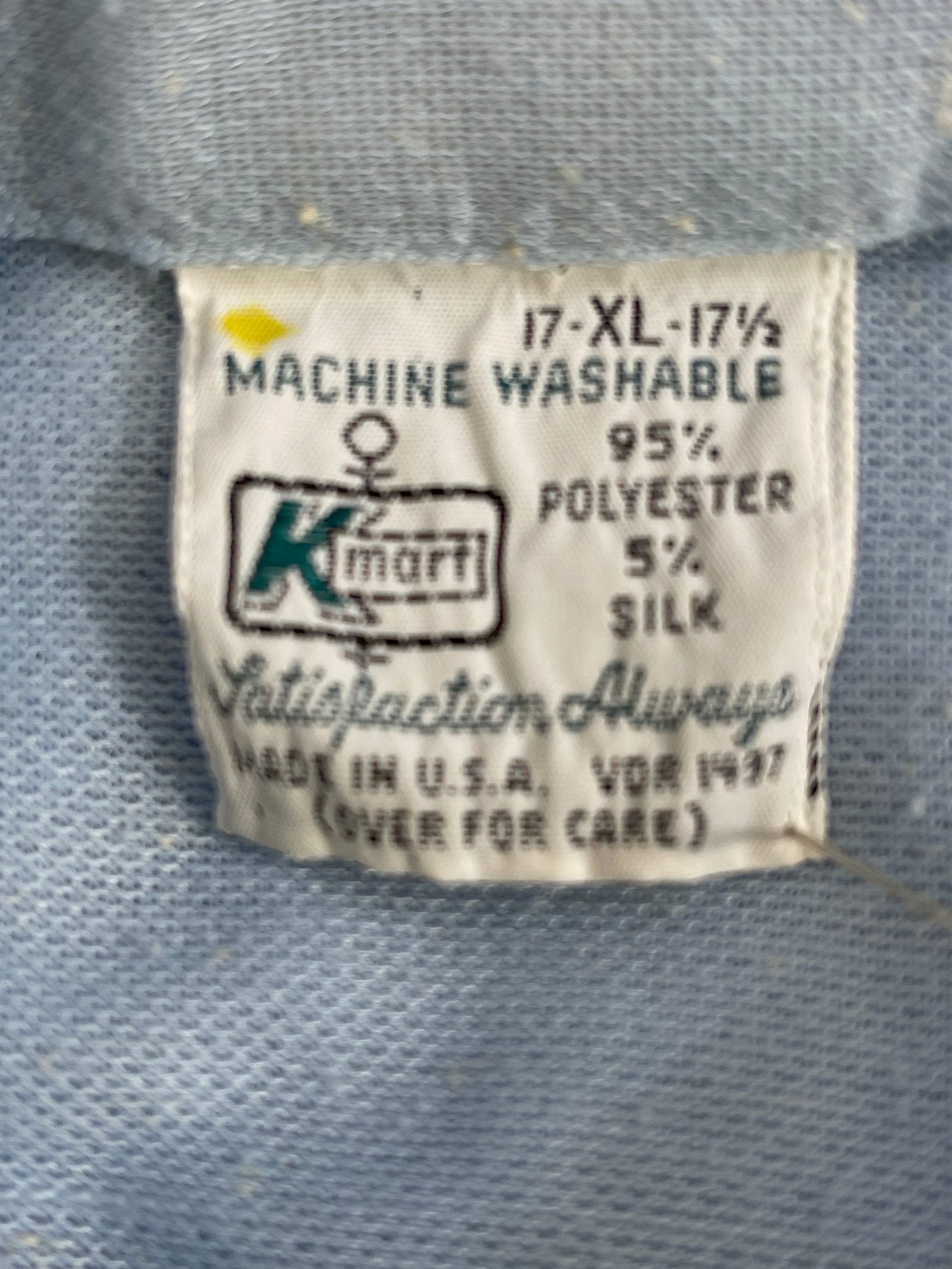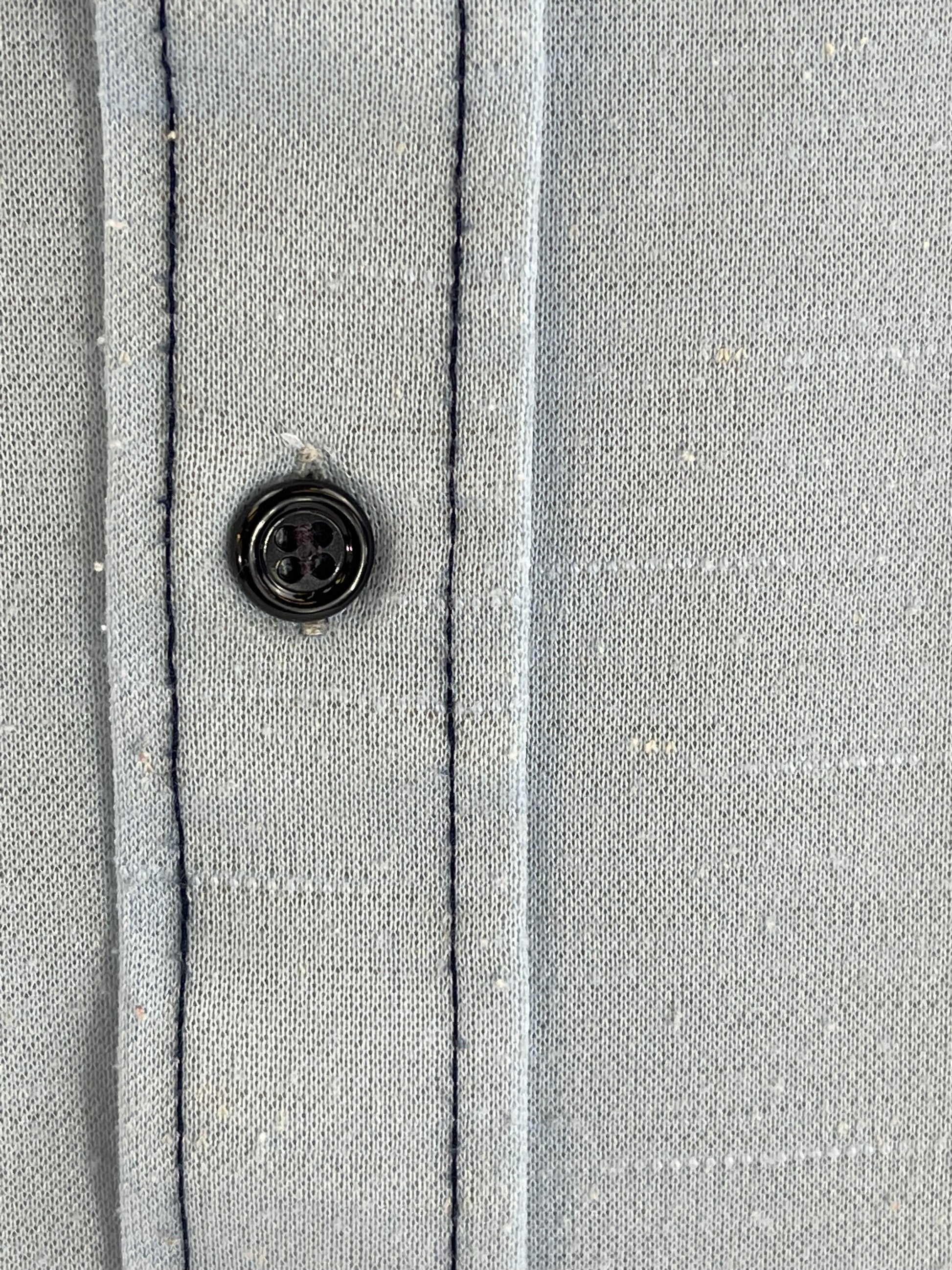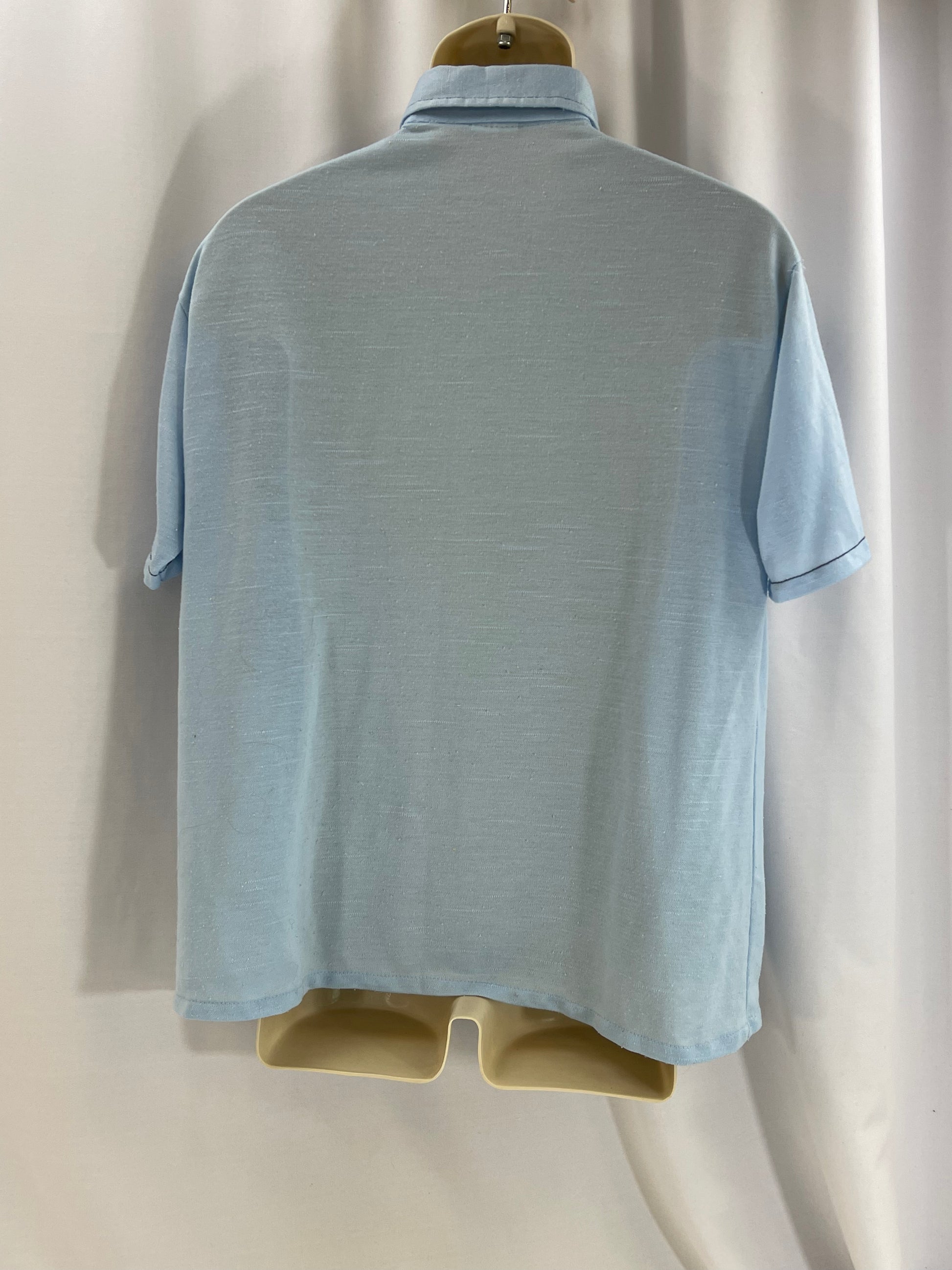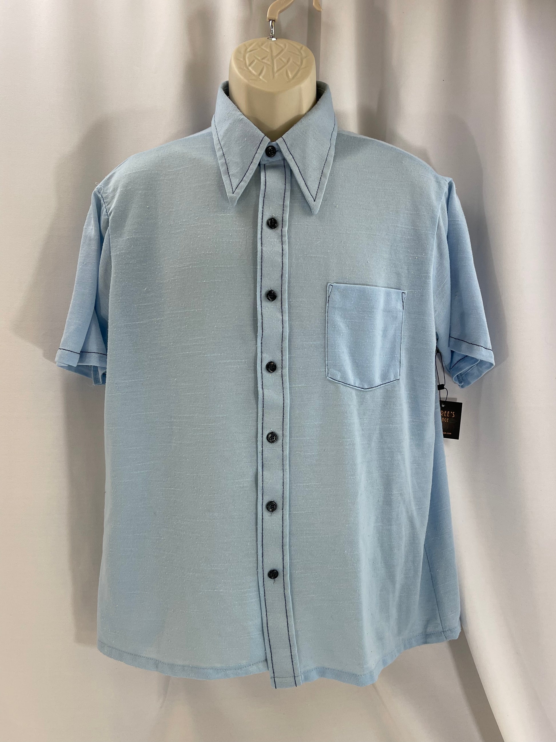 Check out this K-Mart brand short sleeve casual shirt! Its a textured light blue with navy trim and has the most glorious dagger collar!
