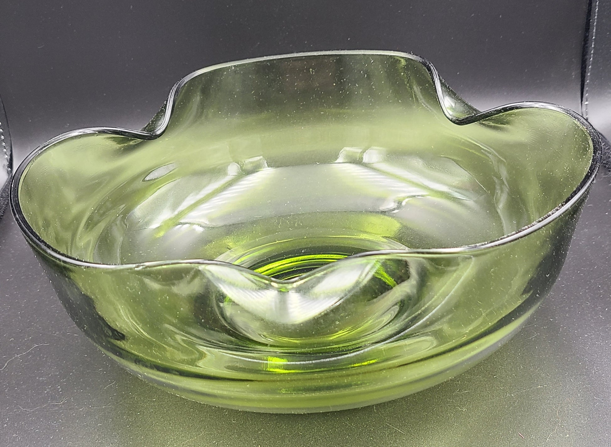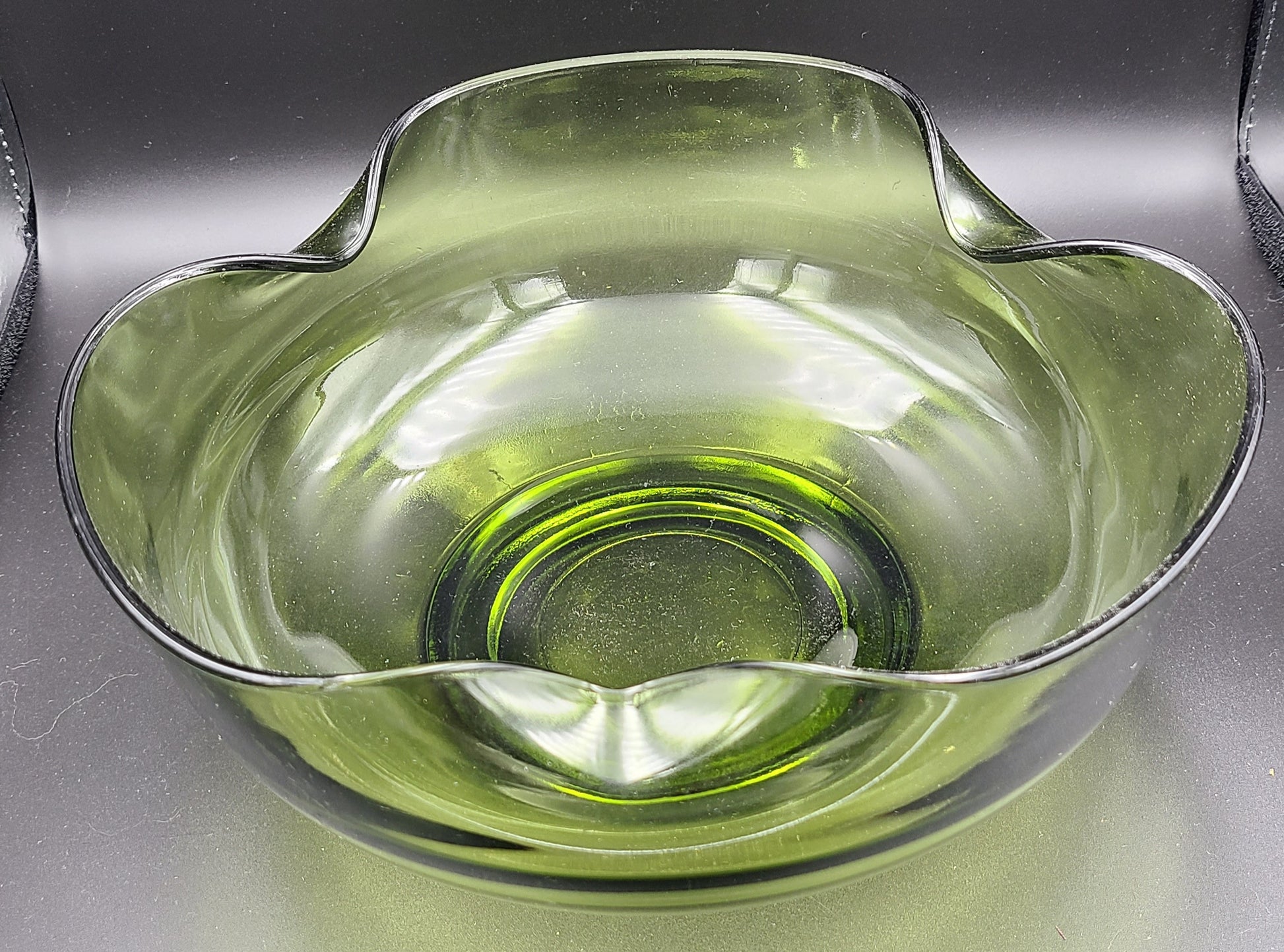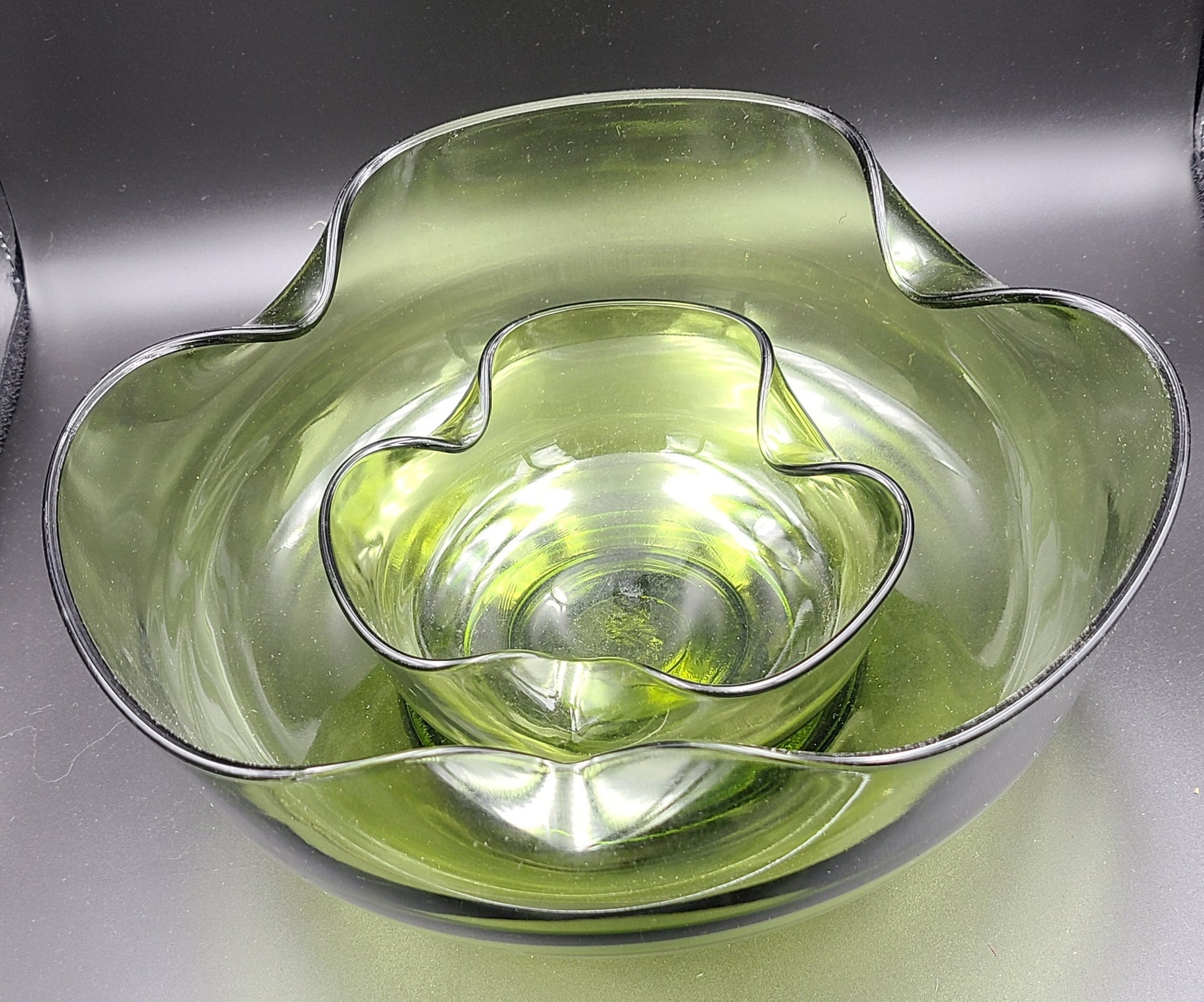Set of two green glass bowls perfect for a chip and dip. Wavy edge on the top of the glass.
