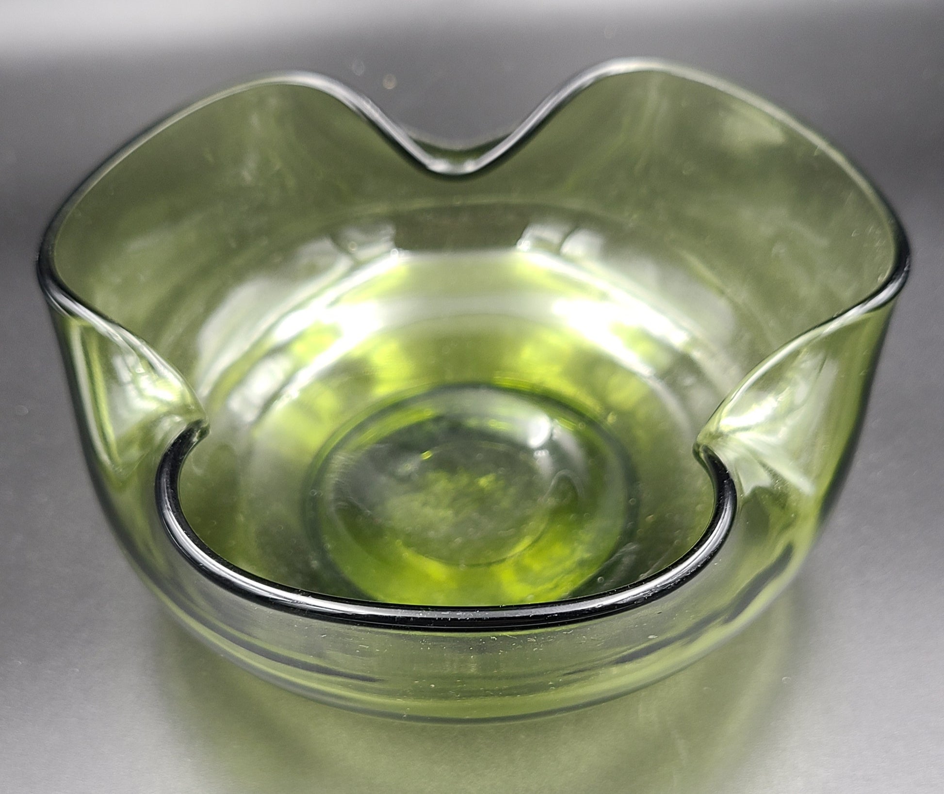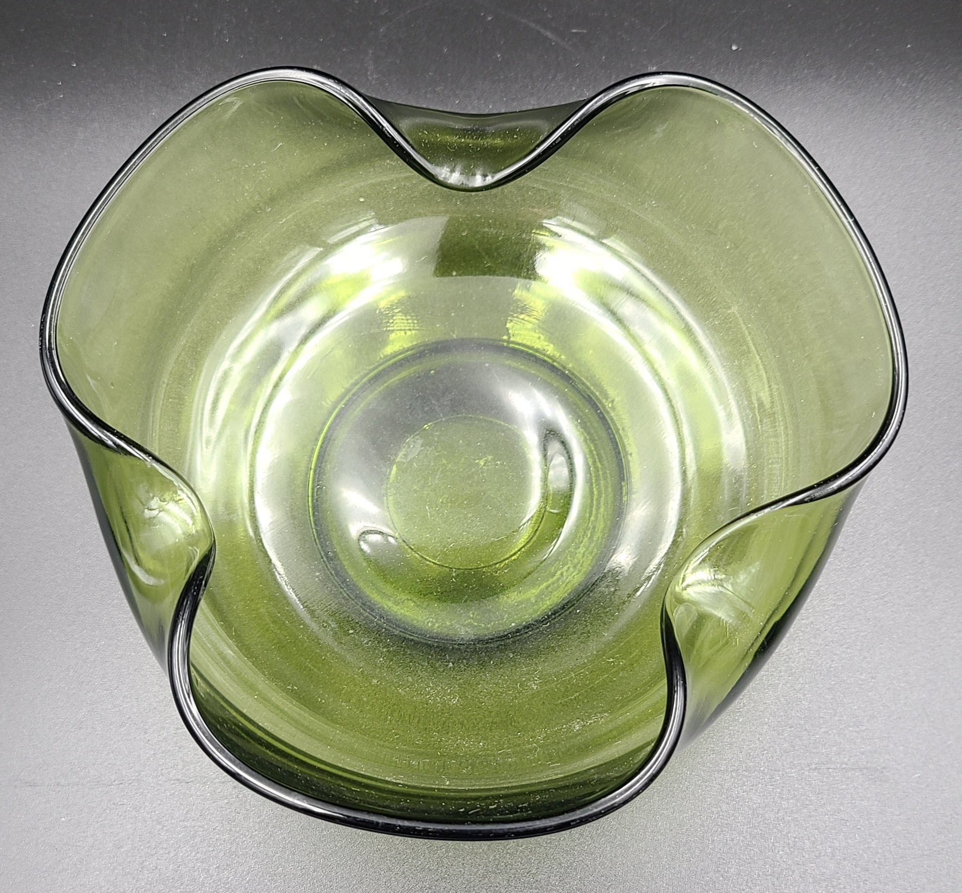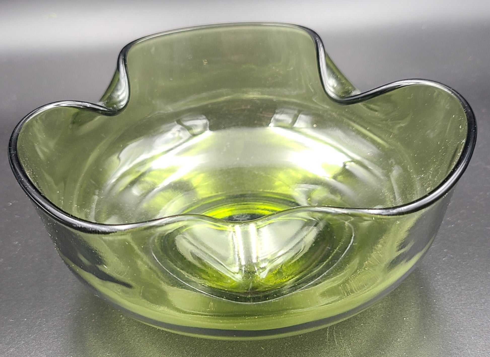 Set of two green glass bowls perfect for a chip and dip. Wavy edge on the top of the glass.