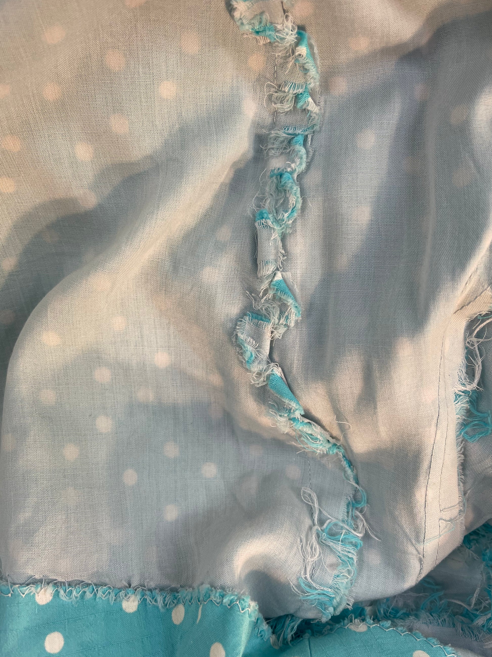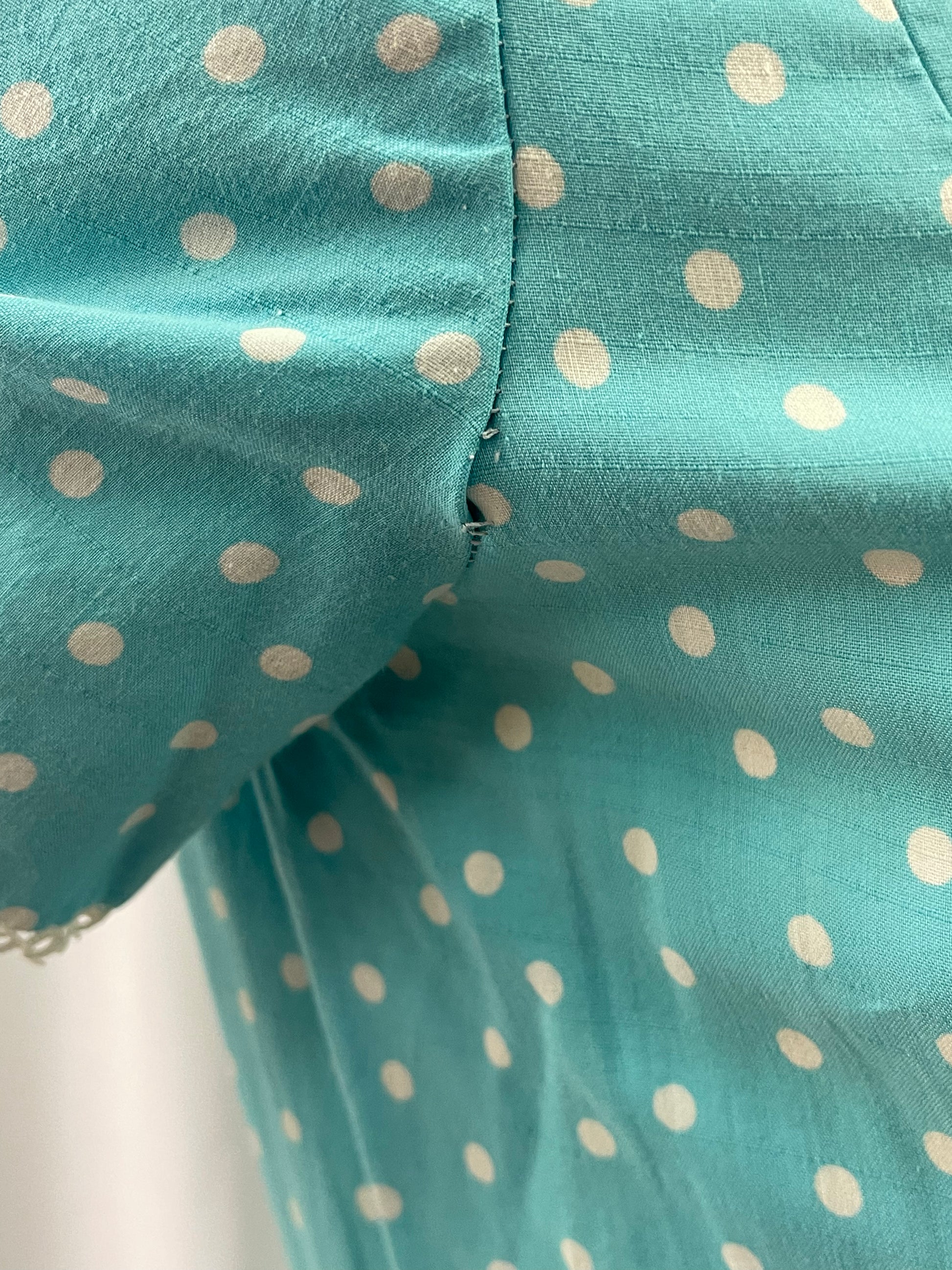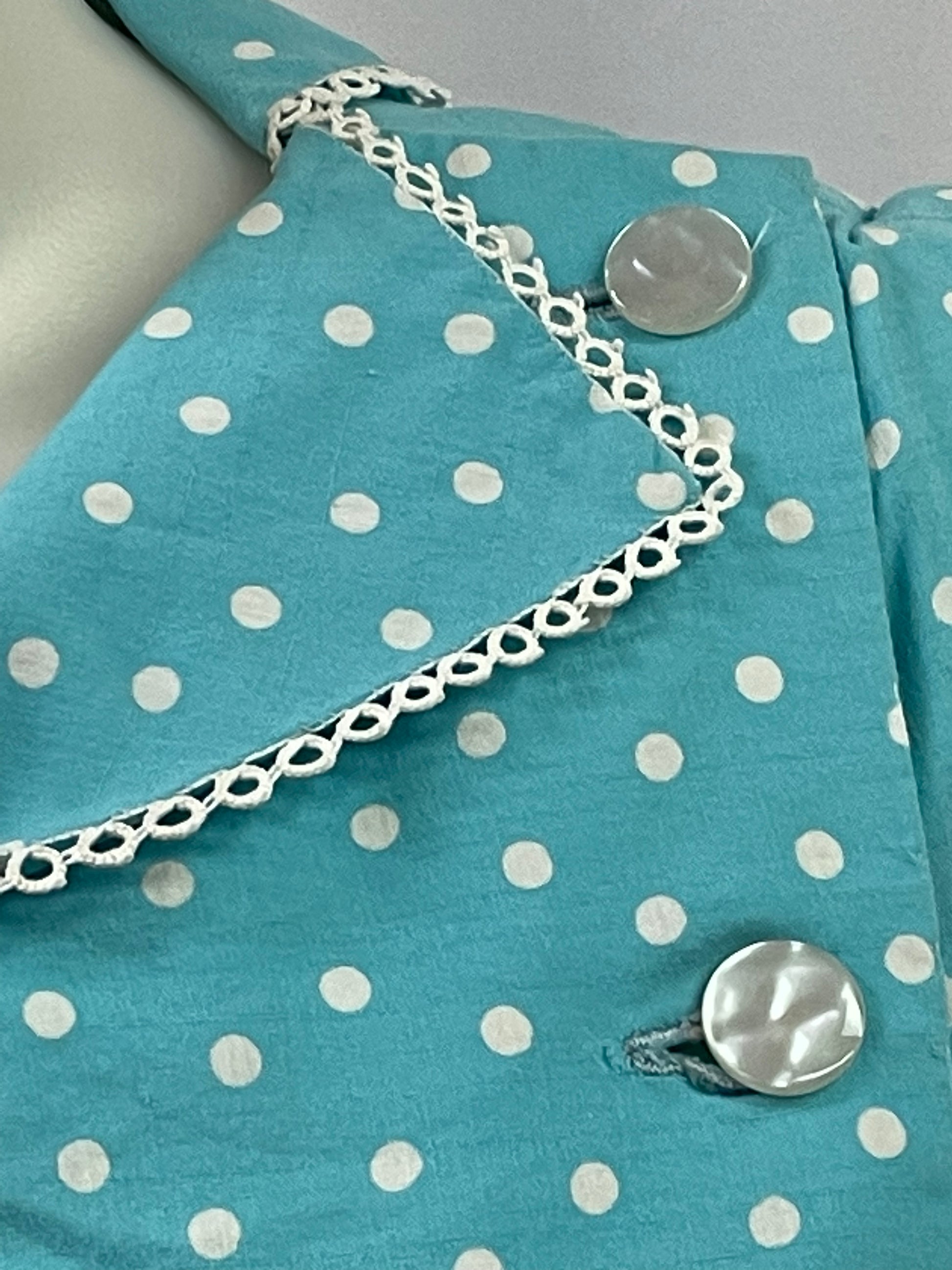 How fun is this cotton day dress? Teal with white polka dots and cute round trim. It buttons all the way up the front left side (bottom one is missing) to the shoulder. It is difficult to date as it appears homemade with no labels. It has a 40s style to it but the interfacing on the button side is in a bit too good of condition Other than a small seam separation, it’s in very good condition.
