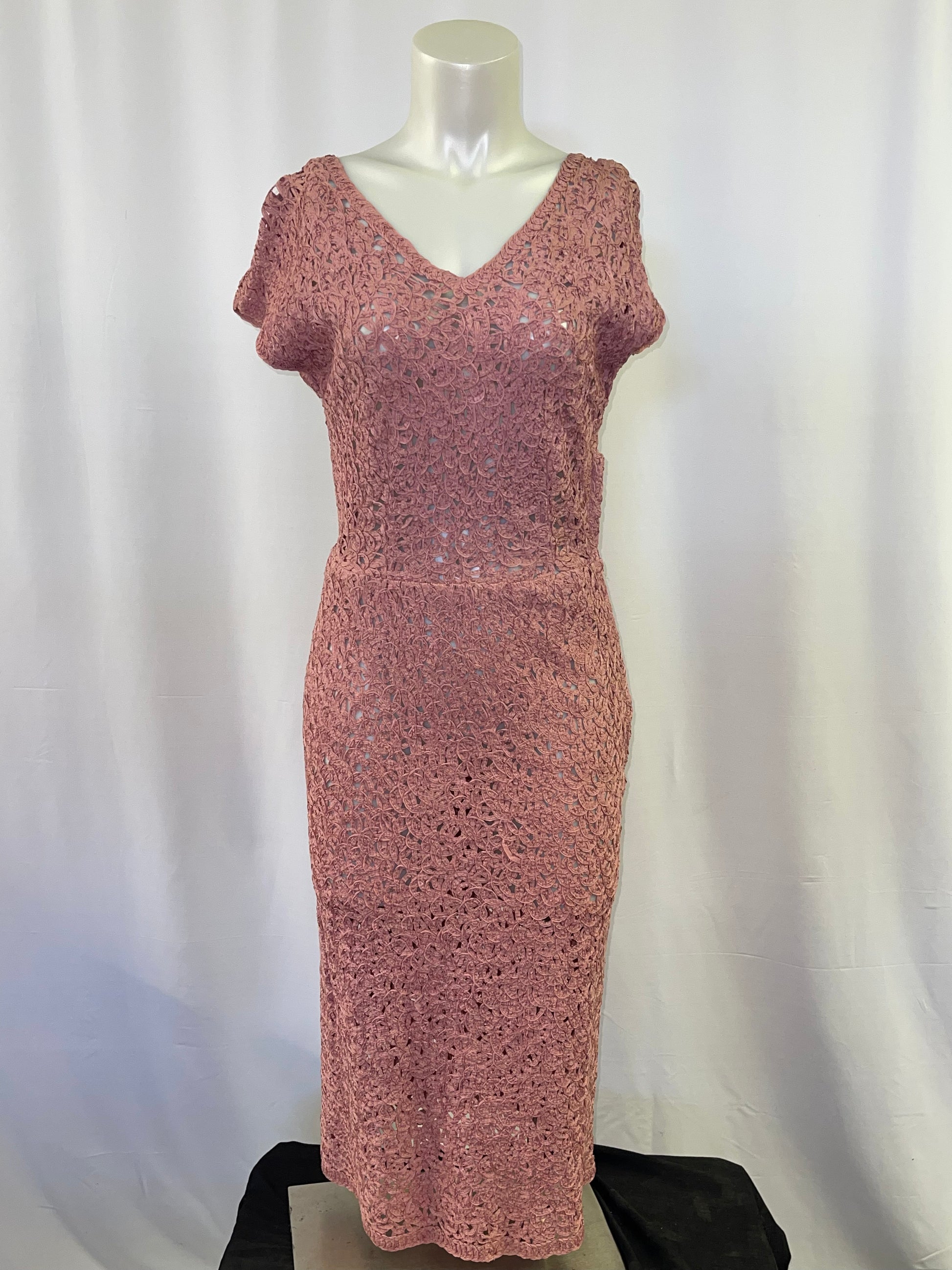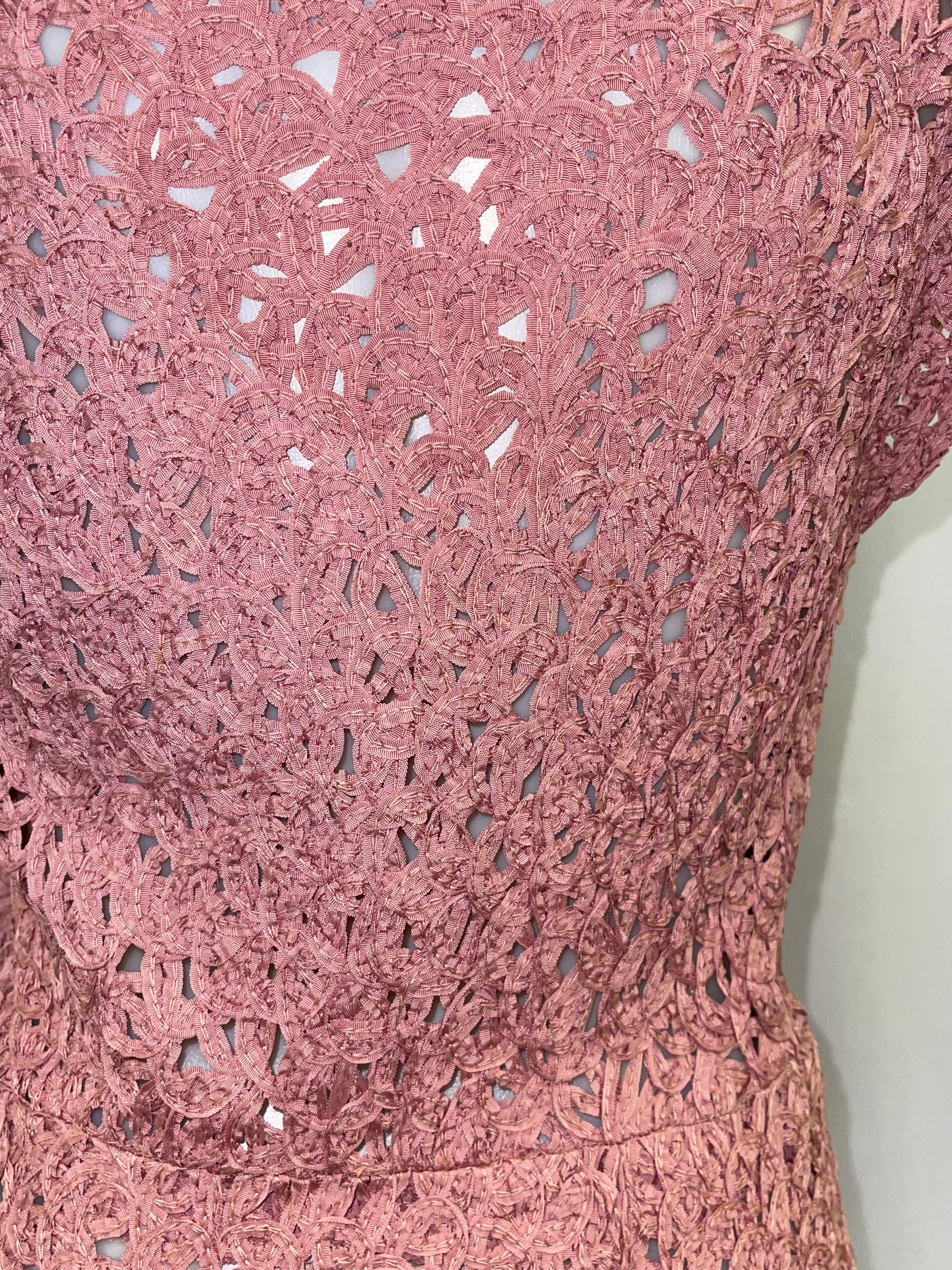 Rose pink colored ribbon dress with a side zipper and cap sleeves. The dress is made of small circular shapes all individually interlocked and stitched together by matching pink thread. A tighter pattern is stitched around the plunging neckline shape.
