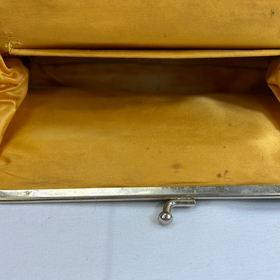8”x 4” black floral brocade clutch. Gold blue and green floral pattern. Lined in in orange satin with a gold latch top and pocket on interior wall. Has some slight wear to the bottom corners, and interior satin is stained.