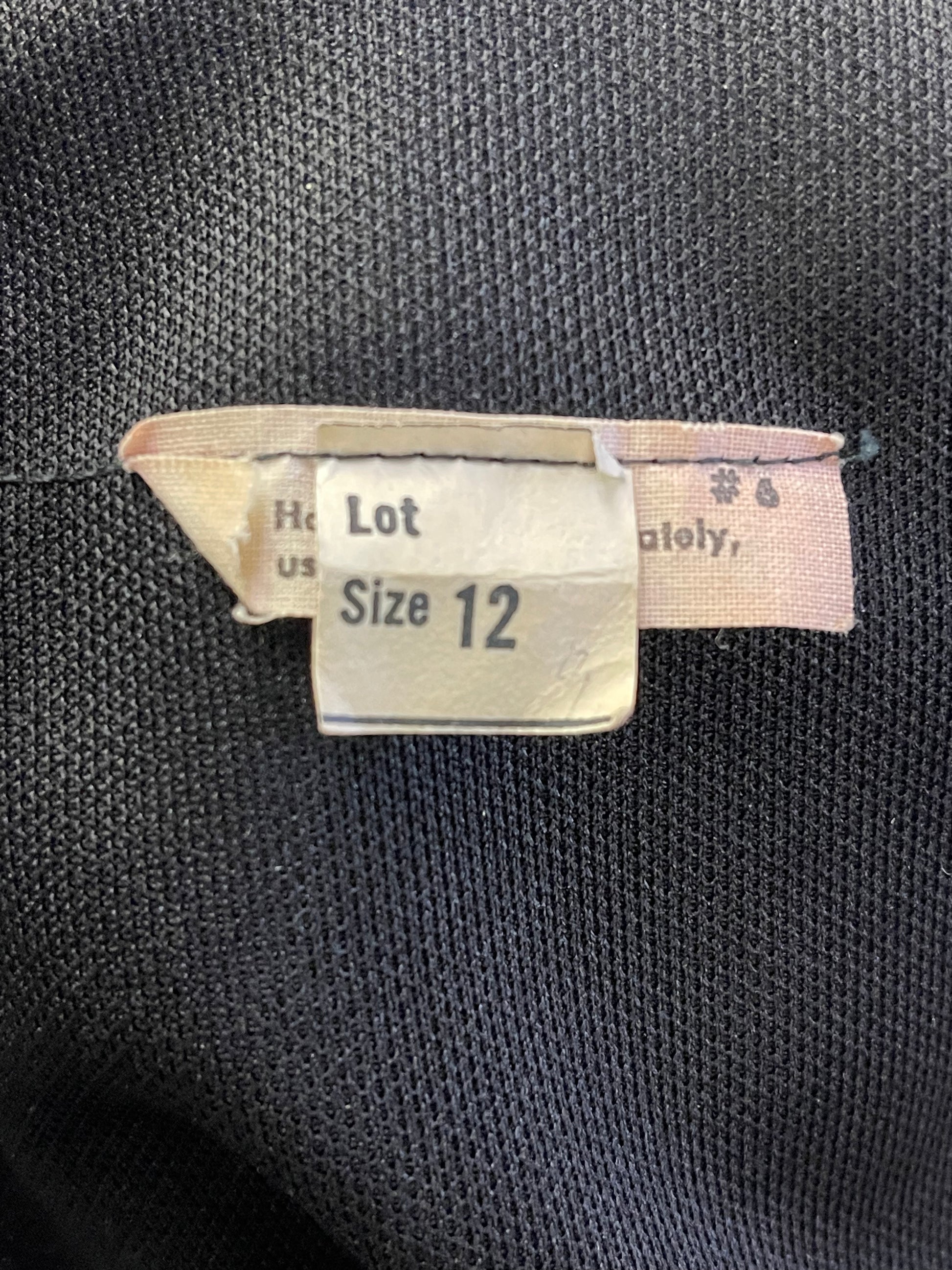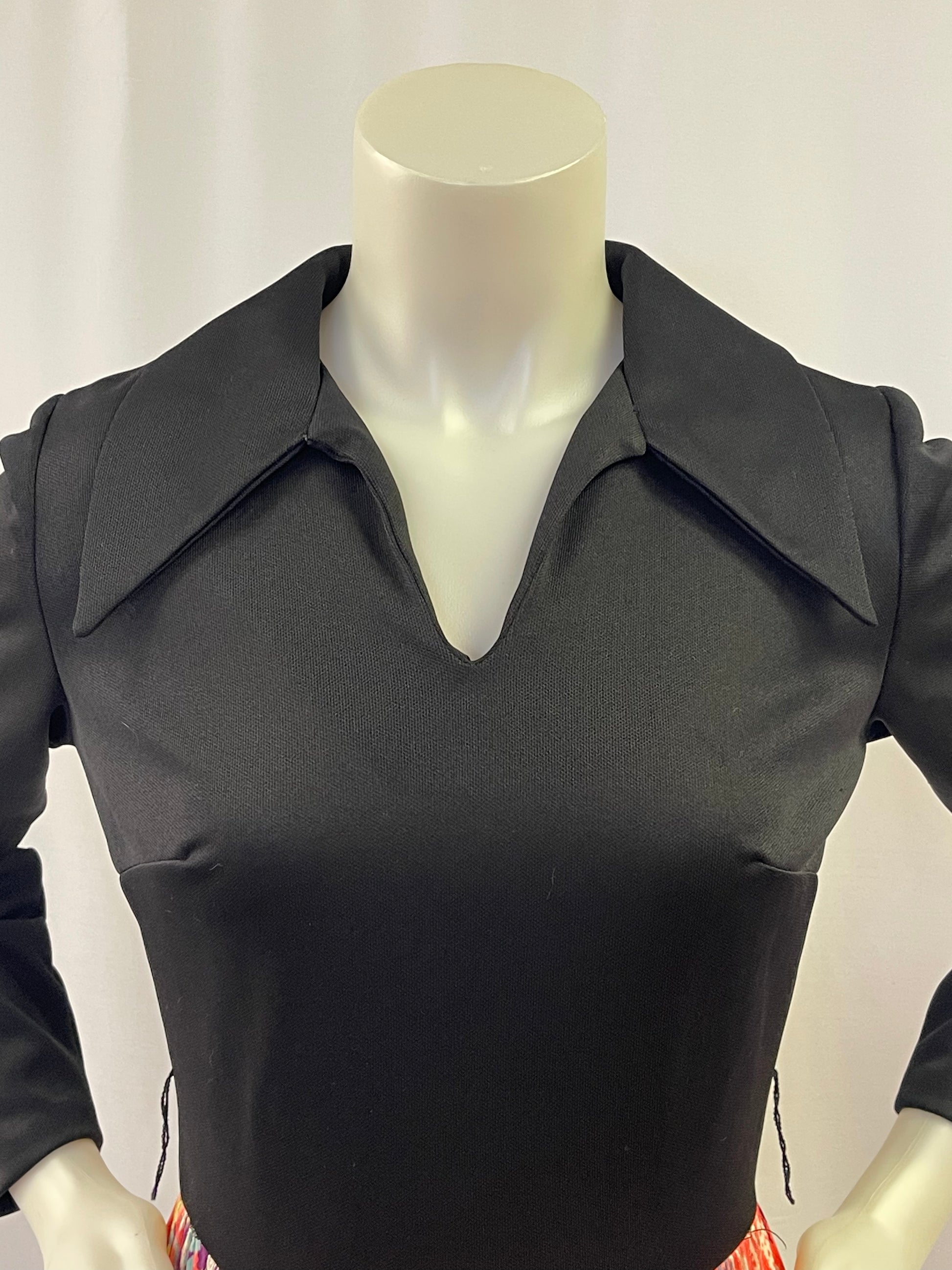 The bodice of this awesome dress features a v neck and dagger collar and the skirt is a groovy blend of purple, white, teal, and pink. It just doesn’t get any more 70s than this dress!