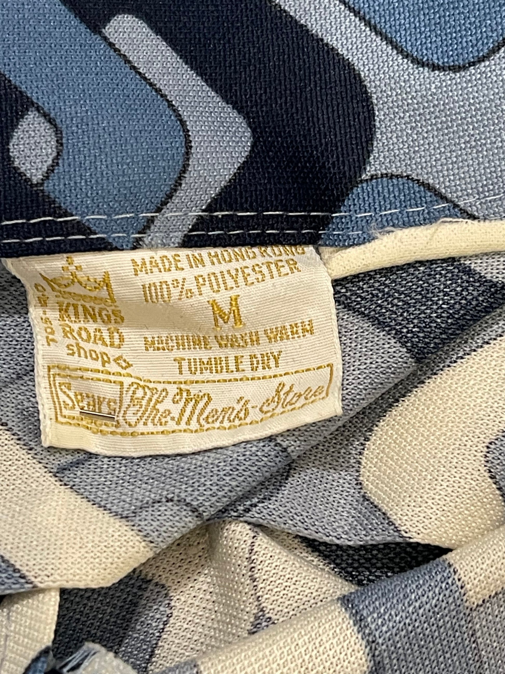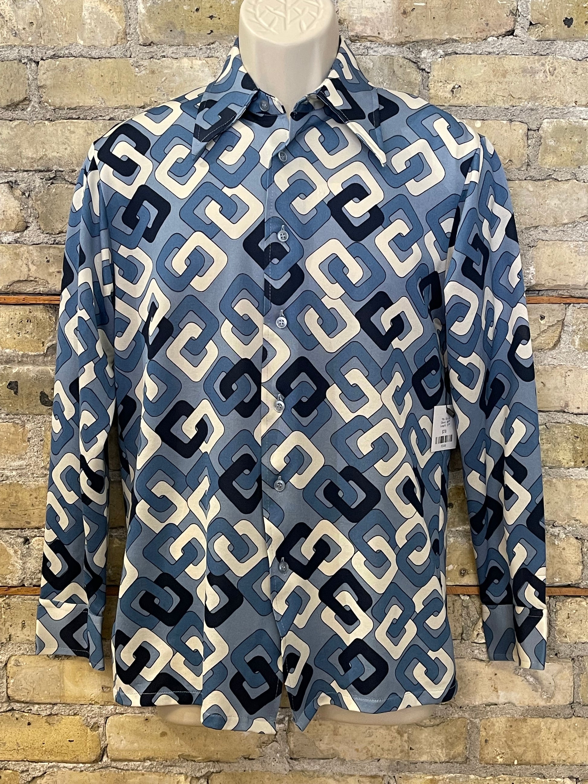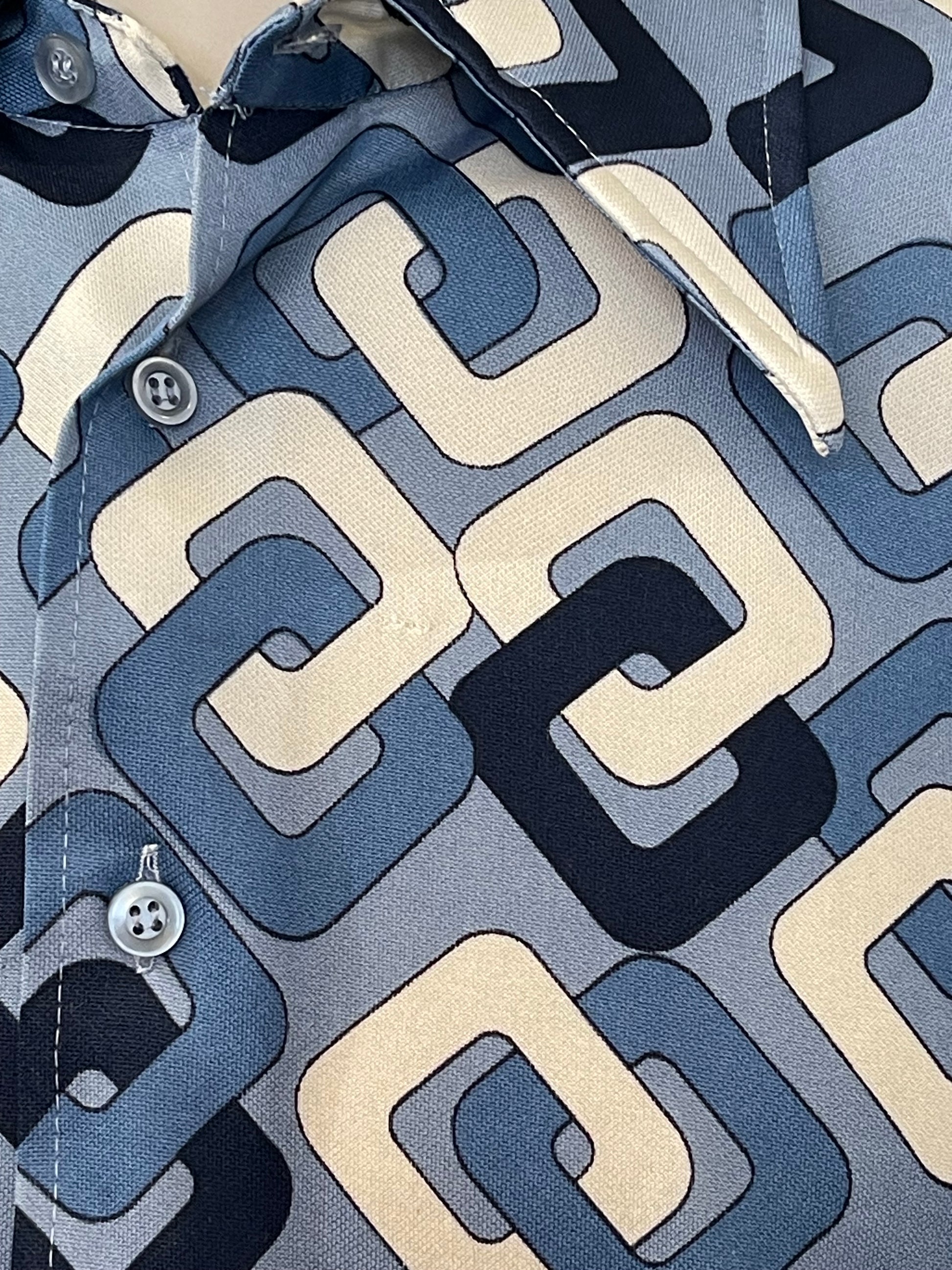 Take bold fashion risks with our Blue Geometric Disco Shirt! Its dagger collar and chain link design will make you stand out on any dance floor. Channel your inner daring spirit with this classic 70s shirt.