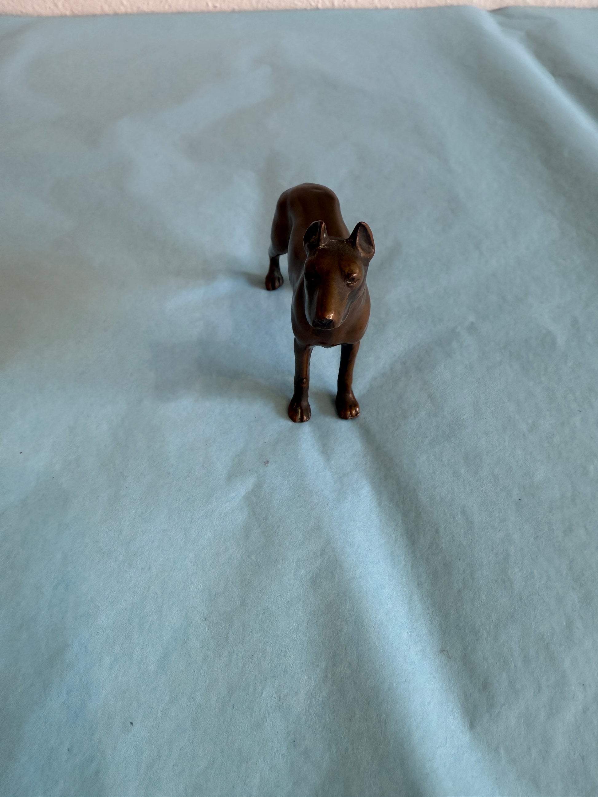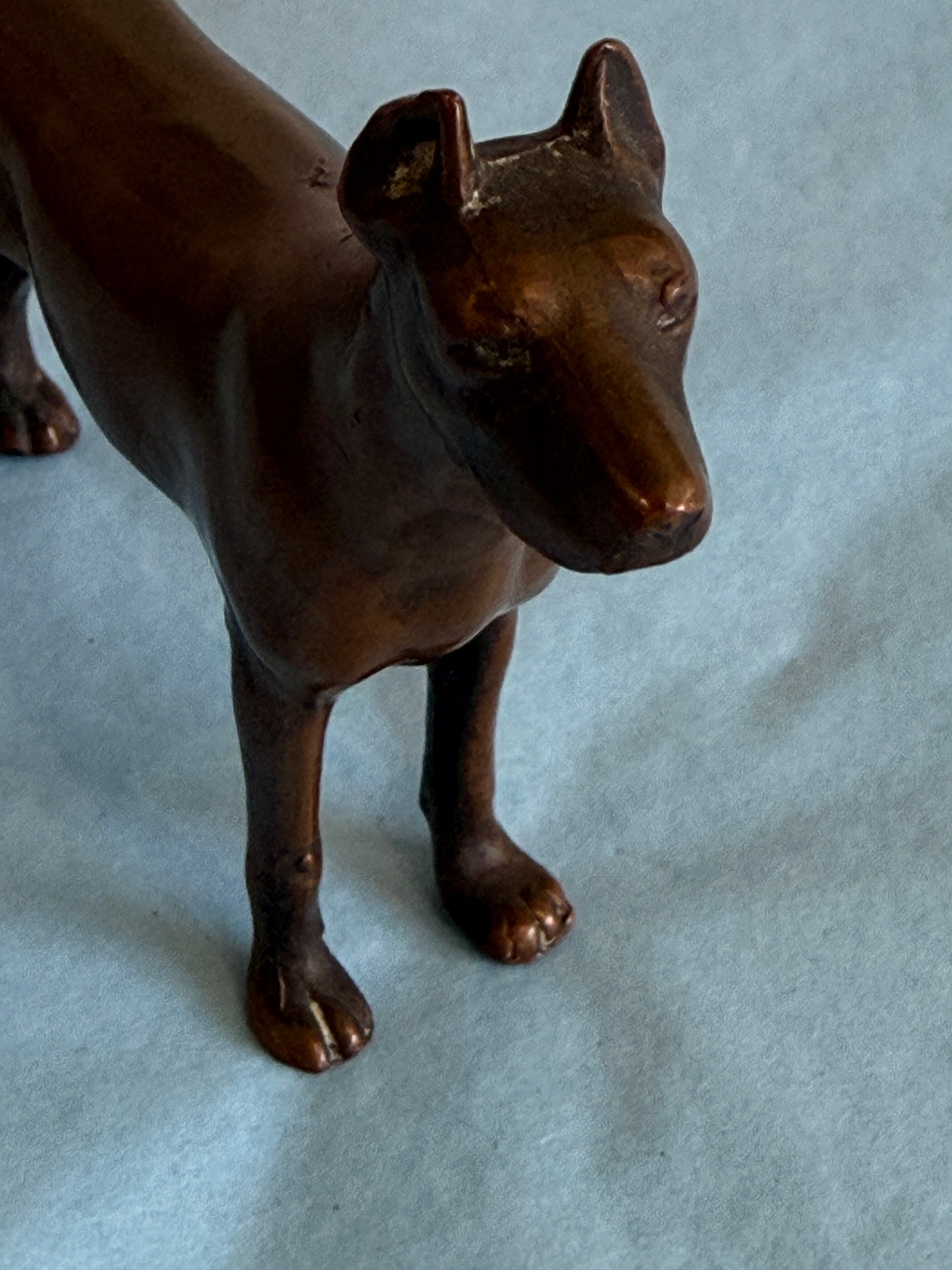 Liven up any space with this quirky Doberman mini statue. Its slight patina adds character while its history as a possible trophy topper adds a touch of whimsy. Perfect for dog lovers, collectors, or anyone looking for a conversation starter.