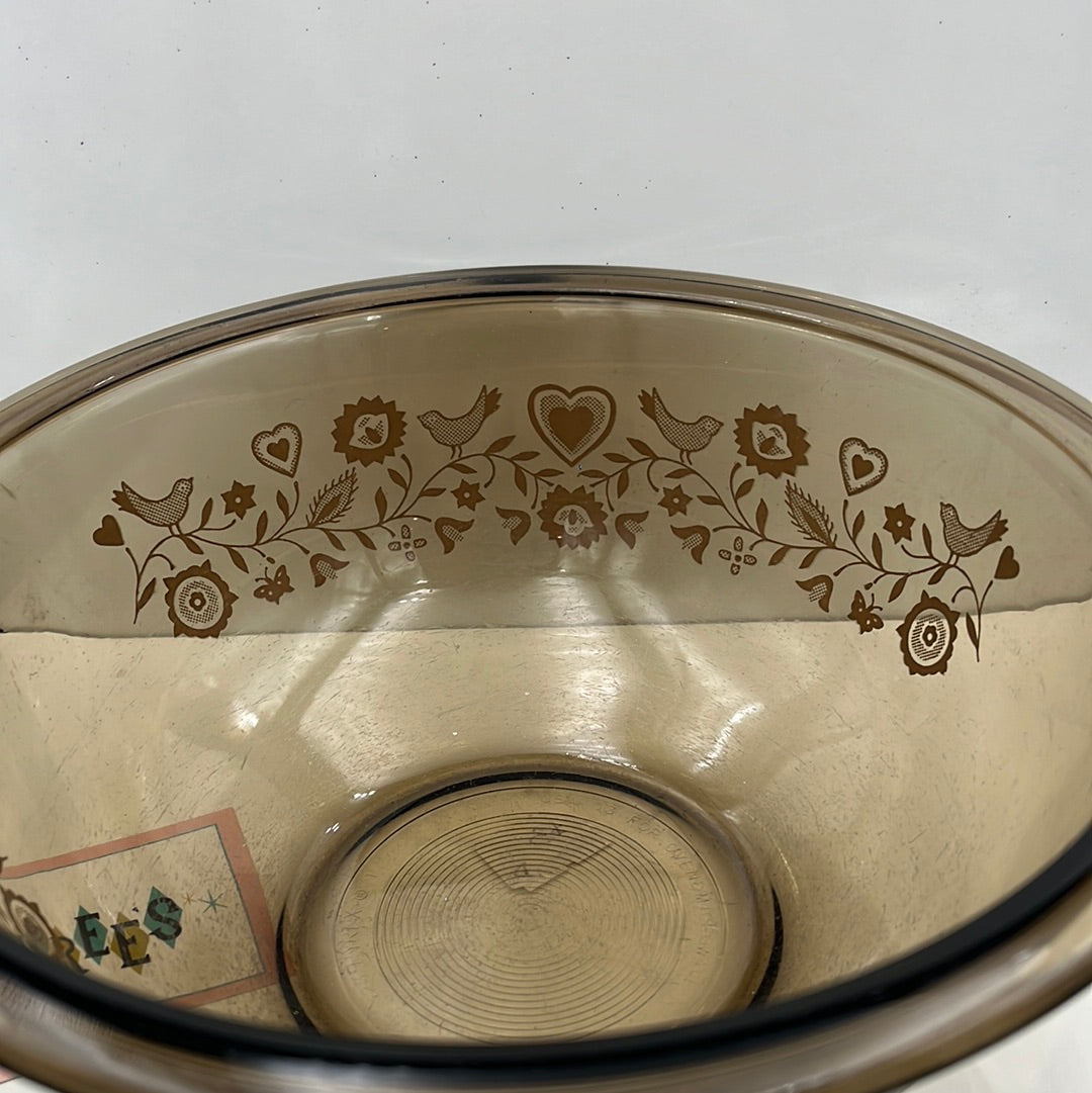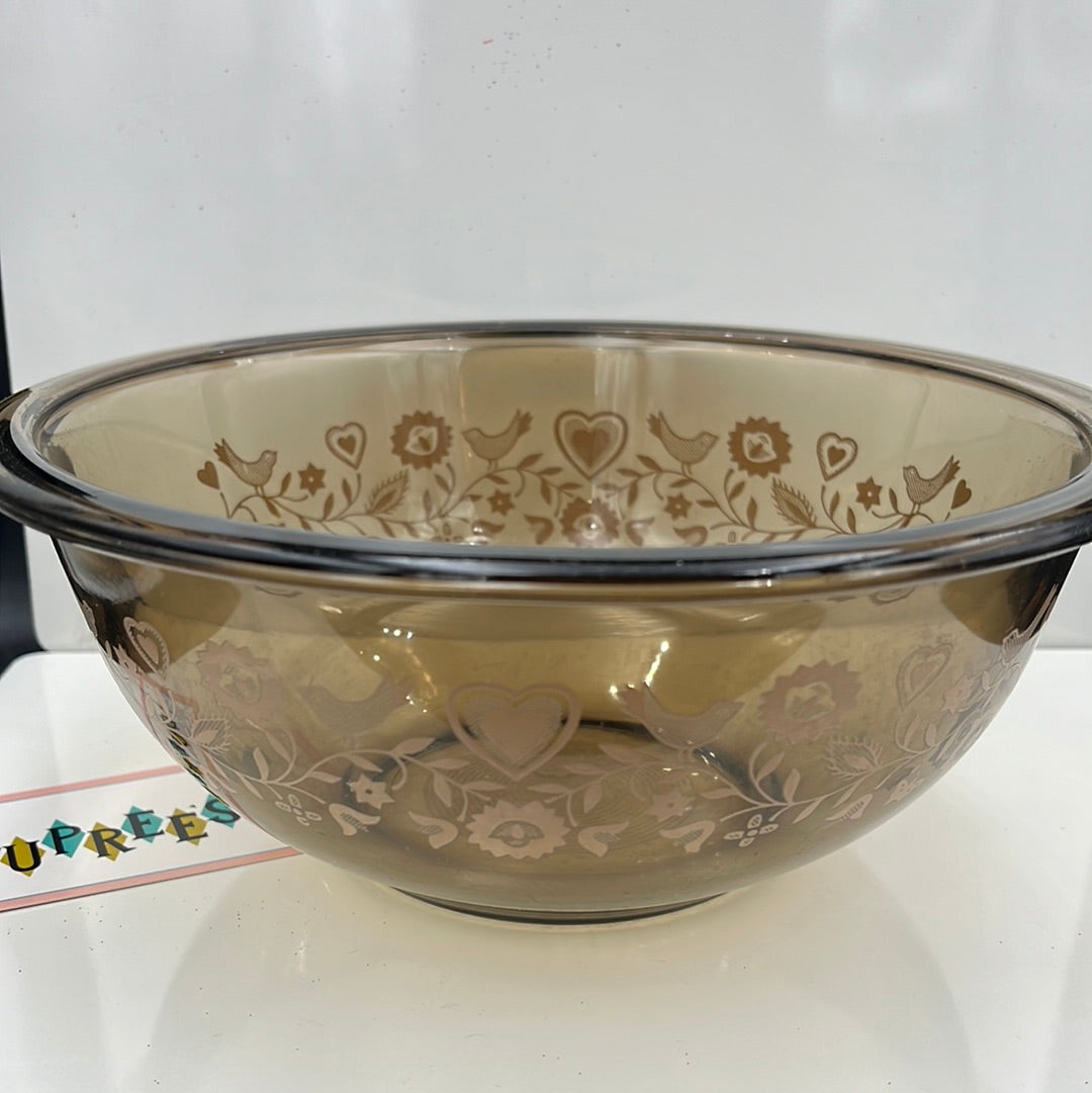 Brown clear Pyrex mixing bowl with festive harvest (hearts and birds floral pattern) on the sides. Well used with surface scratches.