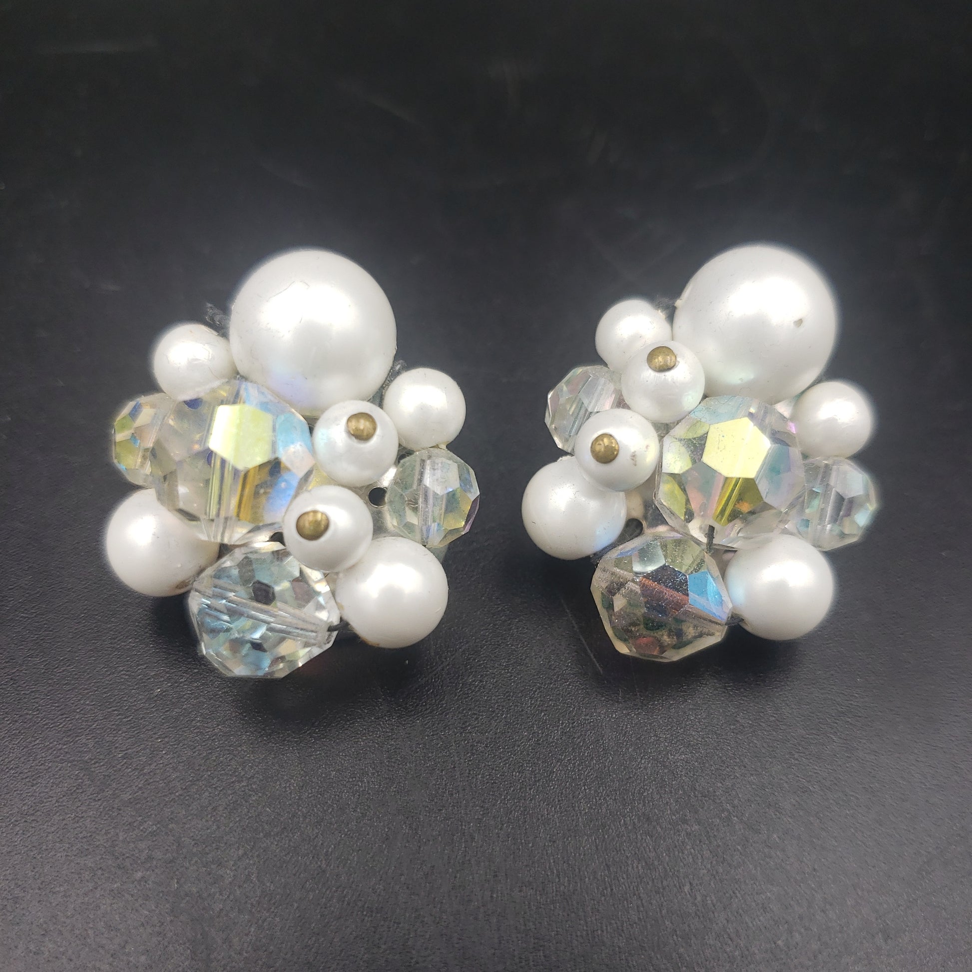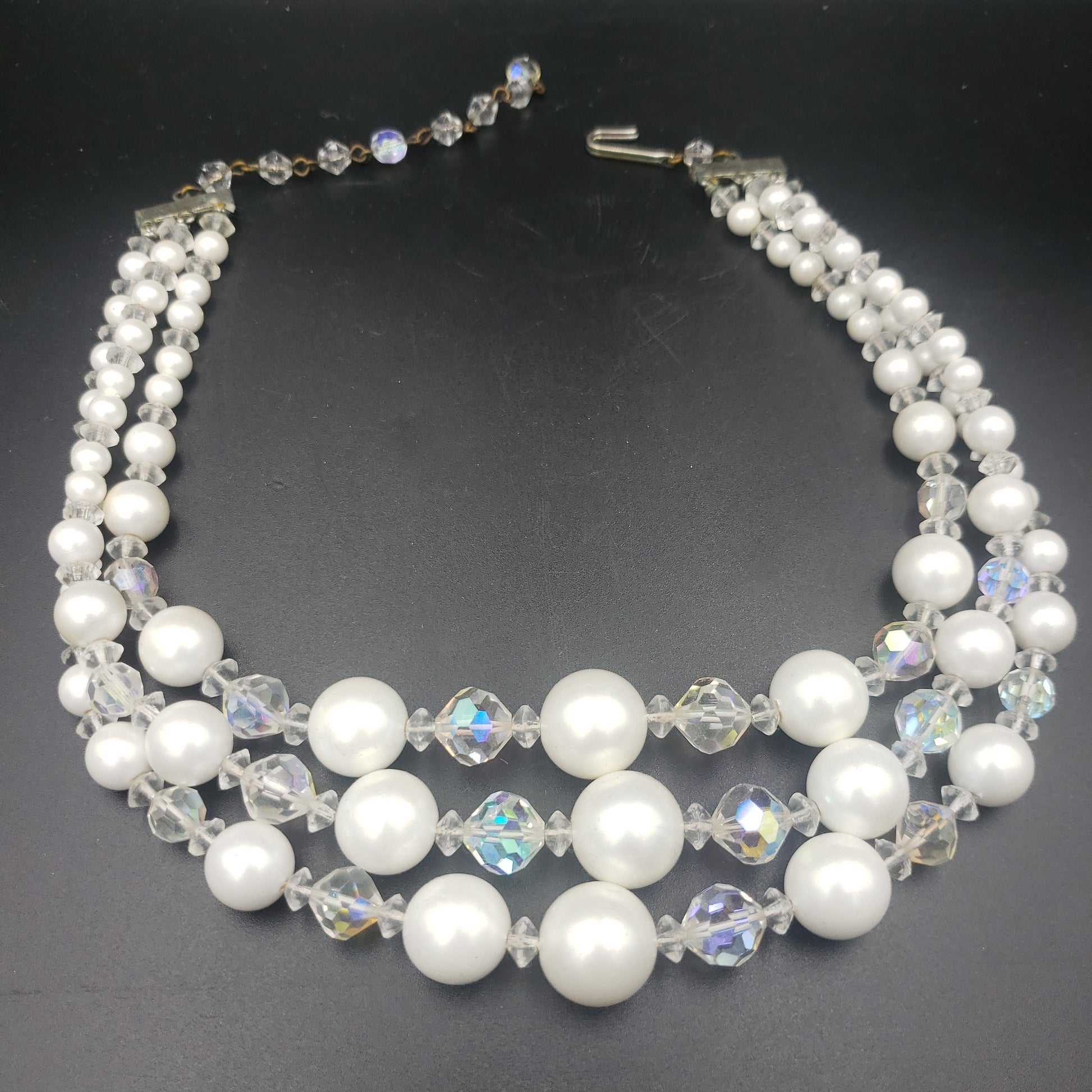 3 row necklace with clip on earrings. The earrings are about 1.25" across and the necklace is 17" long.