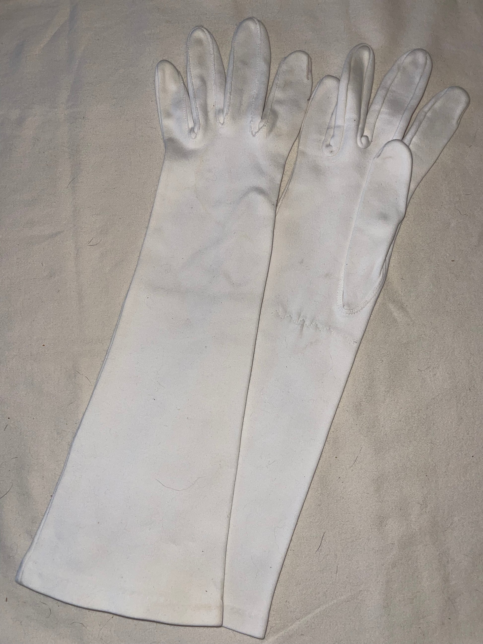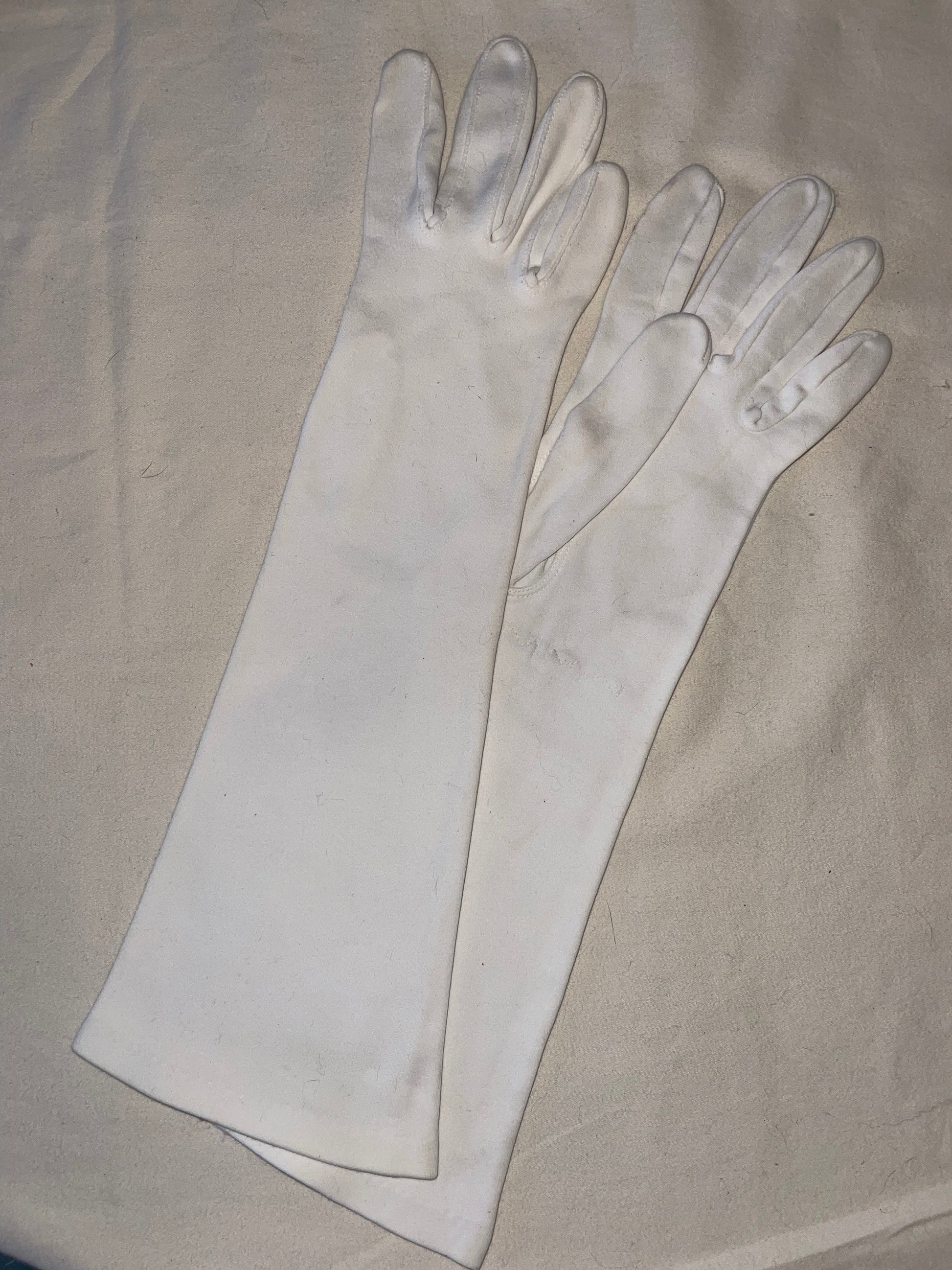 White mid forearm length gloves. These are closer to a winter white (ivory). They measure as a size 6 but comfortably stretch to a size 7-7.5. Needs to be laundered