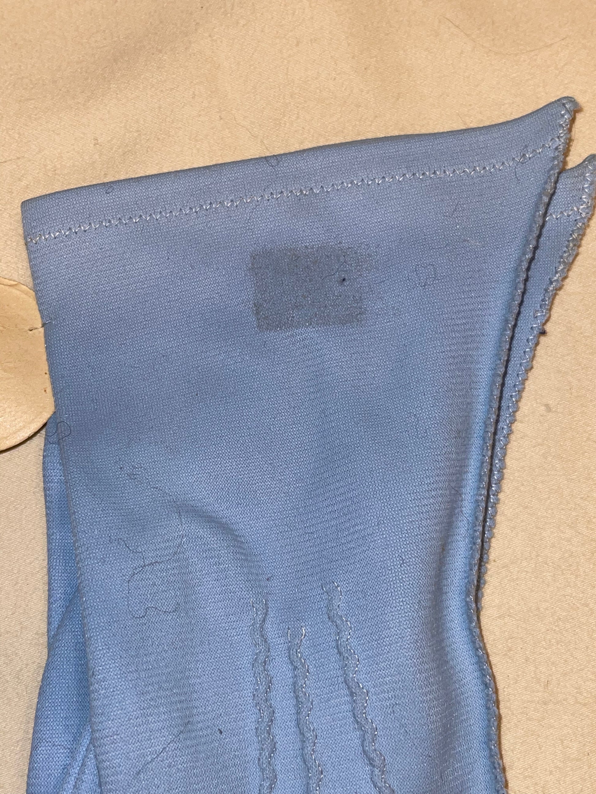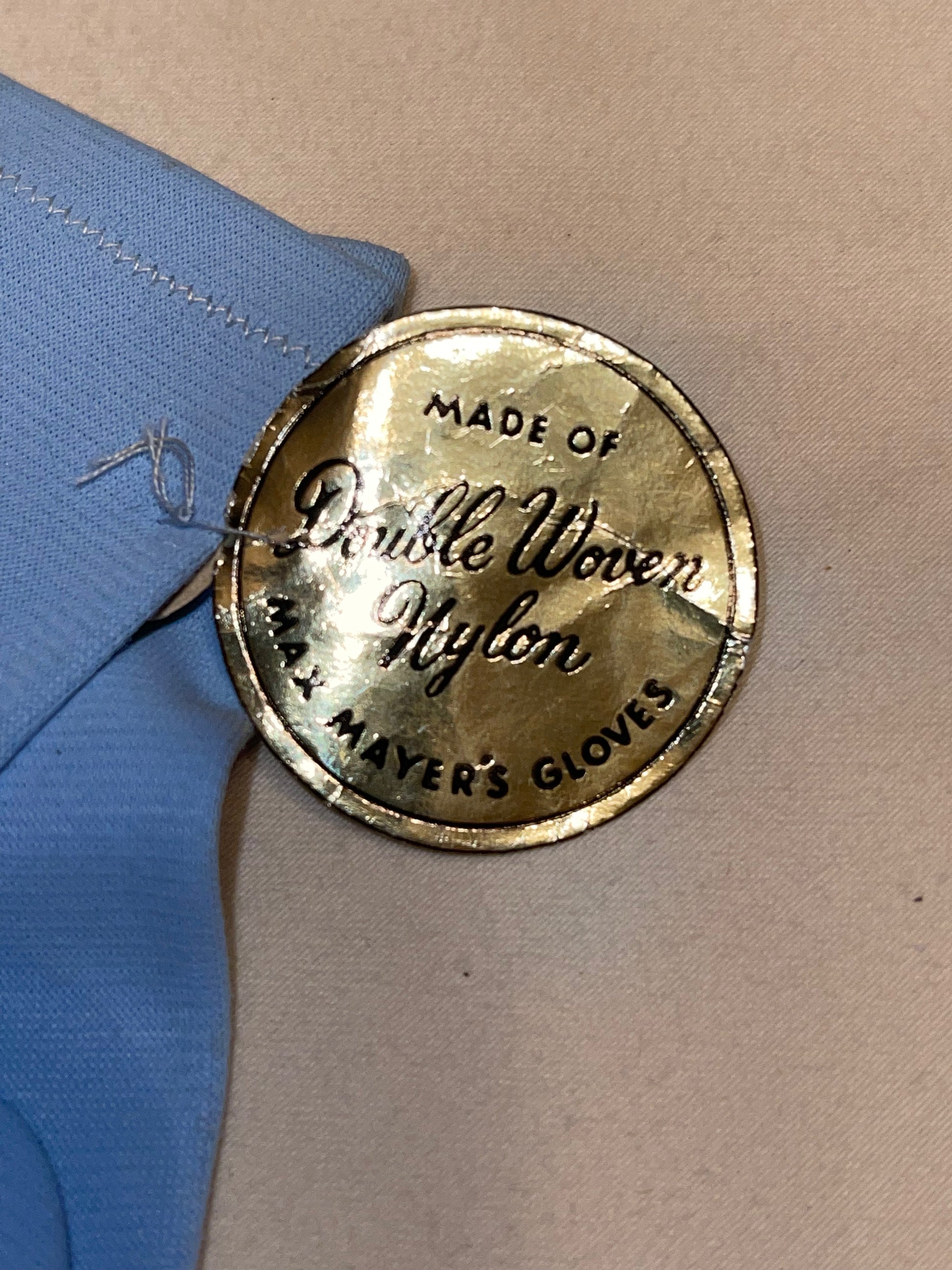 Max-Meyer’s light blue nylon gloves. These wrist length gloves come in their original tags and have never been worn. They measure as a size 6 & labeled a size 6. They do not have much stretch.