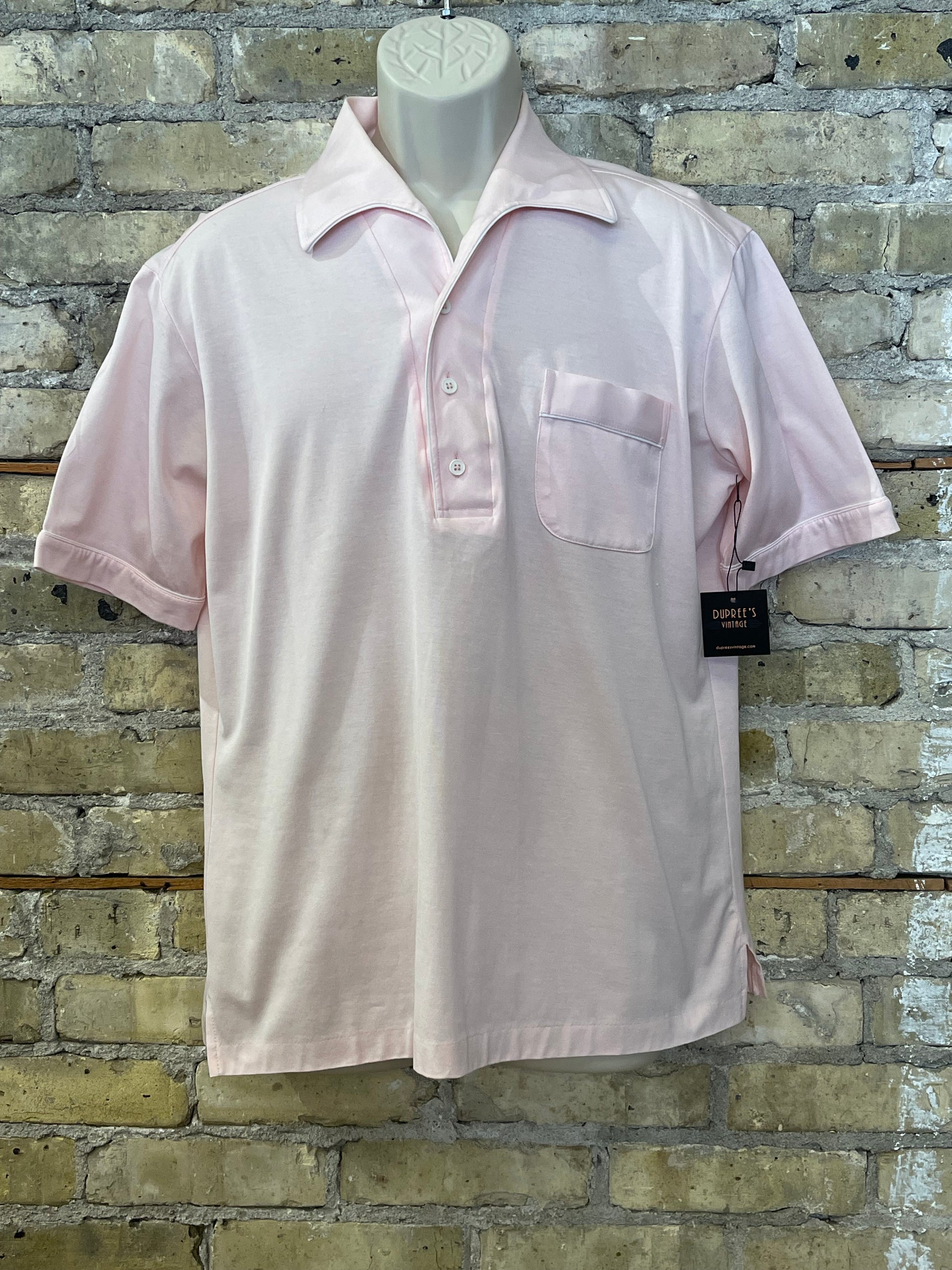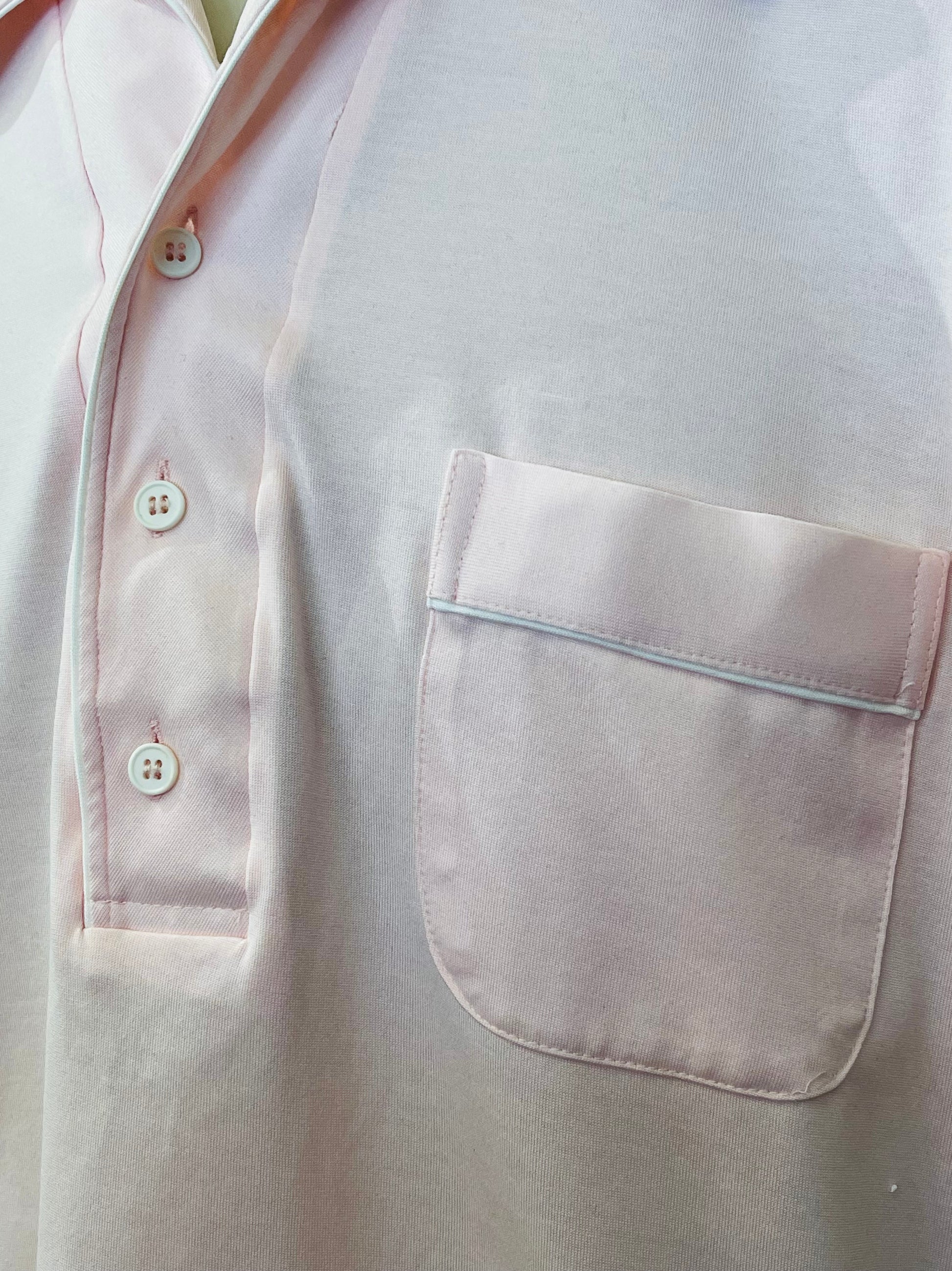 Expertly crafted in Hong Kong, the Countess Wara Polo Shirt features a delicate pale pink color and embodies 1980s style. A small snag on the front and a stain on the shoulder only add to its unique charm. Elevate your wardrobe with this timeless piece.