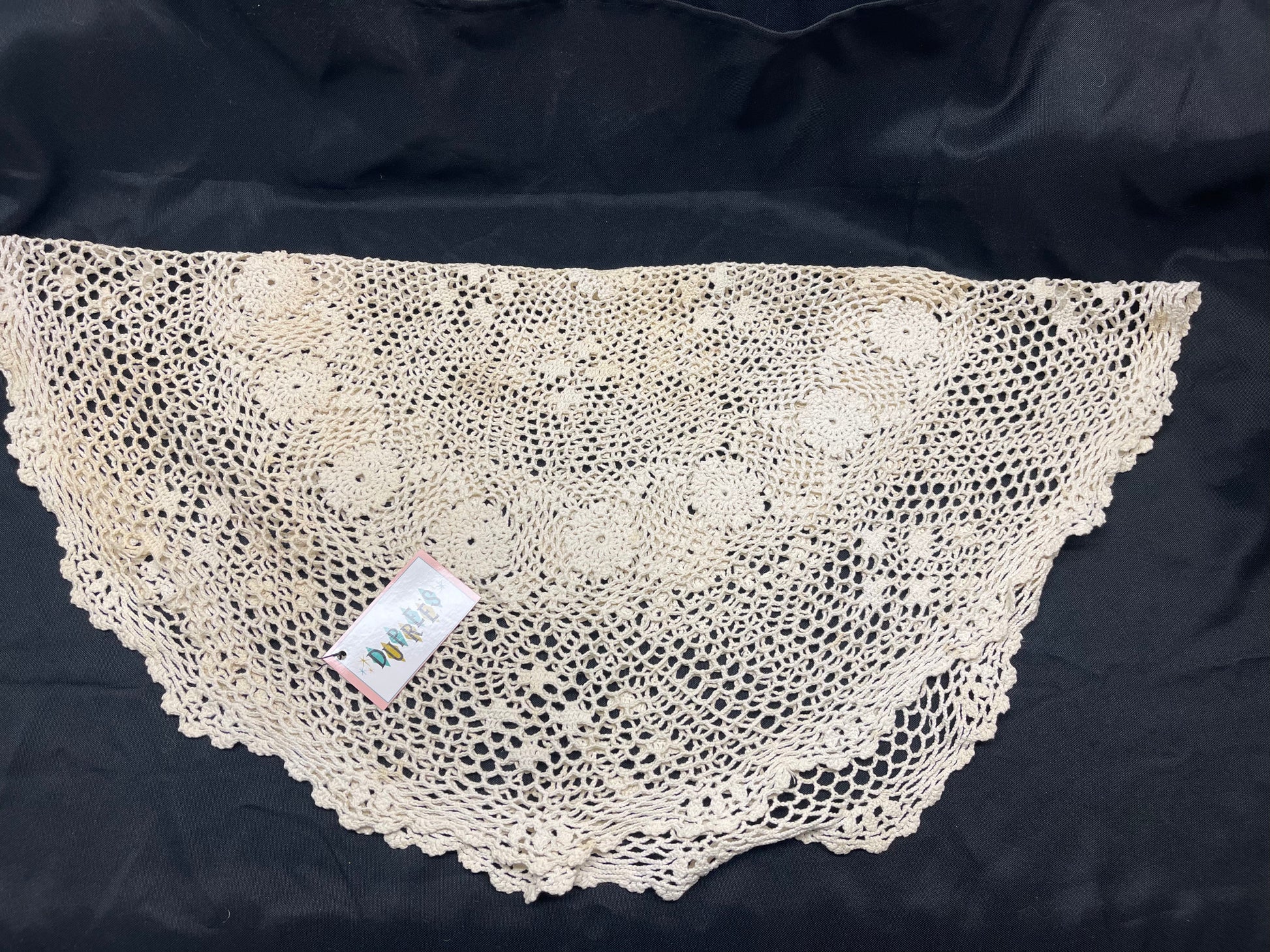 Antique crocheted lace round tablecloth. Has discoloration & one hole that could be stitched together and blended. 33” diameter