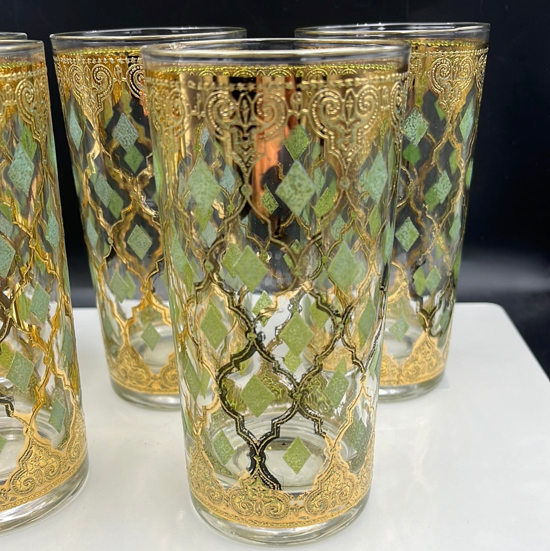 4 Gold and Green Culver Valencia highball glasses. There is minimal wear to the gold if at all. These are unsigned.