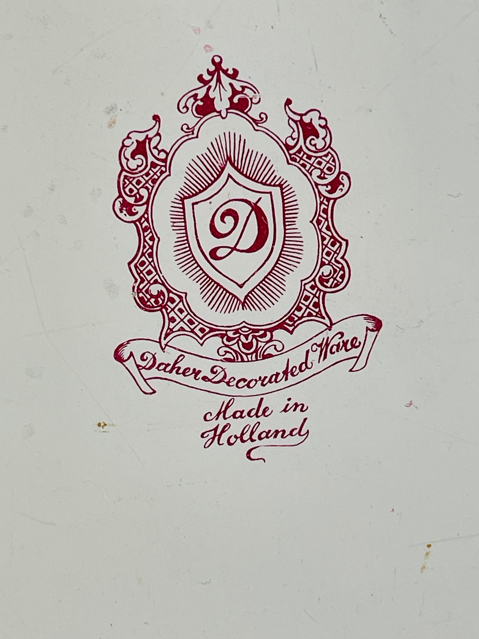 These are Daher Decorated Ware Tin Trays will add a pop of color and vibrancy to any space. Crafted in Holland, the trays feature a classic floral design and only minor wear on the bottoms. Add this stylish tray to your home for a timeless and beautiful addition. 2 available and sold separately