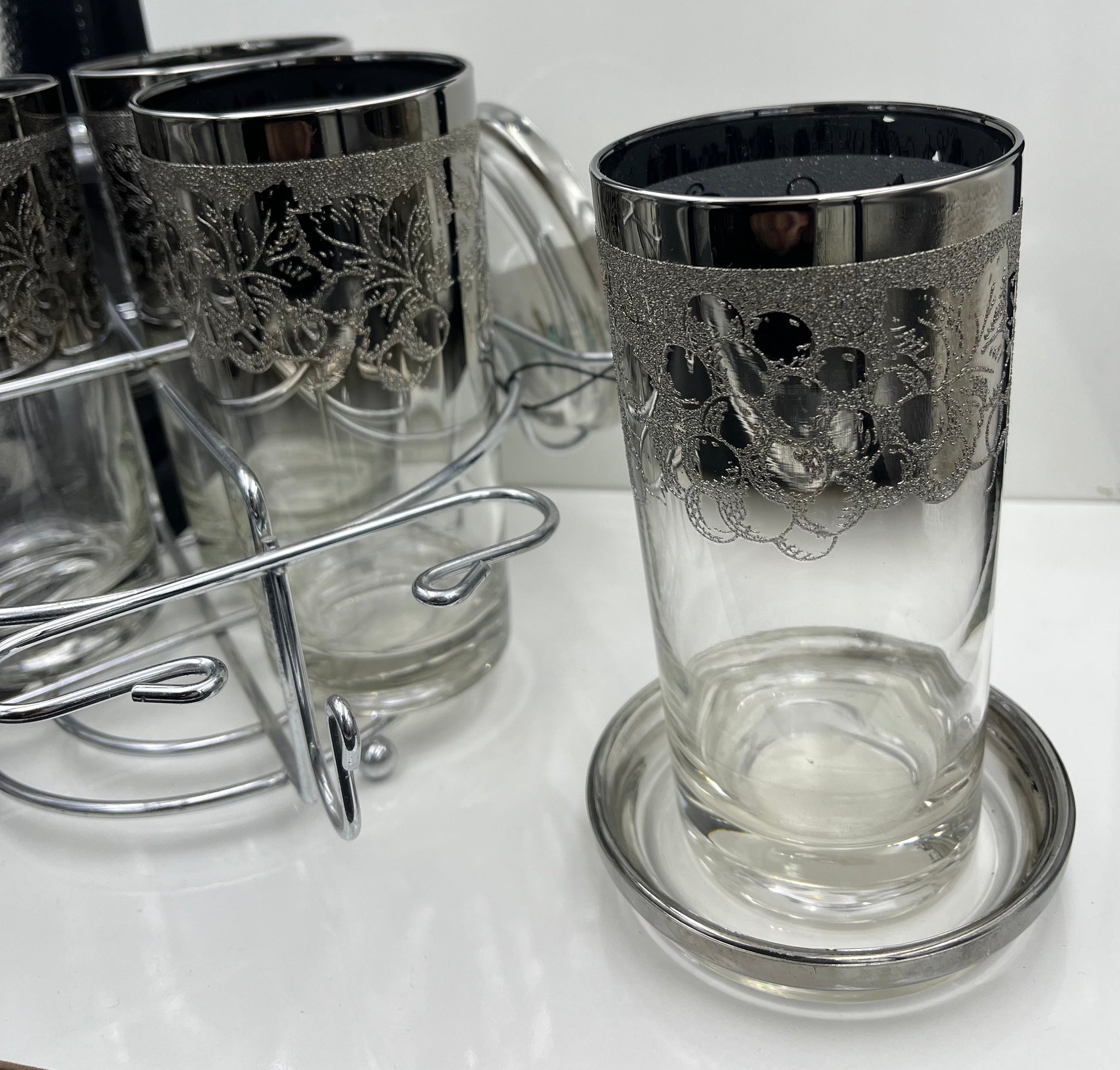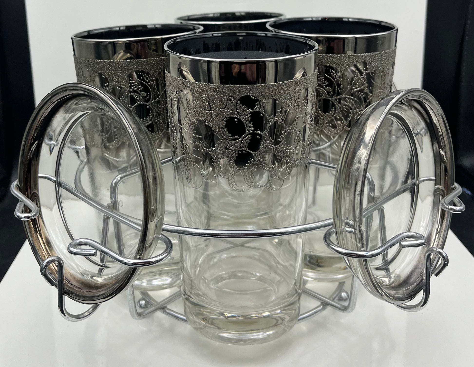 Gorgeous set of 4 vintage high ball glasses , coasters , and silver metal caddy.