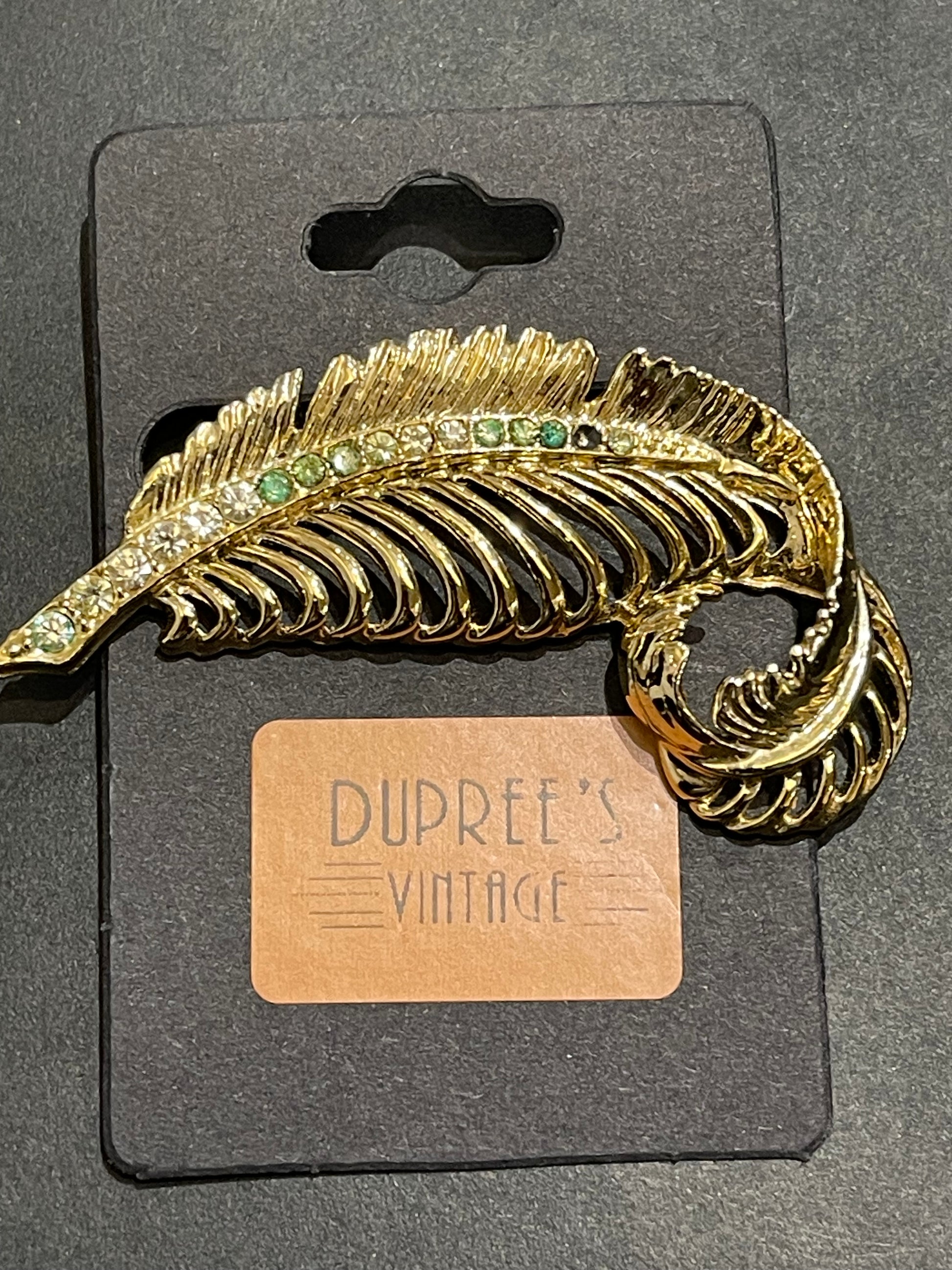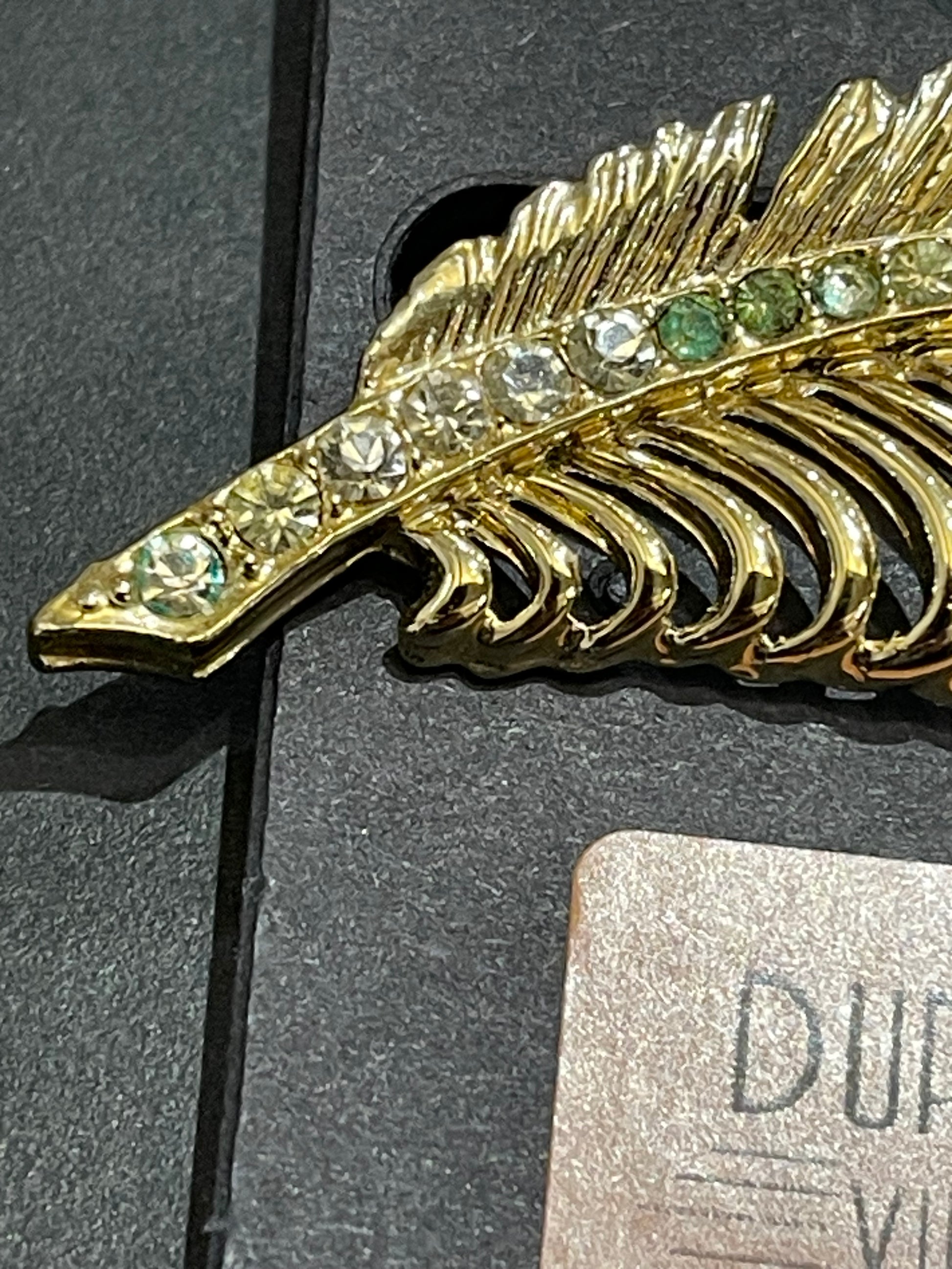 This elegant brooch features a beautiful gold metal leaf design accented with green and clear rhinestones. Though it is missing one stone, it still exudes sophistication and adds a touch of glamour to any outfit. Expertly crafted and eye-catching, it's the perfect accessory for any occasion.