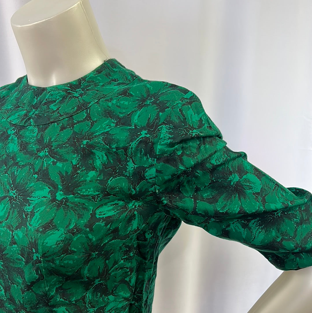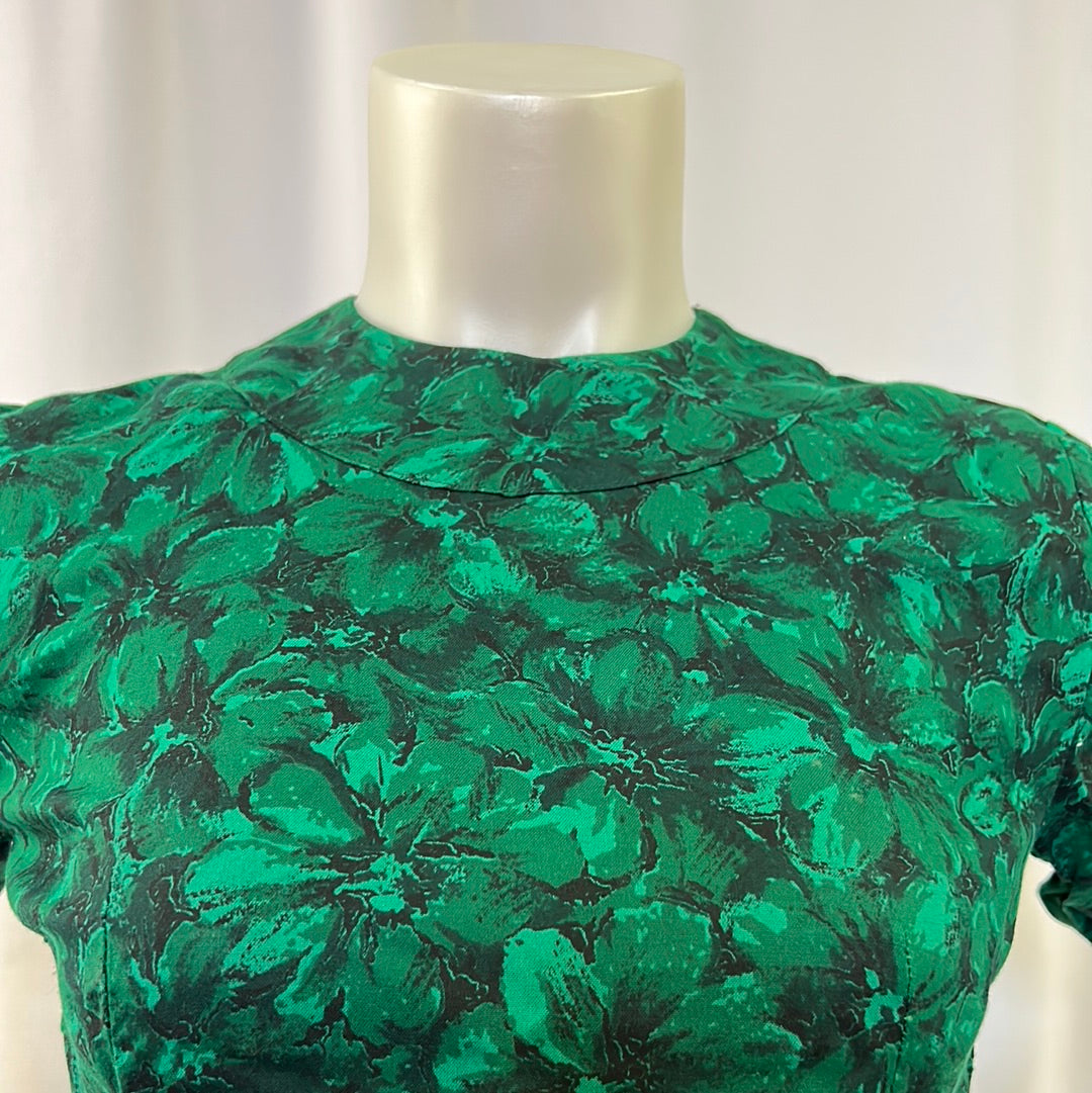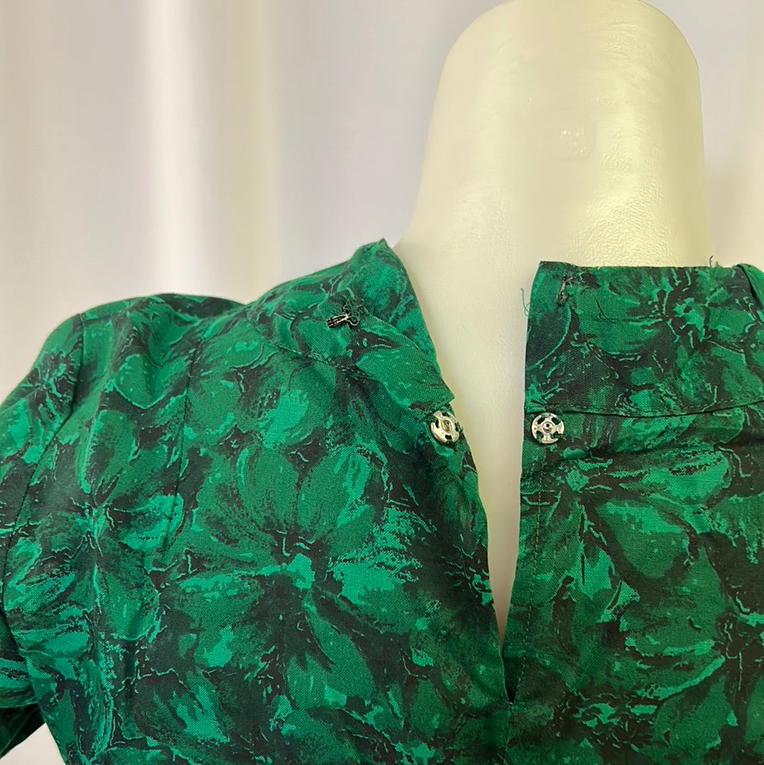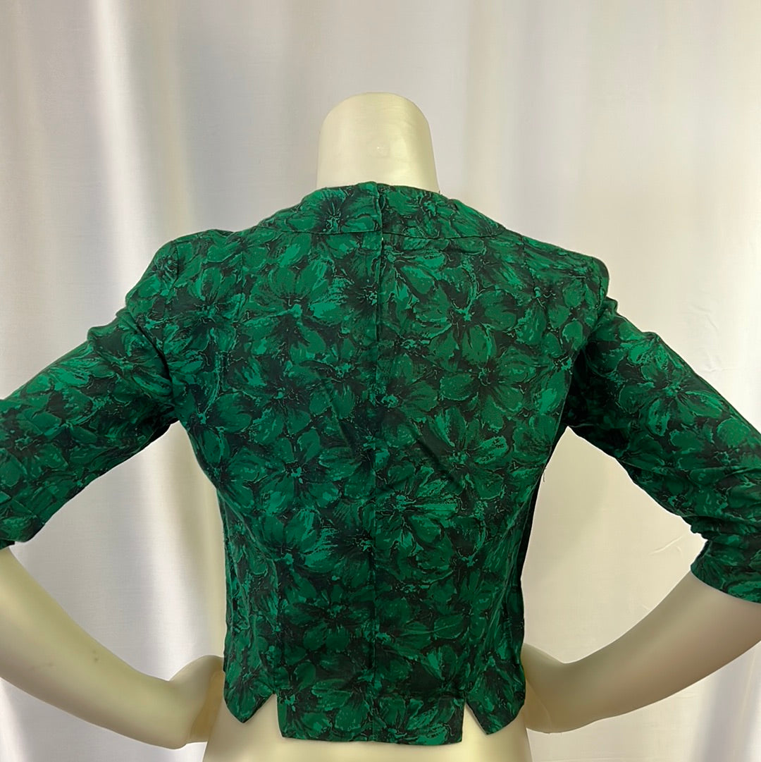 This gorgeous emerald green floral top features a mesmerizing pattern of various shades of green flowers, a clasped back neckline, and 1/2 sleeves.