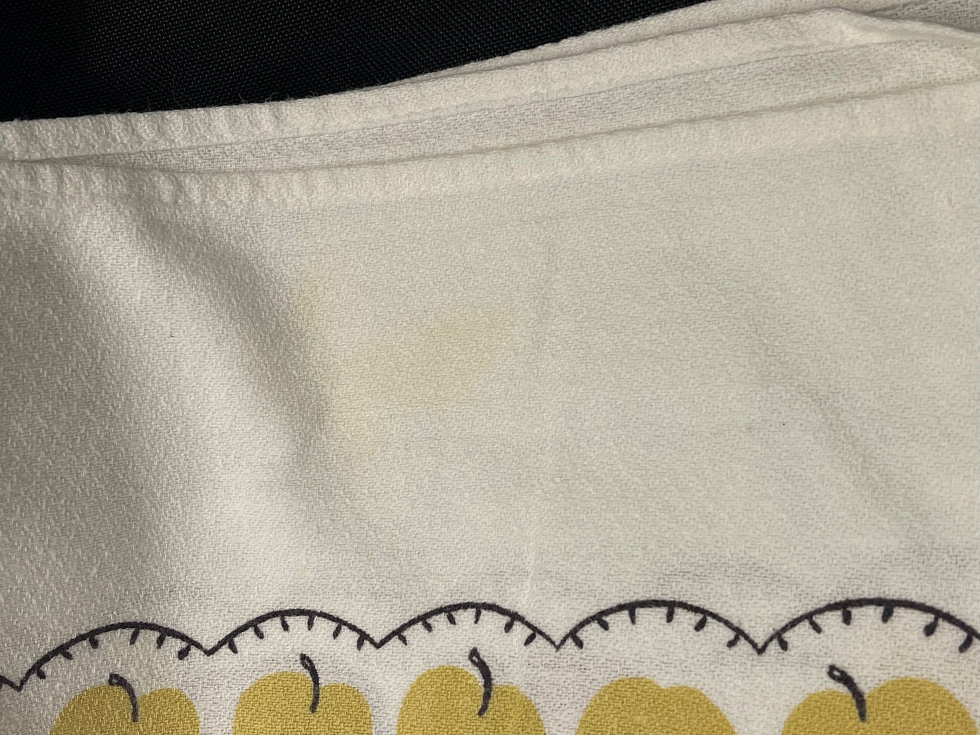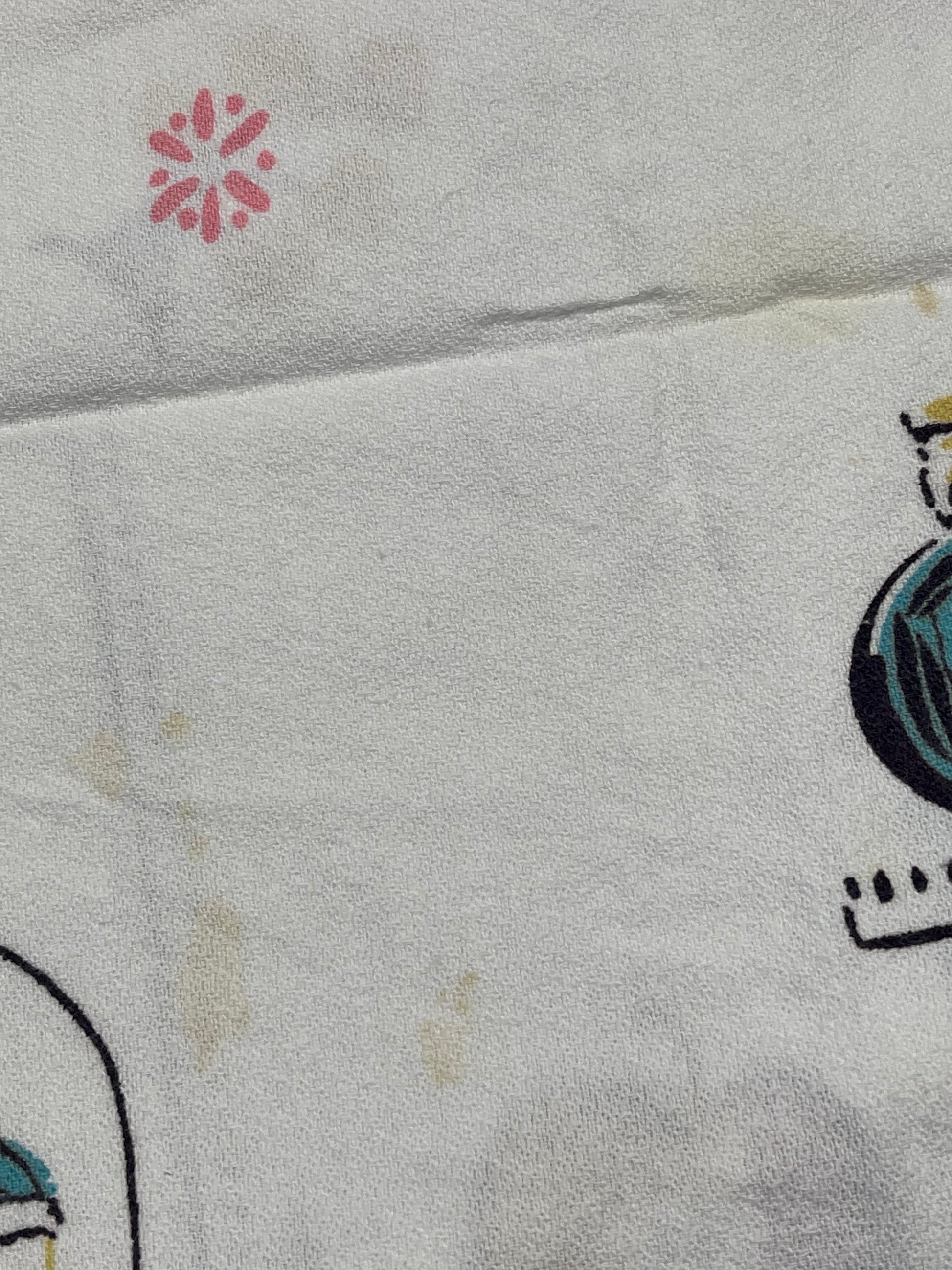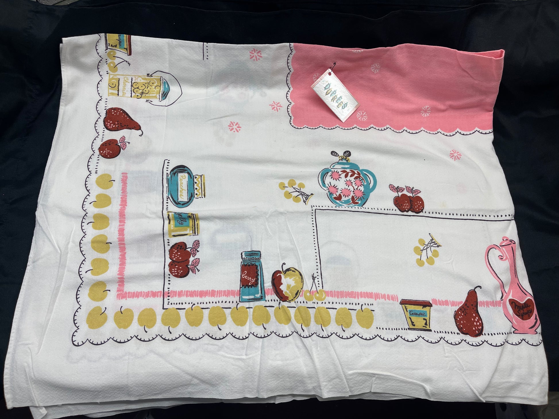 62”x50” pink & white tablecloth featuring whimsical bottles, jars, & fruit in gold, blue & red. It does have scattered staining but still very usable and has not been laundered so they may lighten or be removed.