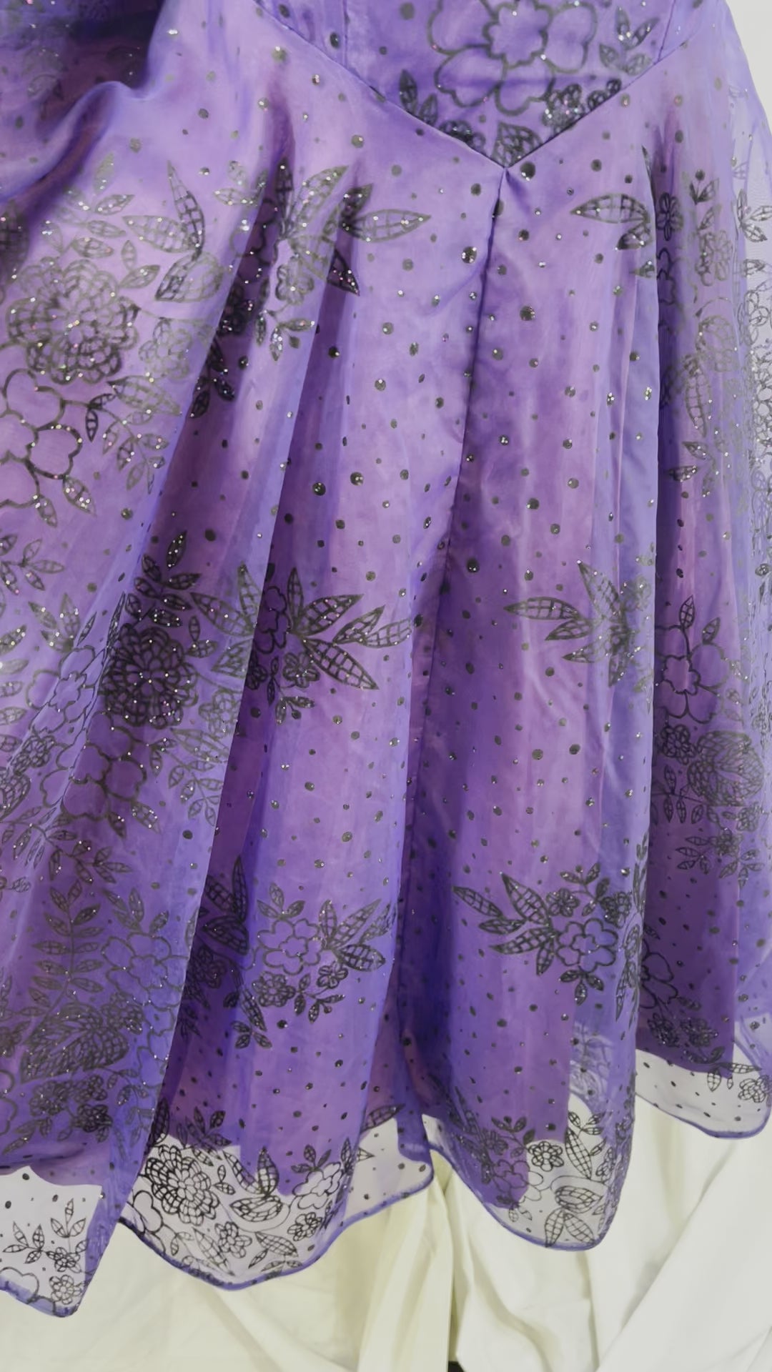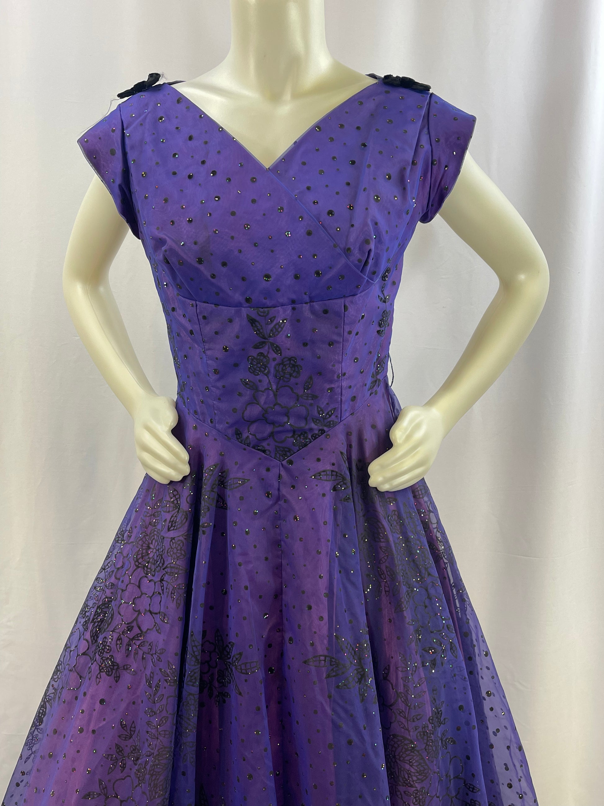 This dress is incredible! It’s a vibrant purple with black flocked floral design and polka dots. It doesn’t stop there! The flocking is scattered with iridescent sequins! The shimmer is just amazing! Small velvet bows adorn the shoulders and the crossover front make for flattering details. This dress is flawless and has no fade. Simply glorious!