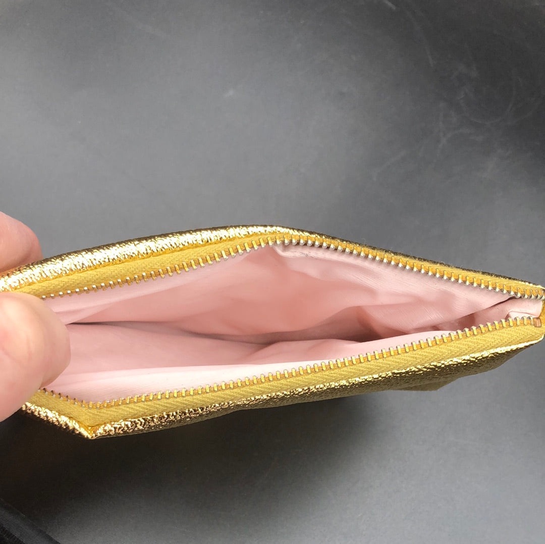 Gold metallic 7” x 4” latch top coin purse with bonus zipper pocket on the bottom. Lined in white vinyl.