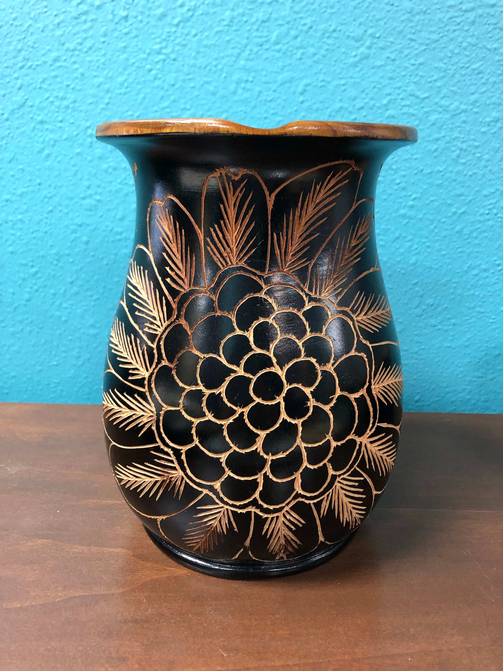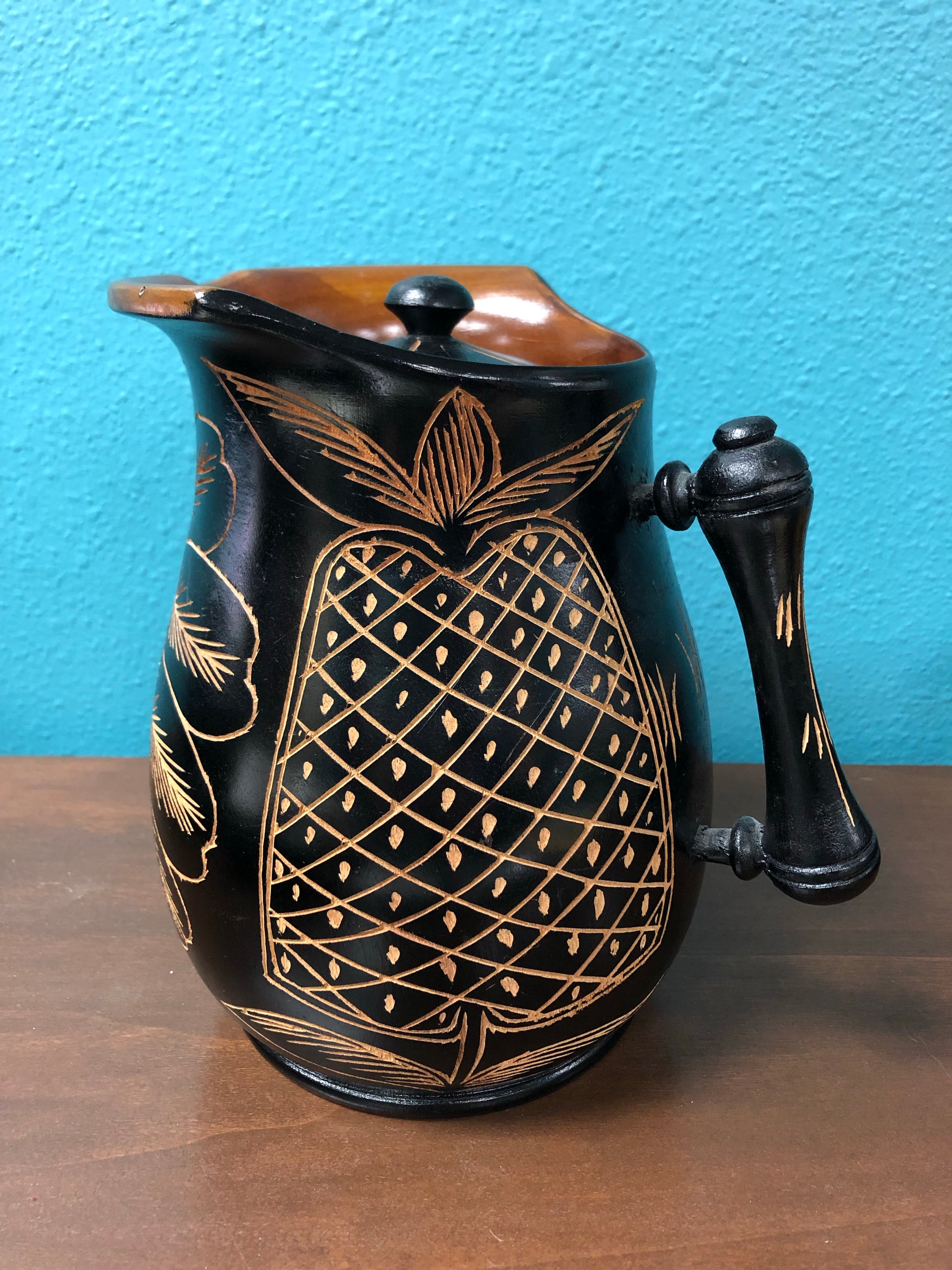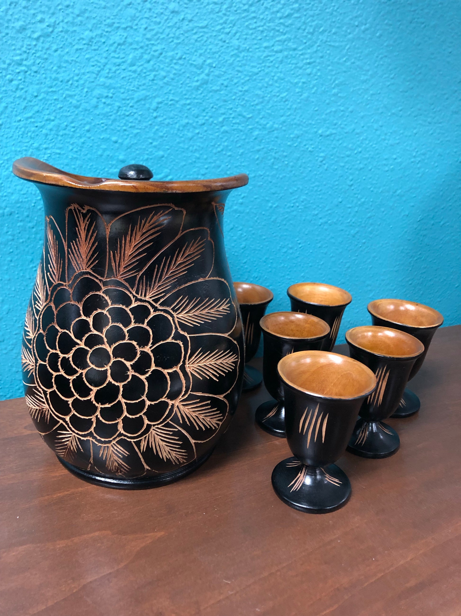 8" Tall hand caved wooden handled pitcher. Large flower and two pineapples carved surface of the pitcher.  6  small footed hand carved cups that match.