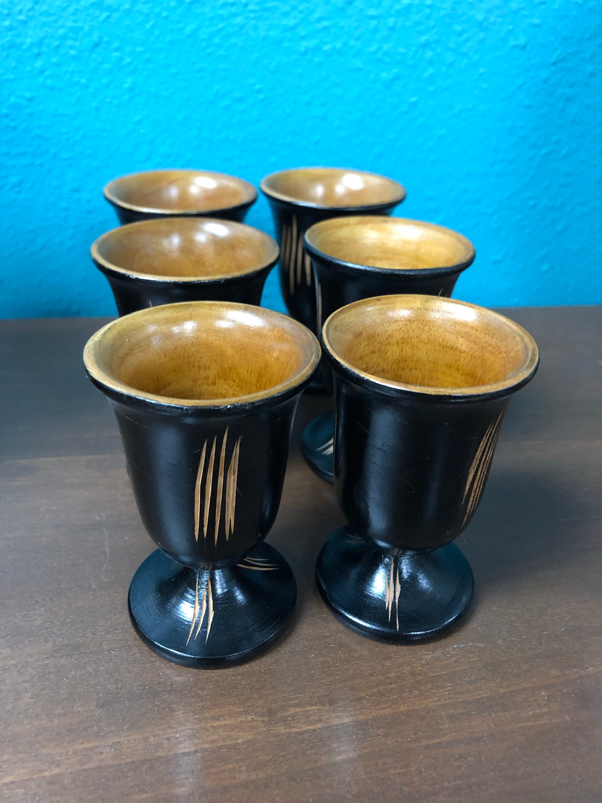 Hand carved wood pitcher and 6 hand carved matching cups