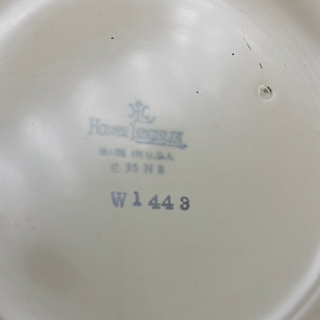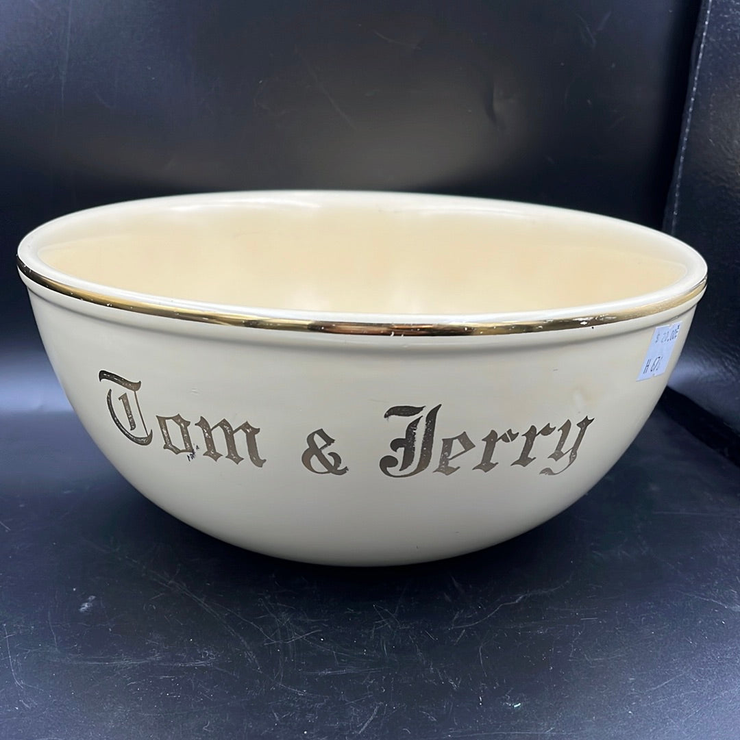 Ivory (9.5” across and 4” deep) Tom and Jerry bowl with gold lettering that is lightly etched. Made in the USA Homer Laughlin.