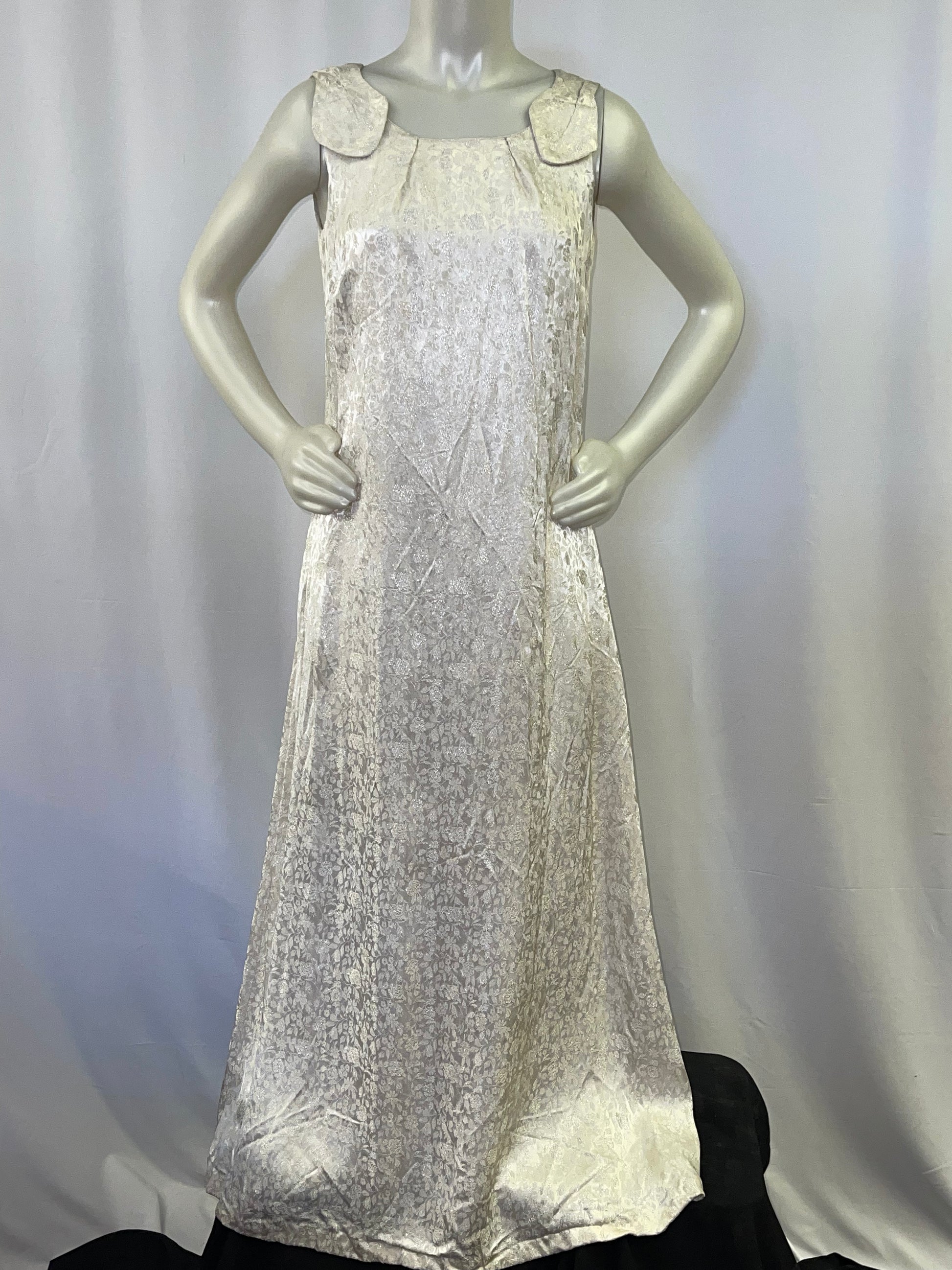 Simple and elegant is the best way to describe this lightweight ivory brocade dress. Features an unusual shoulder style and 2 beck line darts. It has a small stain and overall could use a cleaning.