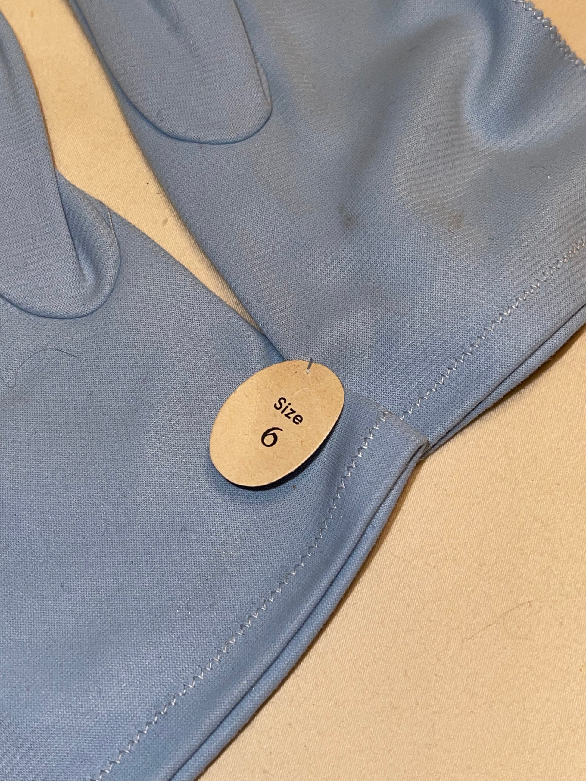 Max-Meyer’s light blue nylon gloves. These wrist length gloves come in their original tags and have never been worn. They measure as a size 6 & labeled a size 6. They do not have much stretch.