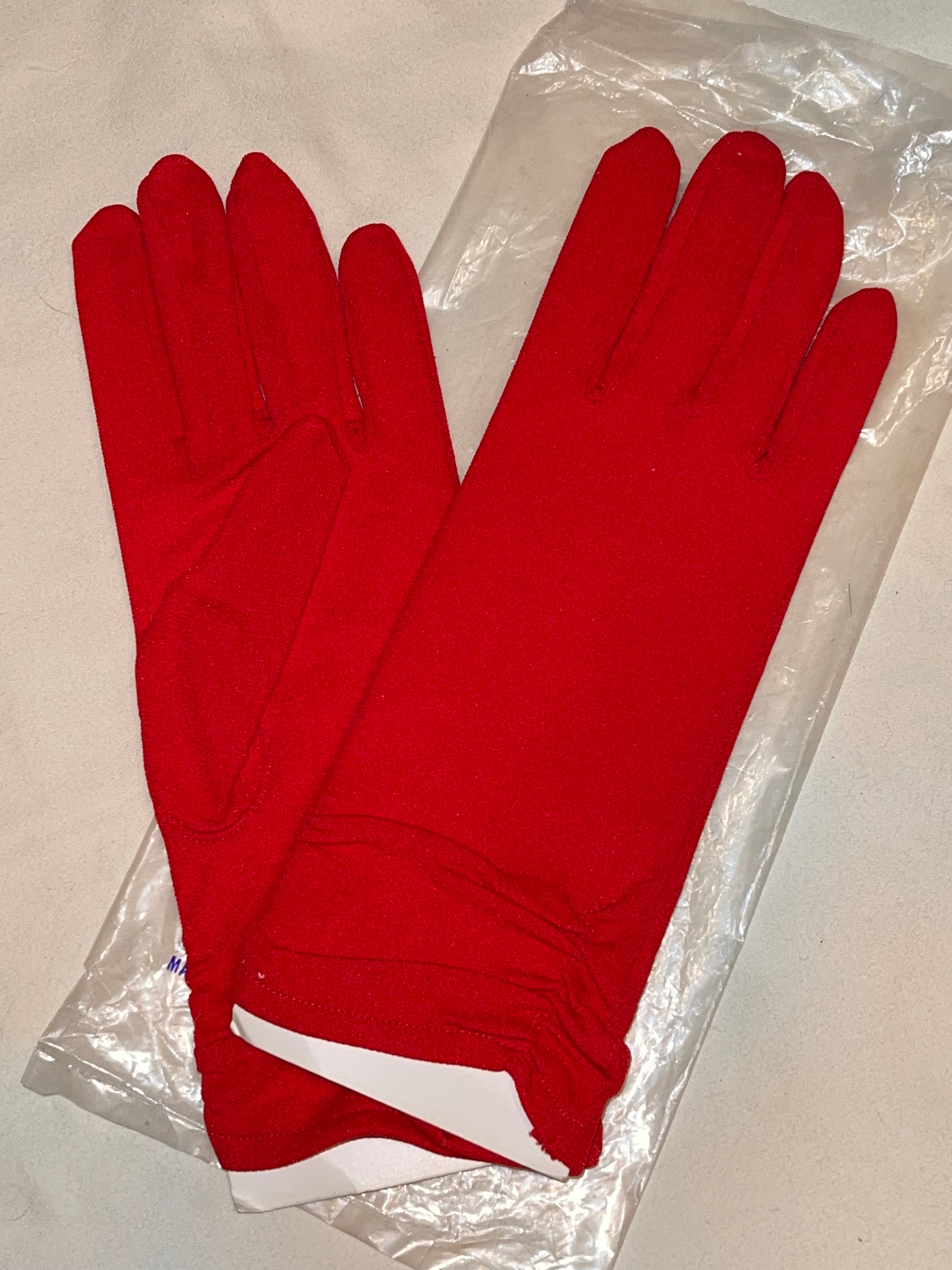 Max-Meyer’s red nylon gloves. These wrist length gloves come in their original packaging and have never been worn. They measure as a size 6 but will stretch comfortably to a size 7/7.5