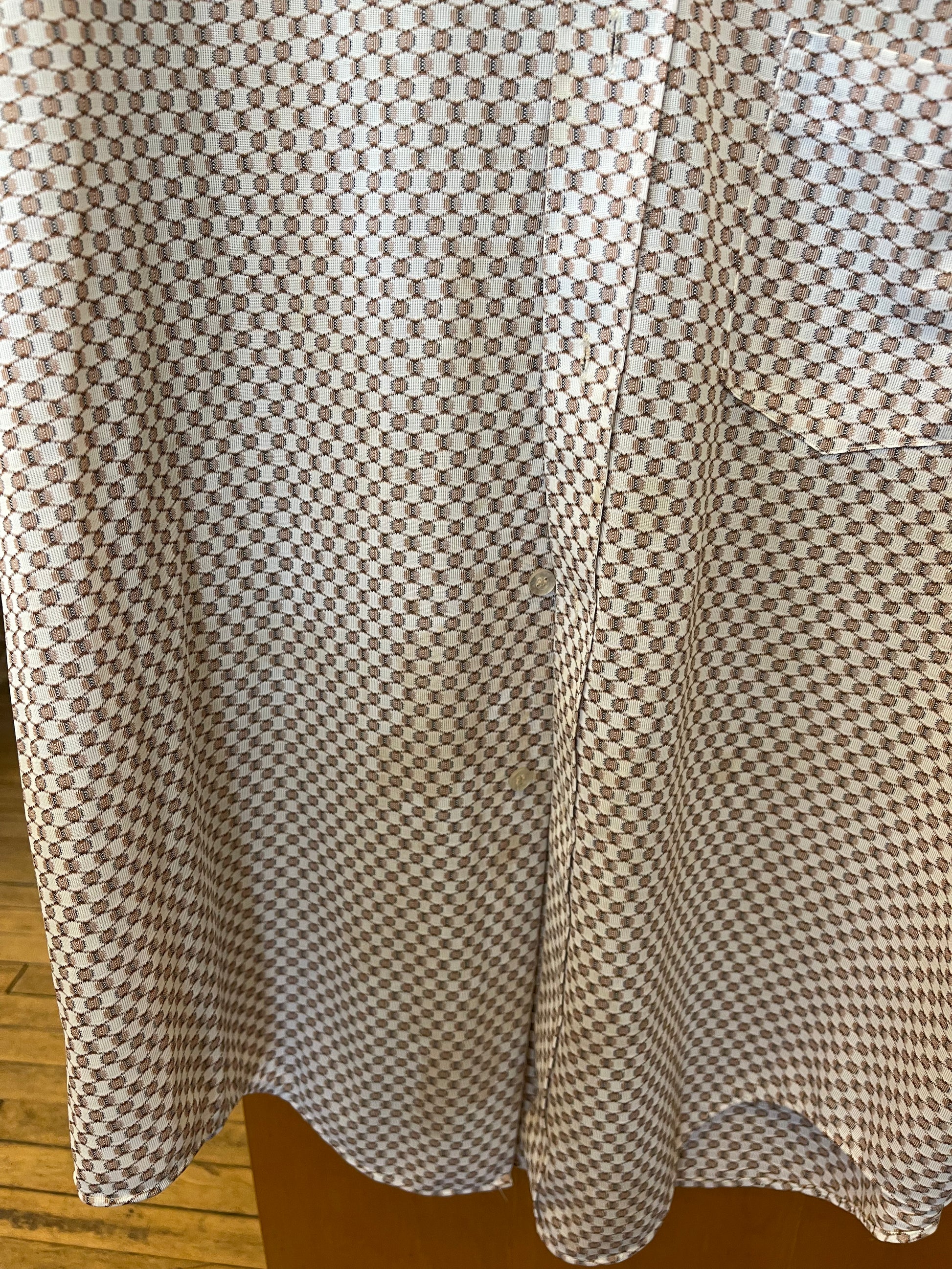 17” neck men’s button down sheer polyester shirt. Beige background with brown geometric design. Slight waist level discoloration.