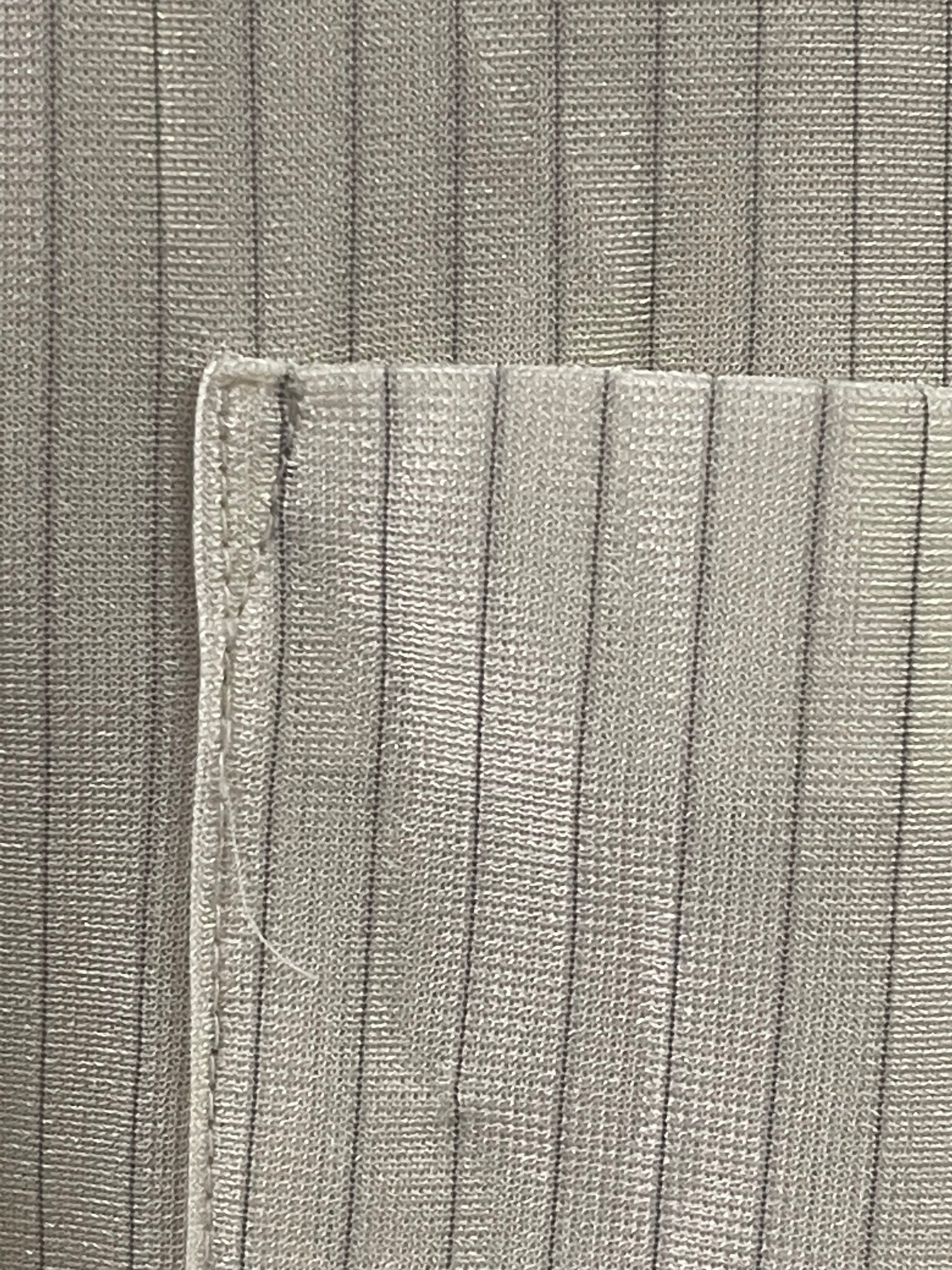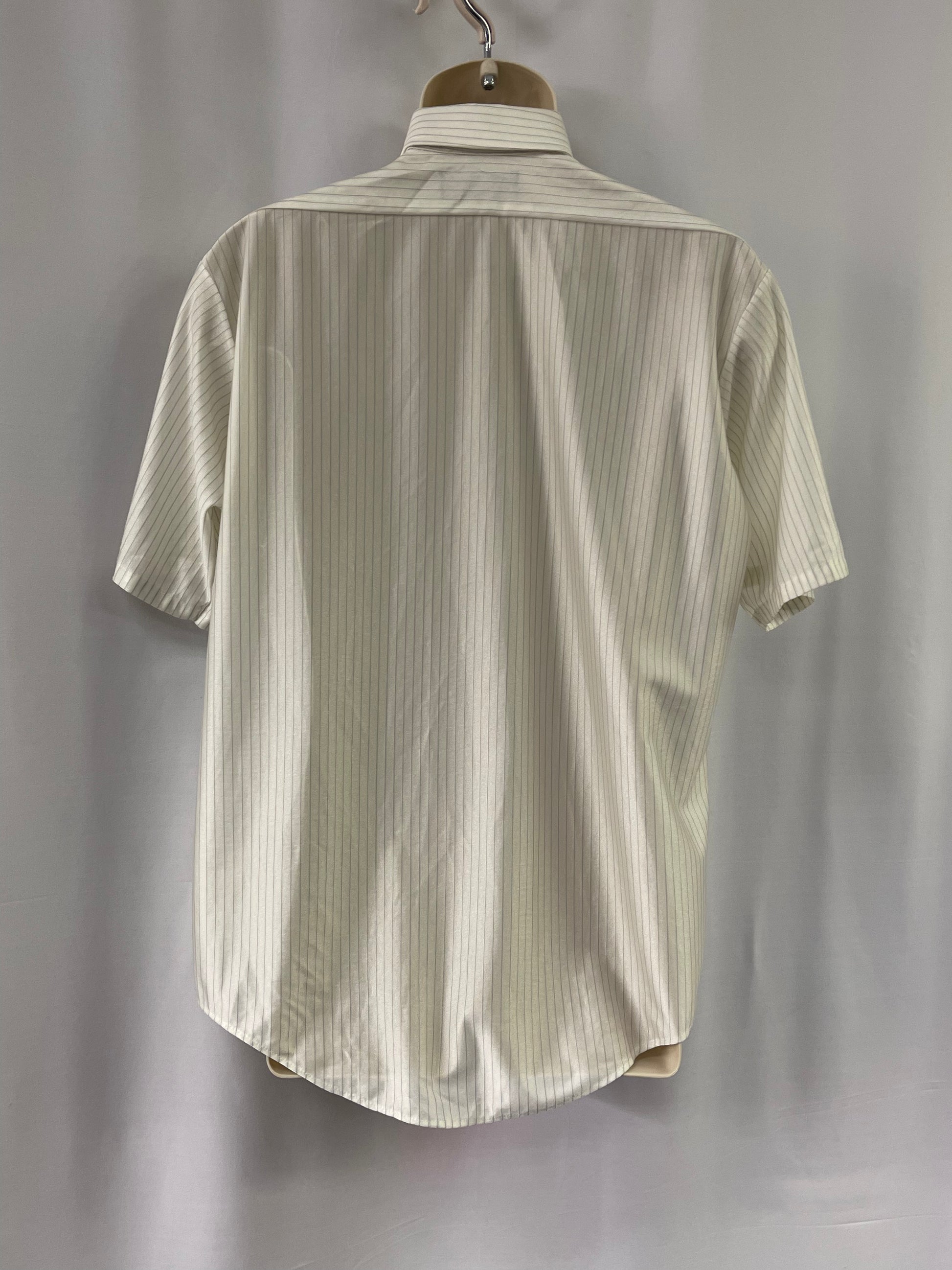 White nylon shirt with grey vertical stripes, and clear sqaure buttons up the front