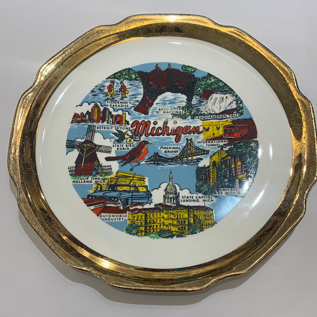Decorative souvenir plate from the great state of Michigan featuring the state capital, the University of Michigan, Mackinac bridge and more