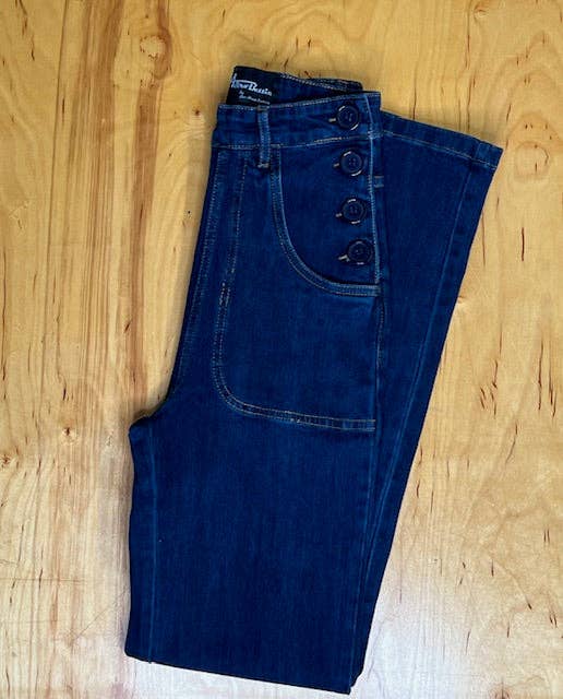 The Midge Button jeans features our signature top stitching, high waisted with side button closure, contrasting Tan top stitching, 5 belt loops and includes front and back deep pockets.