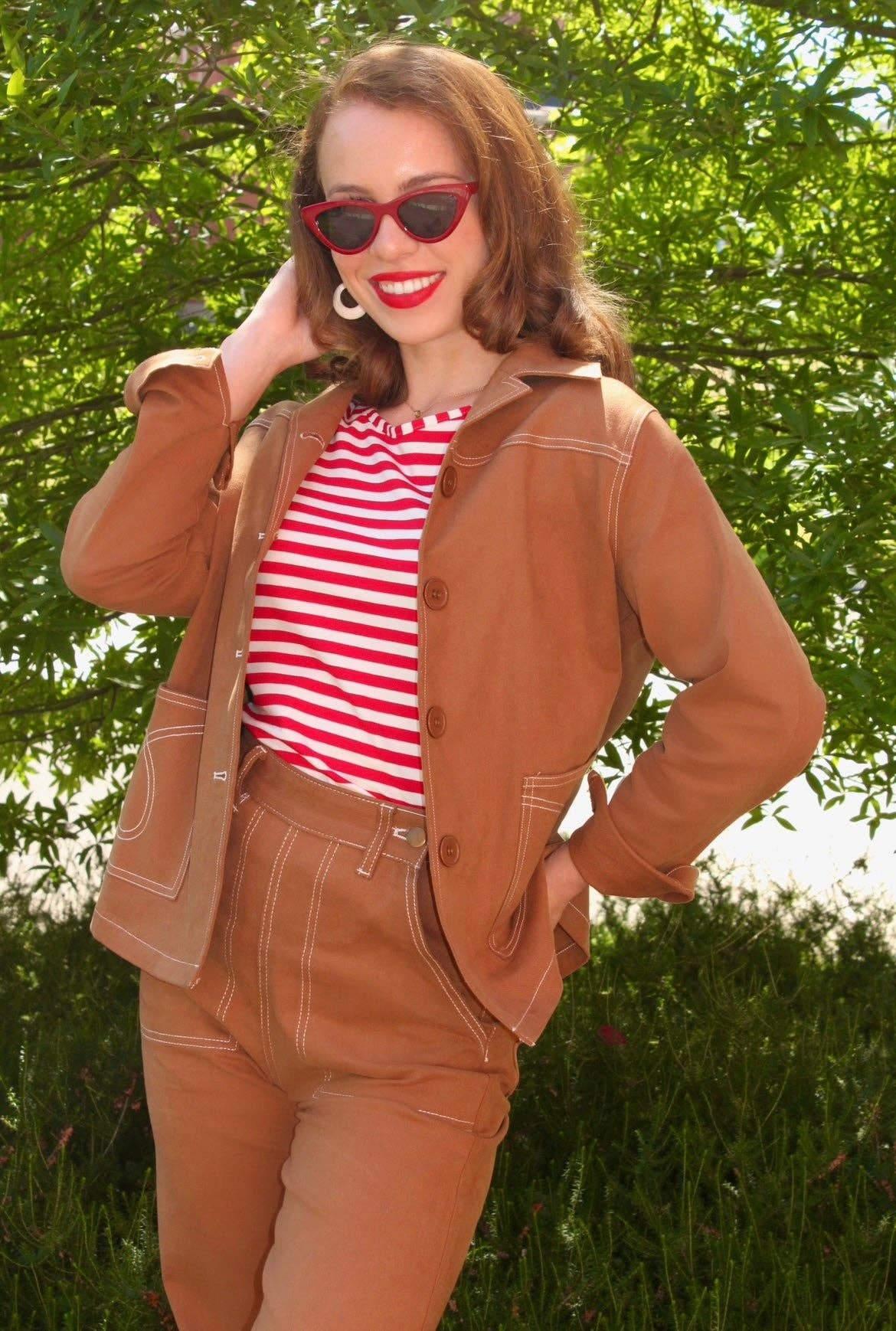 Shown here with the Midge Jean Jacket, Red Stripe pullover and our Rocket Sweater.