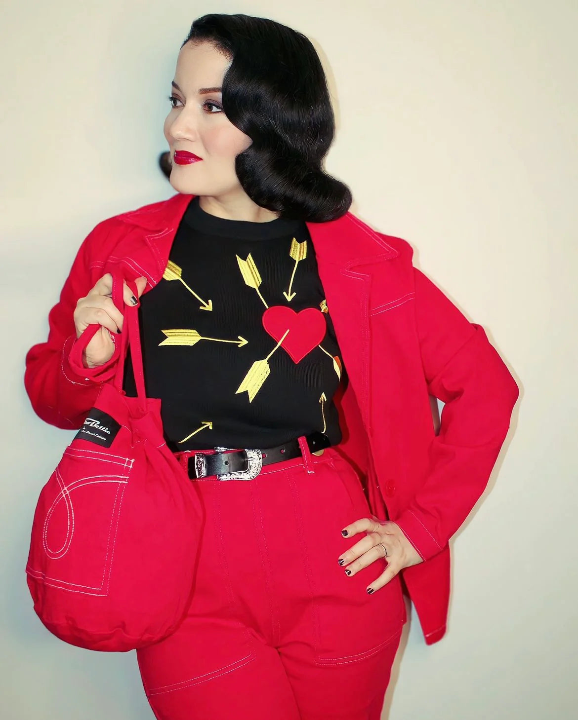 Shown here with the Midge Jean Jacket, Red Stripe pullover and our Rocket Sweater.