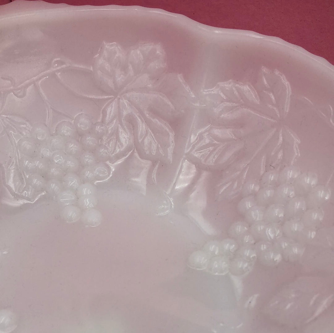 White Milk Glass bowl with grape pattern on the interior and exterior. 9" x 8' x 2.5".