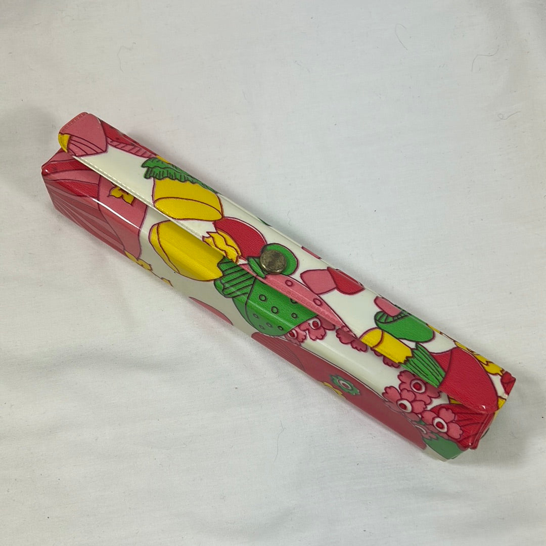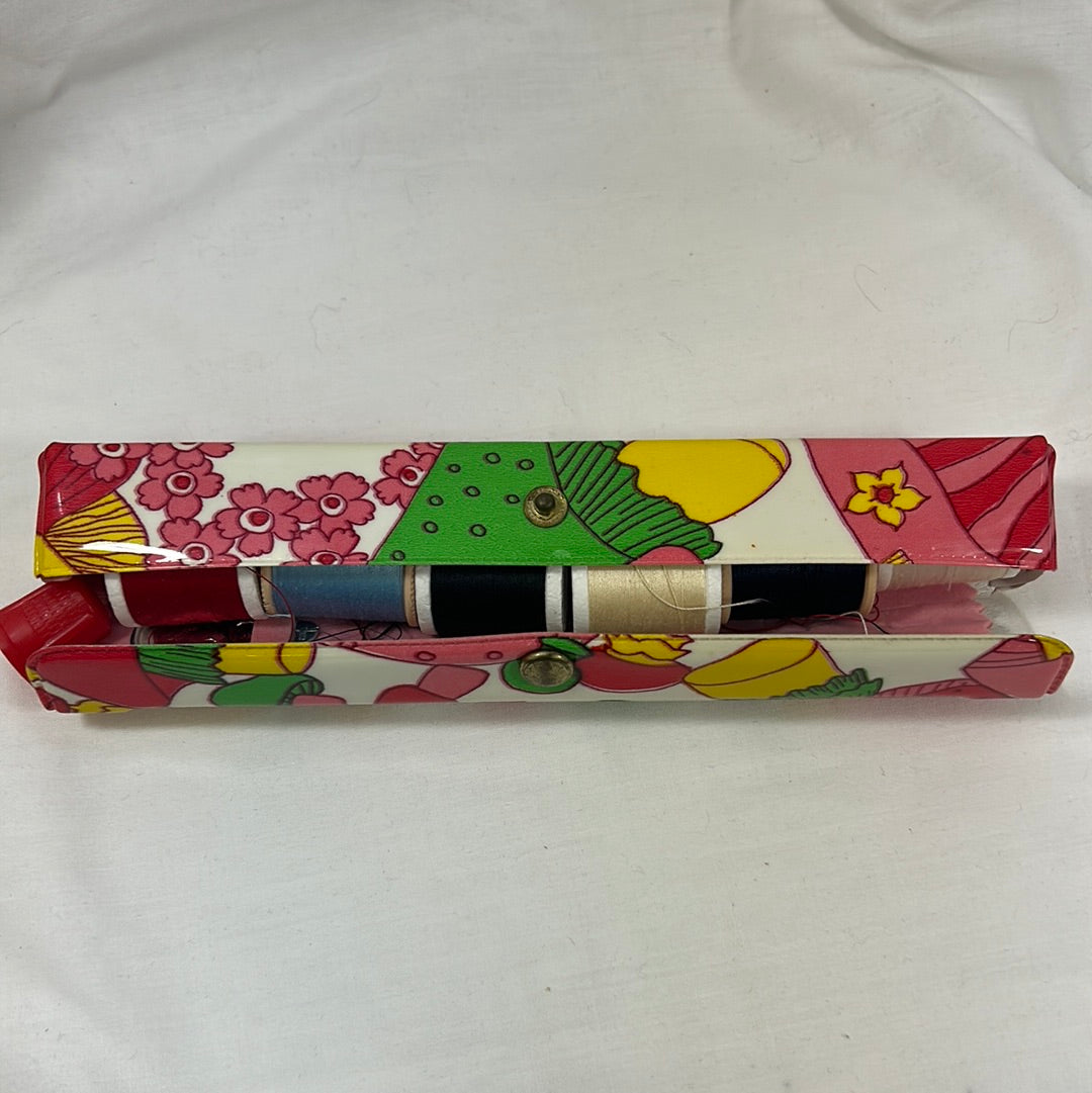Sew in style with this adorable 60’s mushroom and floral print sewing kit! Adorable vibrant colored mushrooms and flowers that pop, with slightly aged hardware. Includes needles, pins, spools of thread, and a thimble.