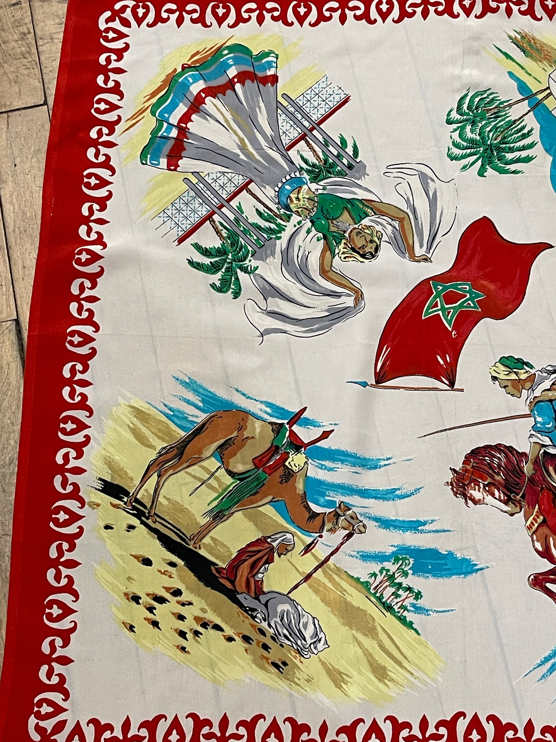Get swept away by the beauty of Morocco with our Souvenir Scarf! Featuring the iconic Morocco flag and stunning desert scenes, this scarf will add a pop of color and culture to any outfit. The bright colors and bold red border will make you stand out and inspire your inner adventurer. Perfect for any travel enthusiast or as a unique souvenir from your trip.