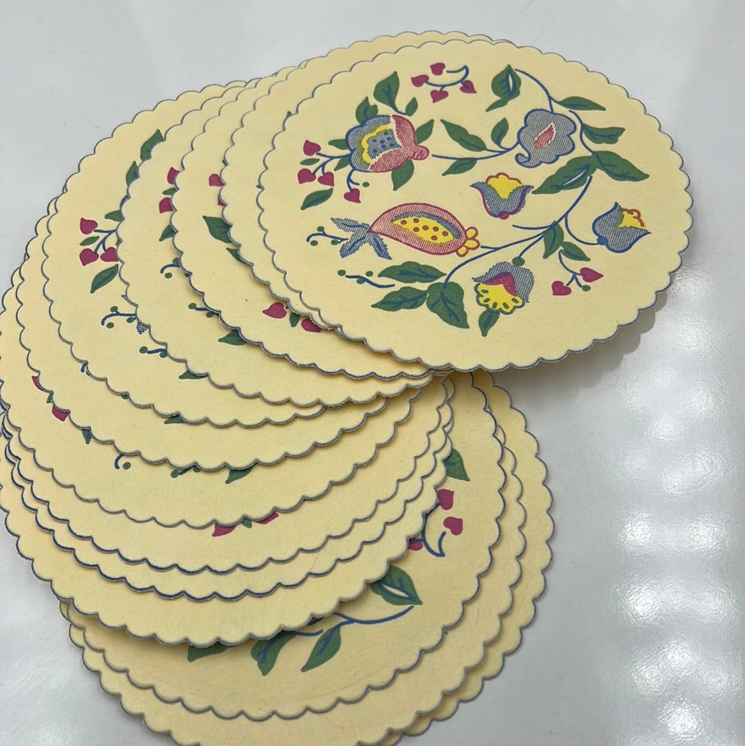 13 round paper coasters with a scalloped edge and a pink and blue floral design.