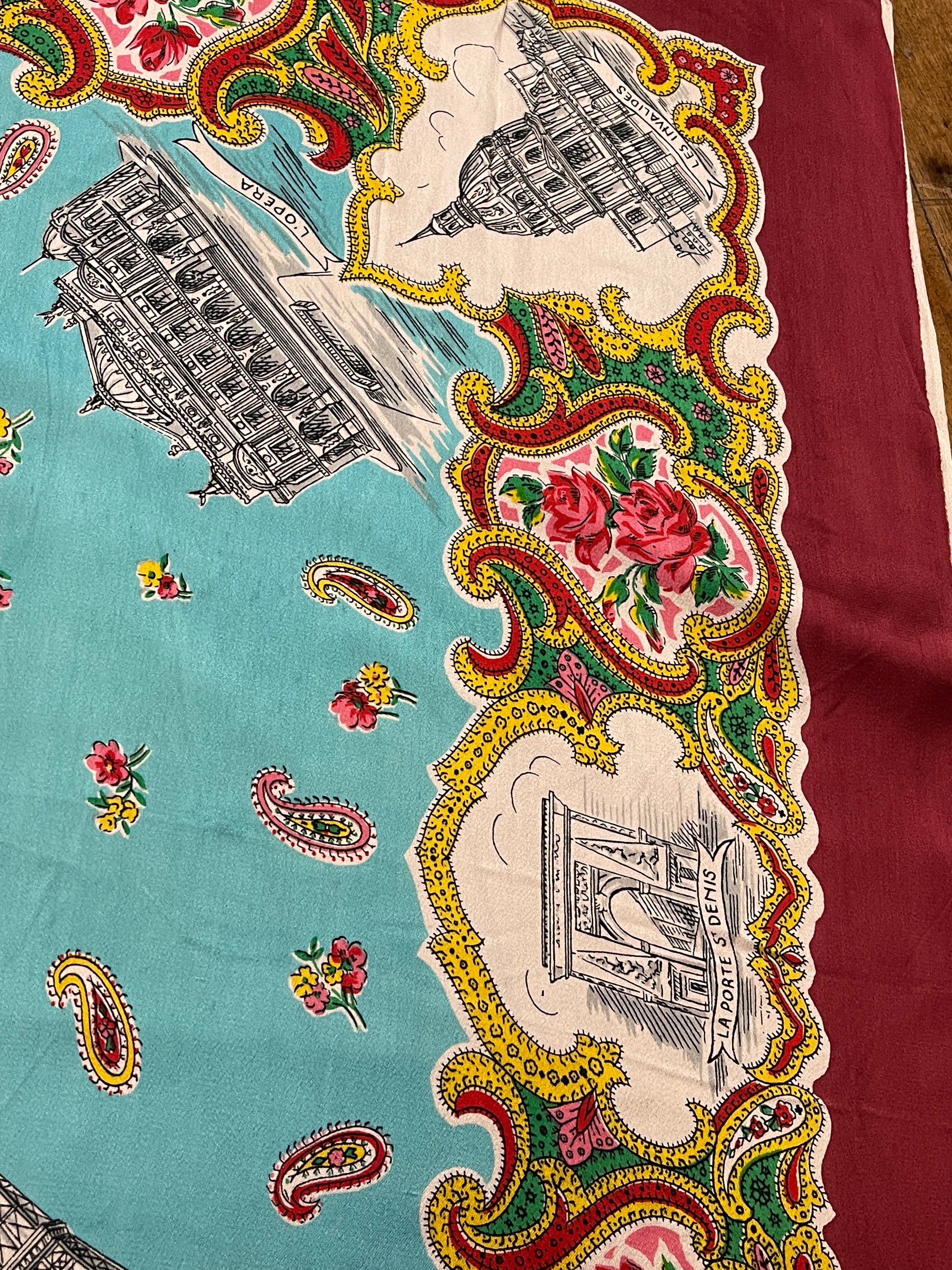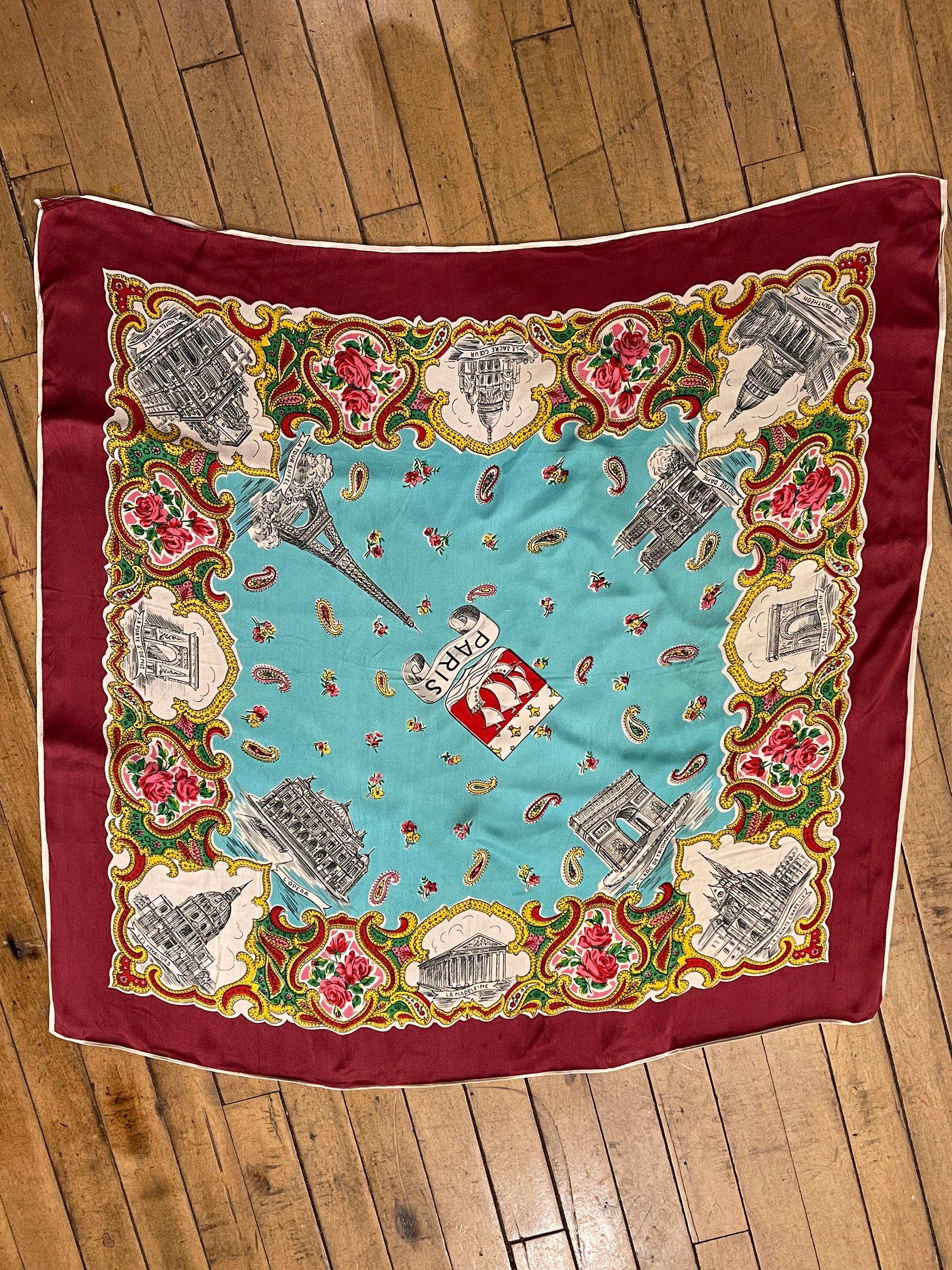 Indulge in the vibrant beauty and elegance of the Paris Souvenir Scarf. Made with luxurious silk, this scarf depicts stunning scenes of Paris, evoking a sense of nostalgia and wanderlust. Its excellent vintage condition makes it a perfect addition to any outfit. Experience the true essence of Paris with this must-have souvenir!