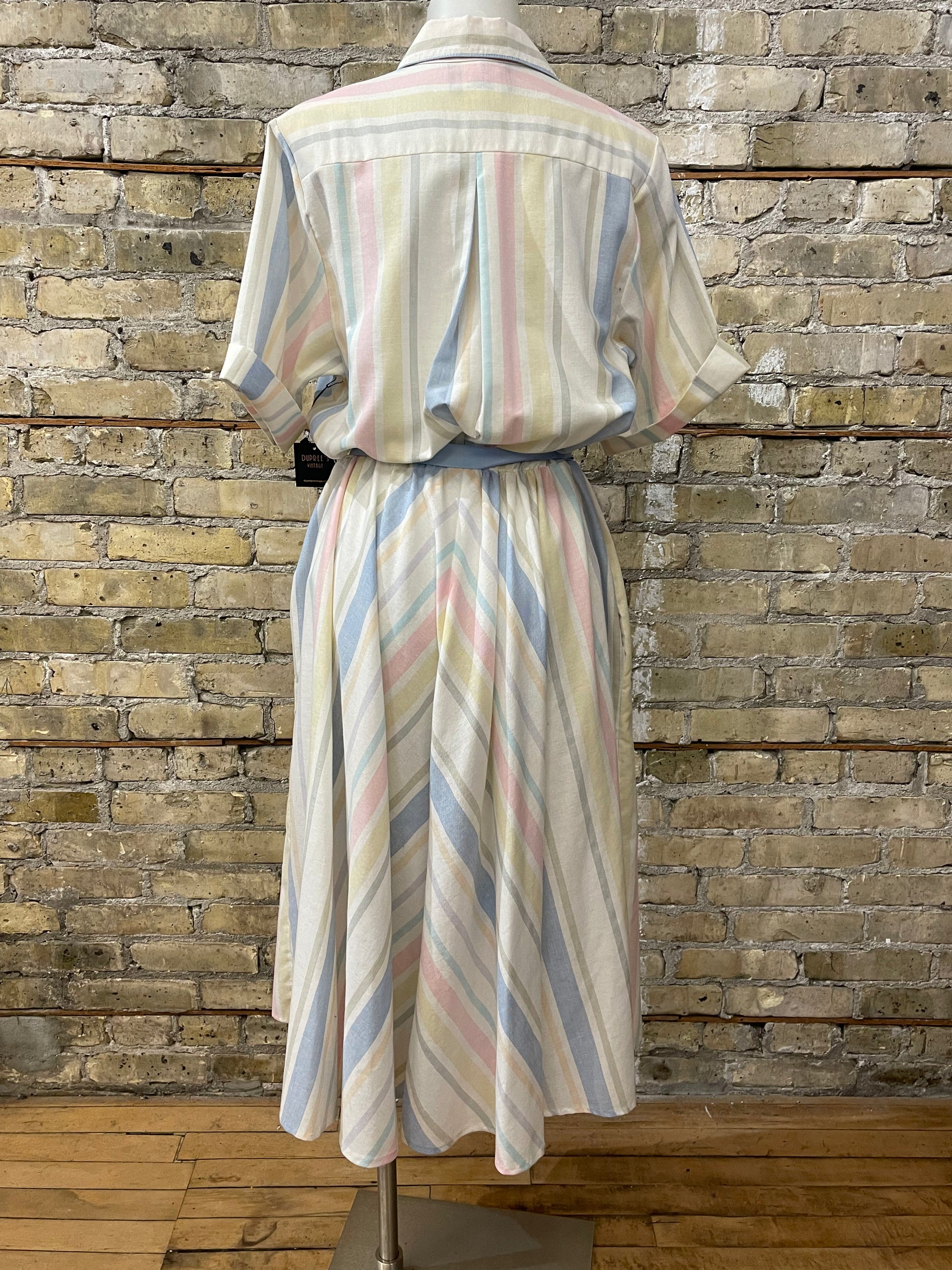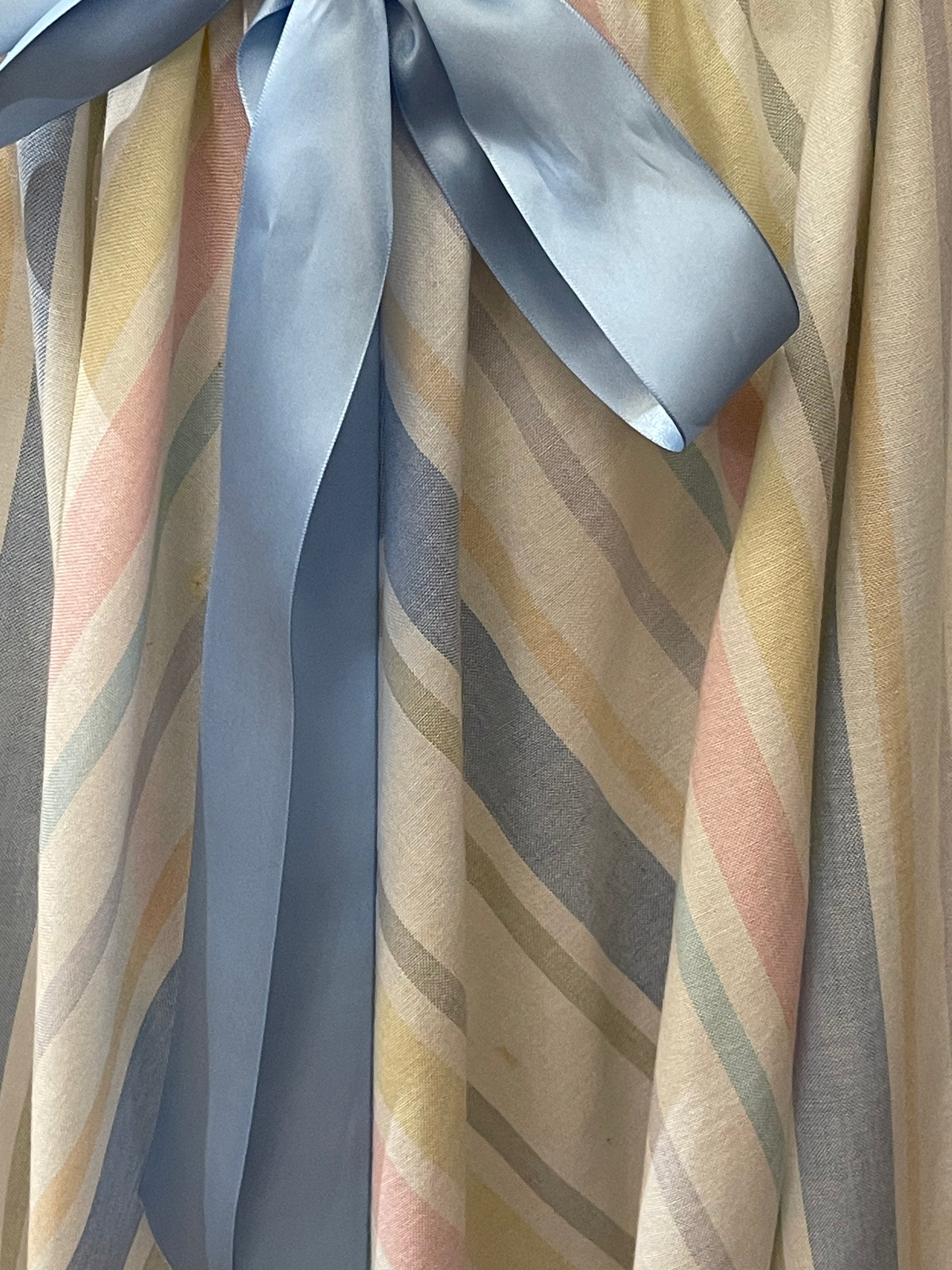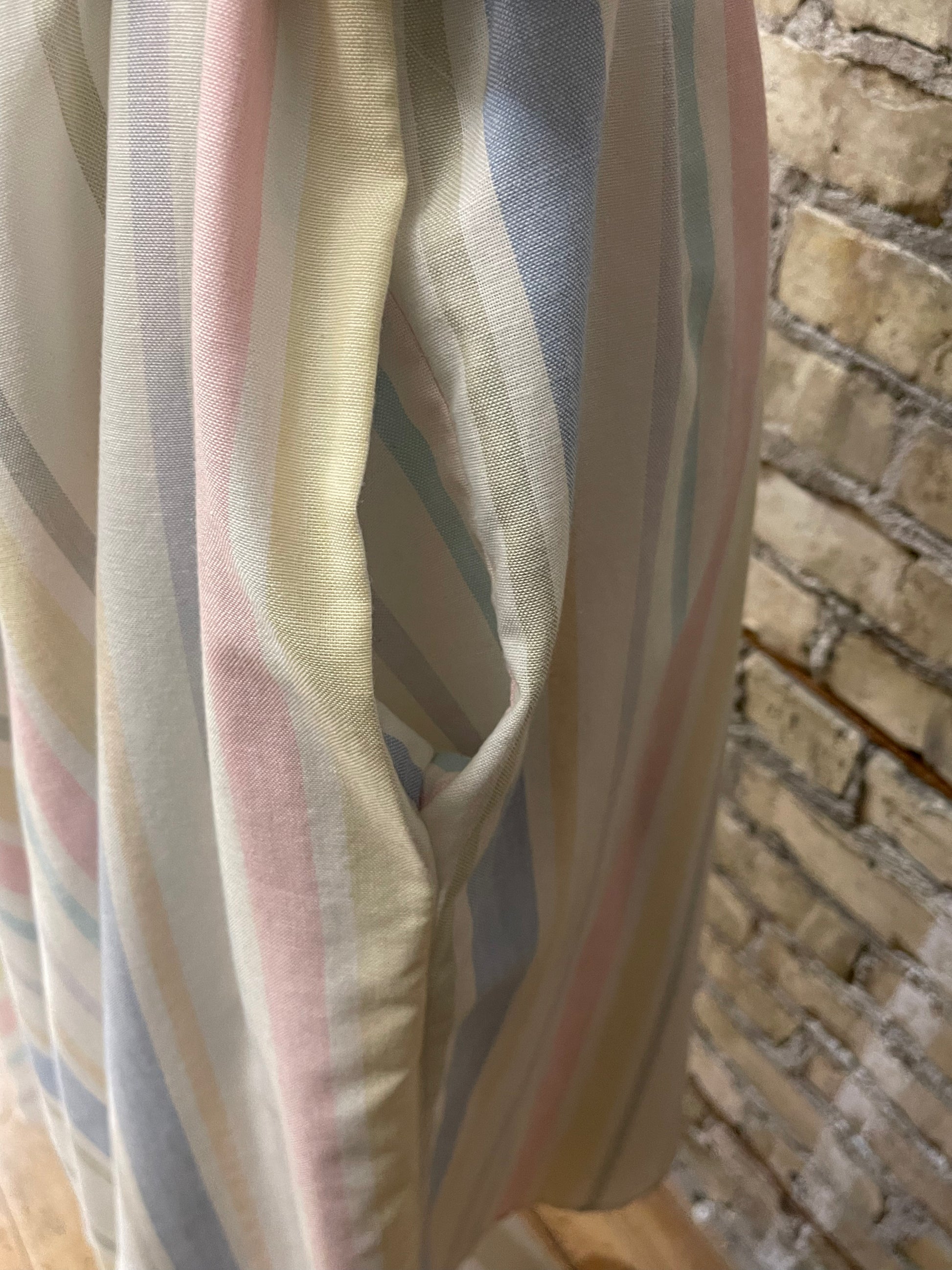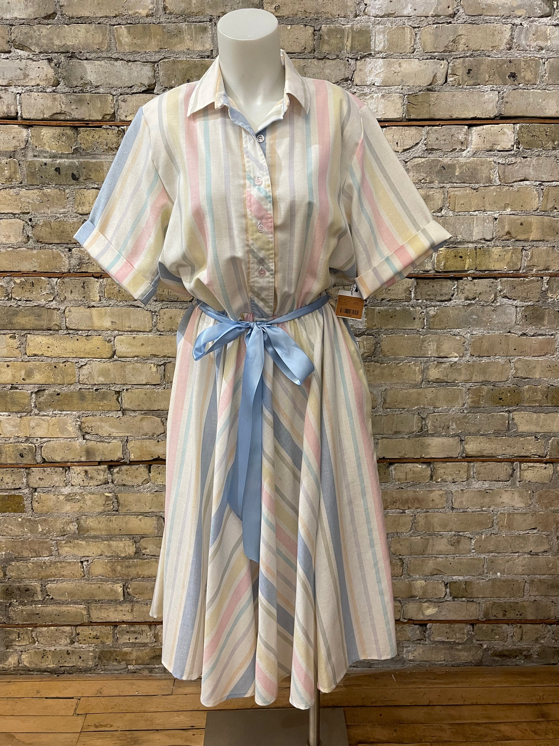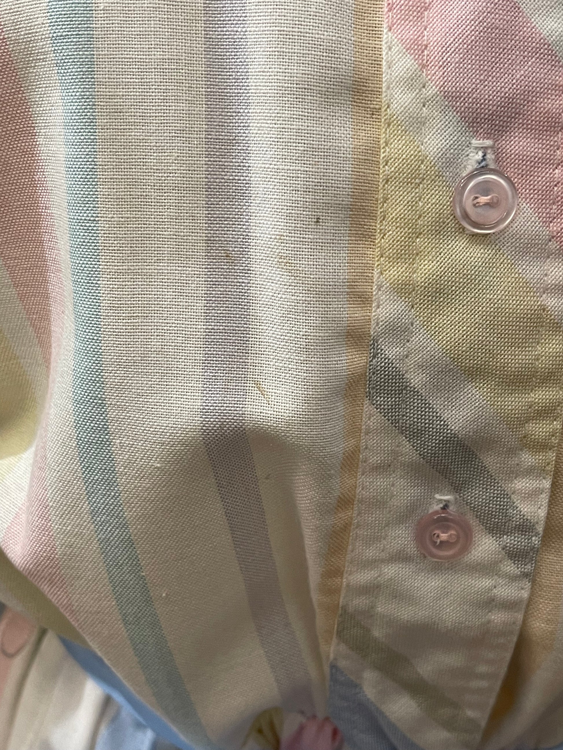 "Add a pop of pastel fun to your wardrobe with this 80s-inspired dress! Featuring a ribbon belt, summery style, and convenient pockets, this dress is perfect for any occasion. Plus, its unique volup sizing ensures a flattering fit. (Note: Small stain near buttons adds character and stories for future wear!)"