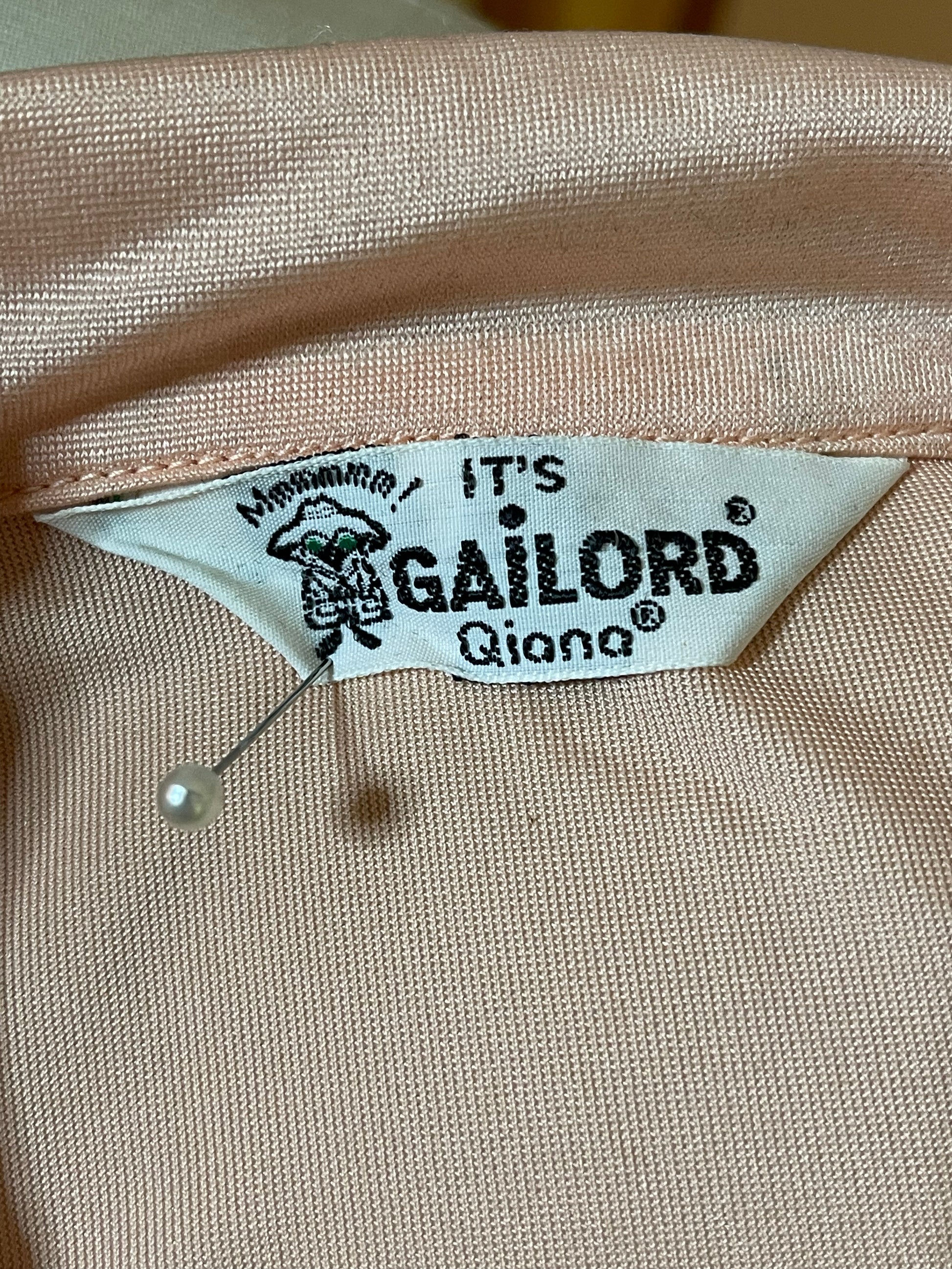 This is a lightweight polyester peach colored blouse. Labeled It’s Gailord and in excellent vintage condition.